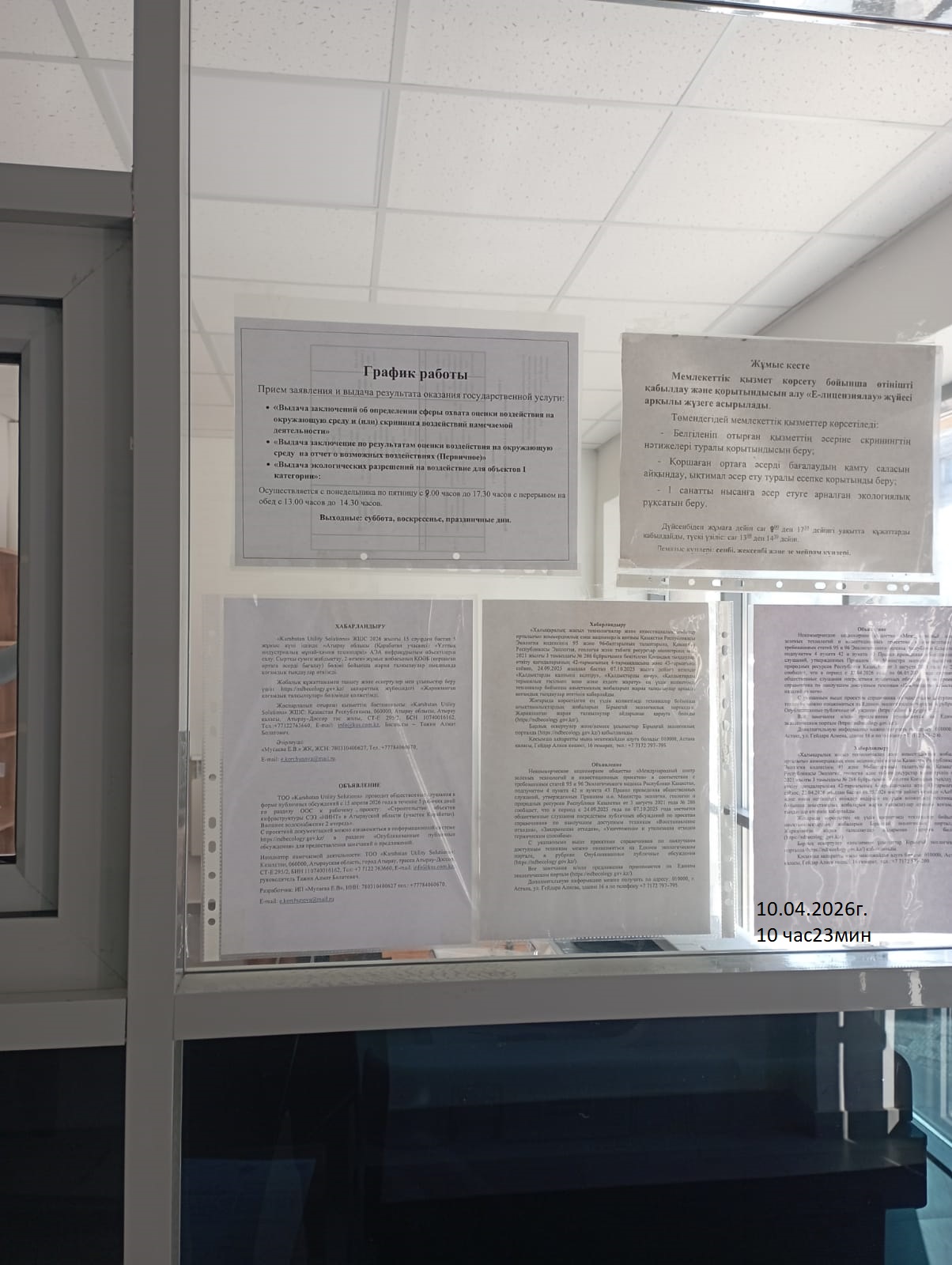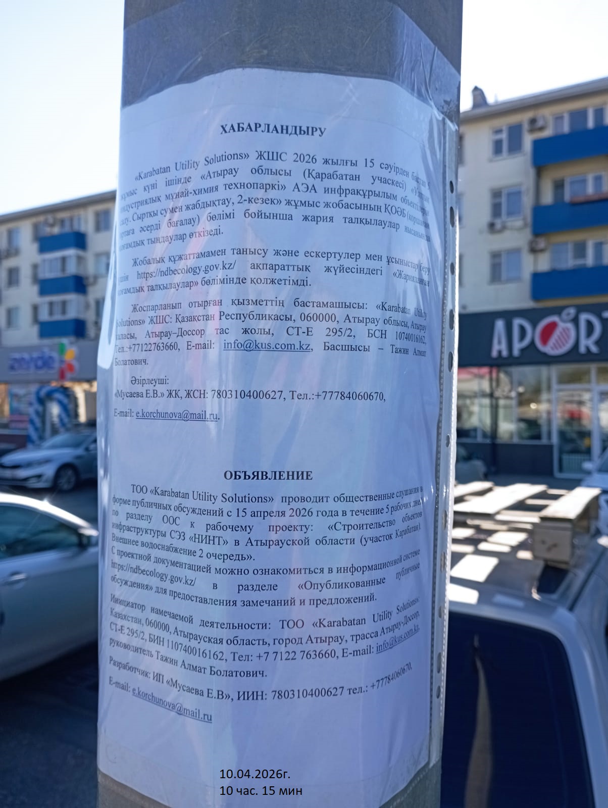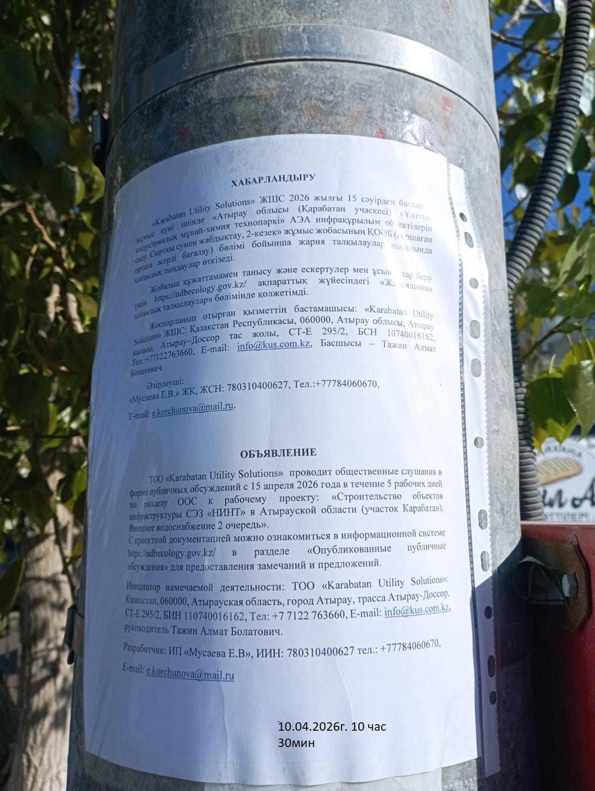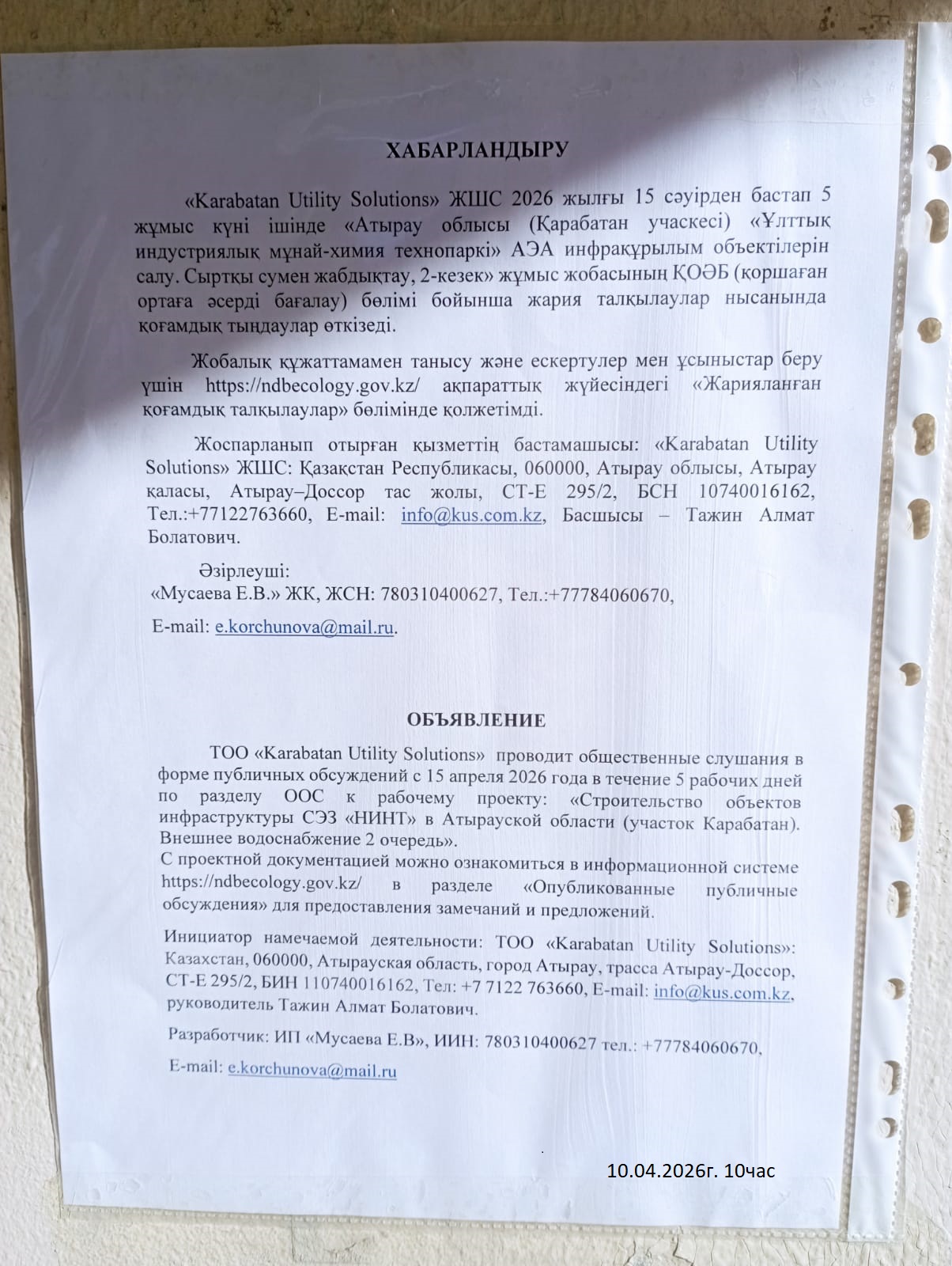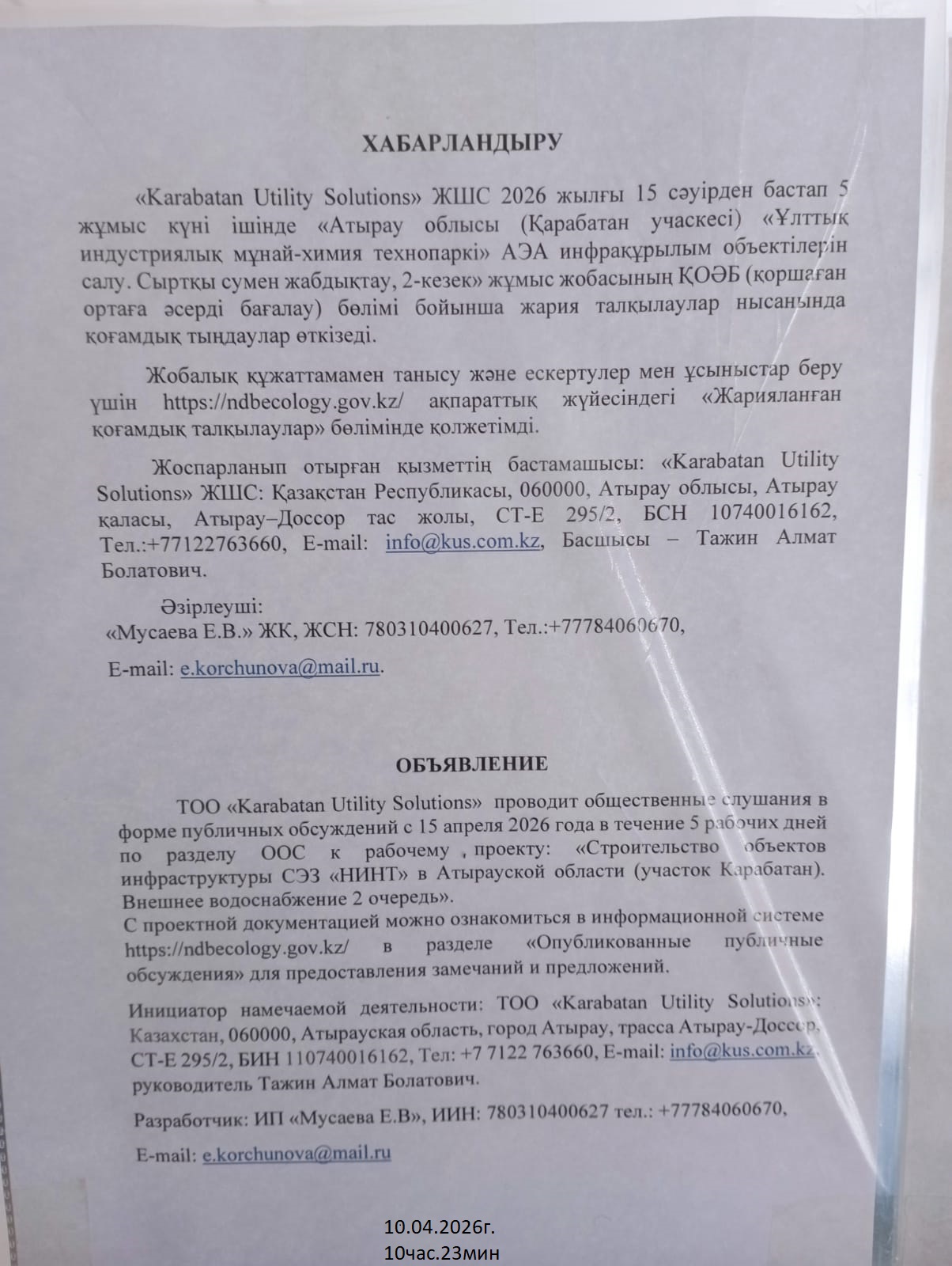По проекту: Раздел ООС к рабочему проекту: «Строительство объектов инфраструктуры СЭЗ «НИНТ» в Атырауской области (участок Карабатан). Внешнее водоснабжение 2 очередь».