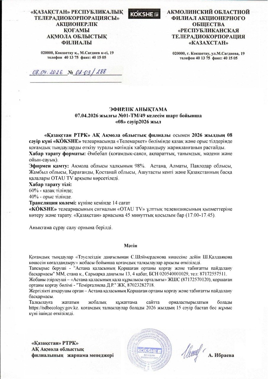 1. Инициатор: Государственное учреждение ""Управление охраны окружающей среды и природопользования города Астаны""
