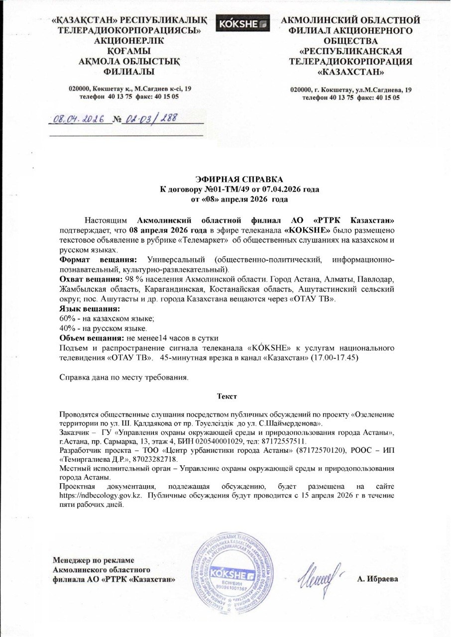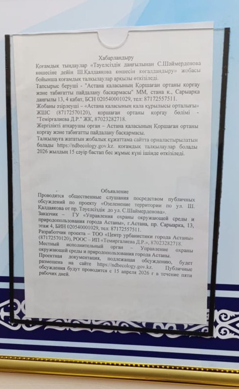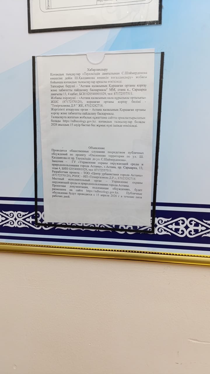 По проекту: «Озеленение территории по ул. Ш. Қалдаякова от пр. Тəуелсіздік до ул. С.Шаймерденова»