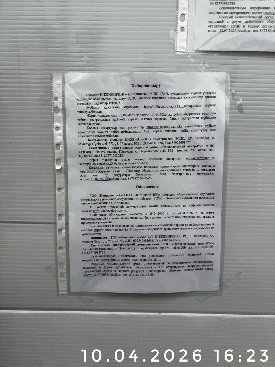 По проекту: РАЗДЕЛ «ОХРАНА ОКРУЖАЮЩЕЙ СРЕДЫ» (РООС) «Отопление модульной котельной жилых помещений в с. Иртышск»