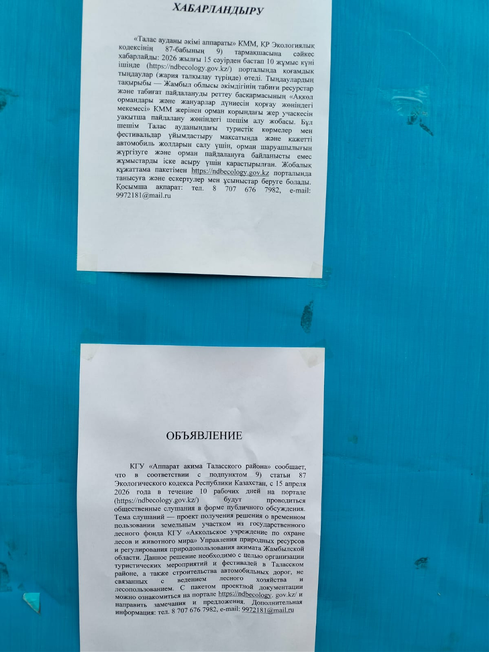 По проекту: проект получения решения о временном пользовании земельного участка из государственного лесного фонда КГУ «Аккольское учреждение по охране лесов и животного мира» Управления природных ресурсов и регулирования природопользования акимата Жамбылской области.