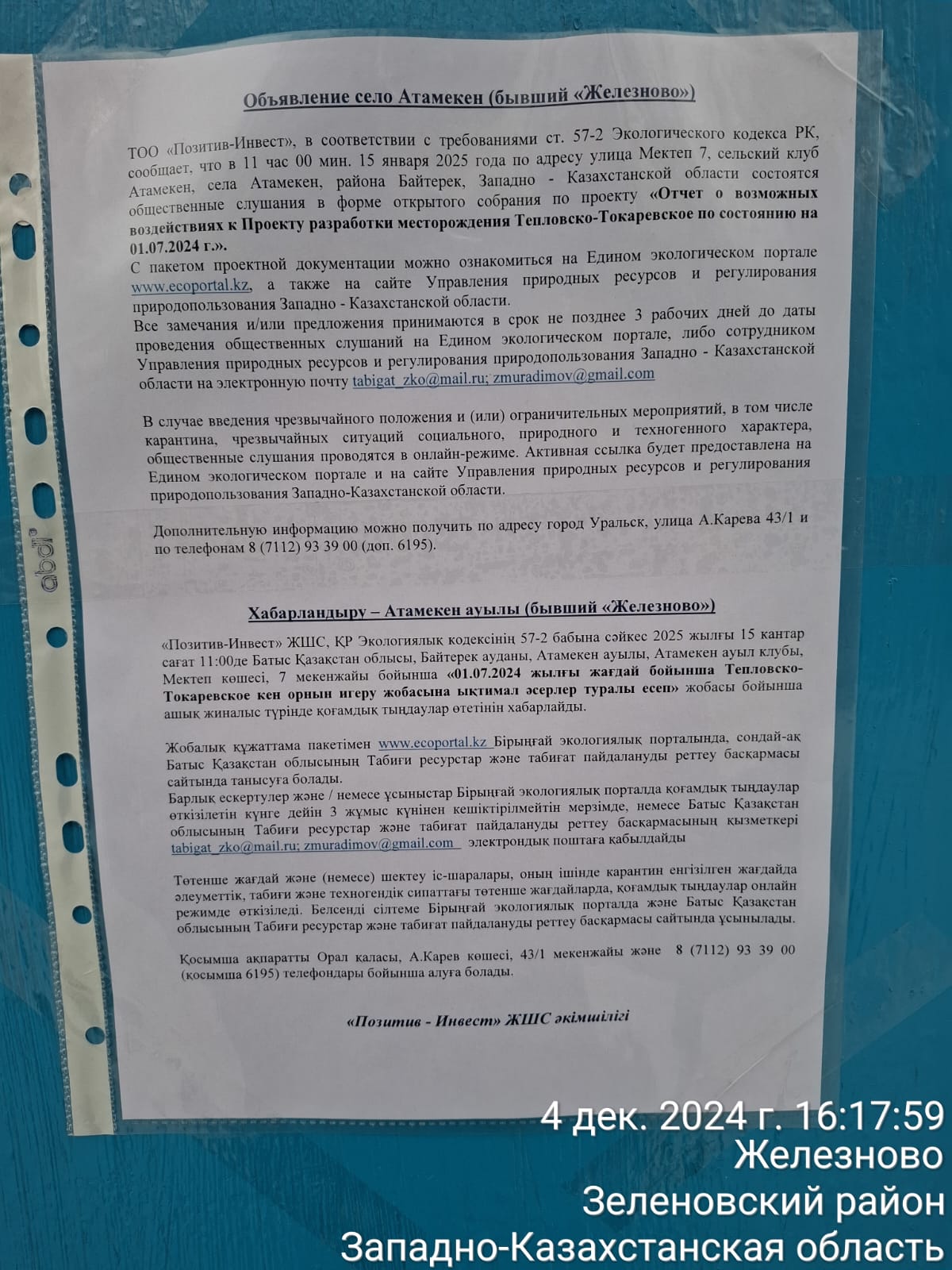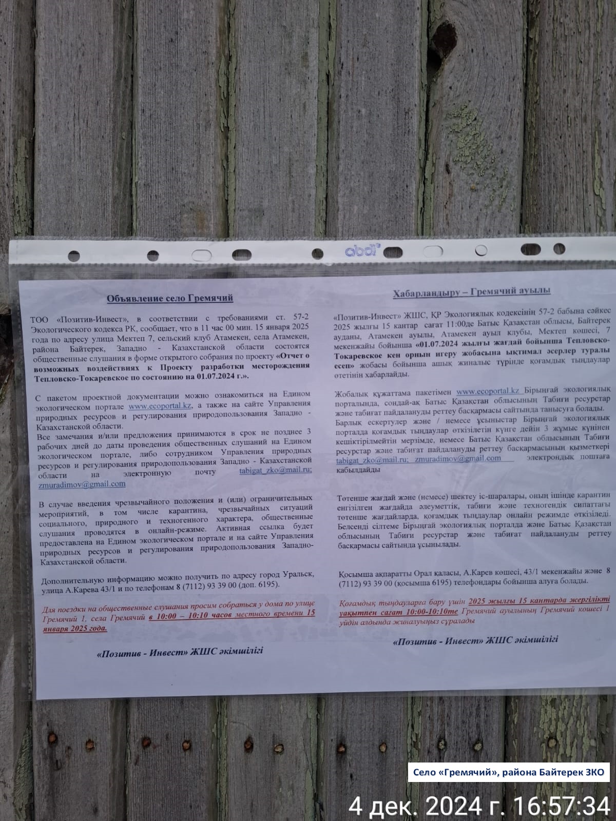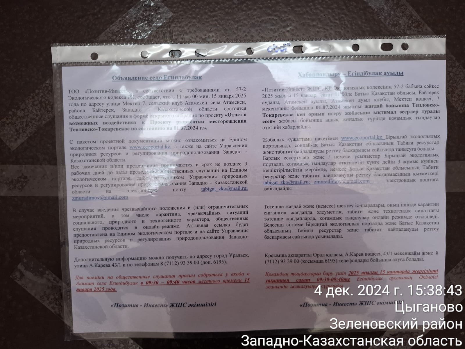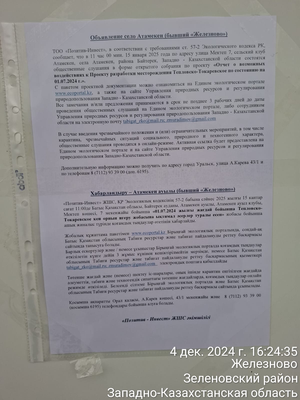 3. Общественные слушания организованны: Управление природных ресурсов и регулирования природопользования Западно-Казахстанской области, zh.koishekenova@bko.gov.kz,