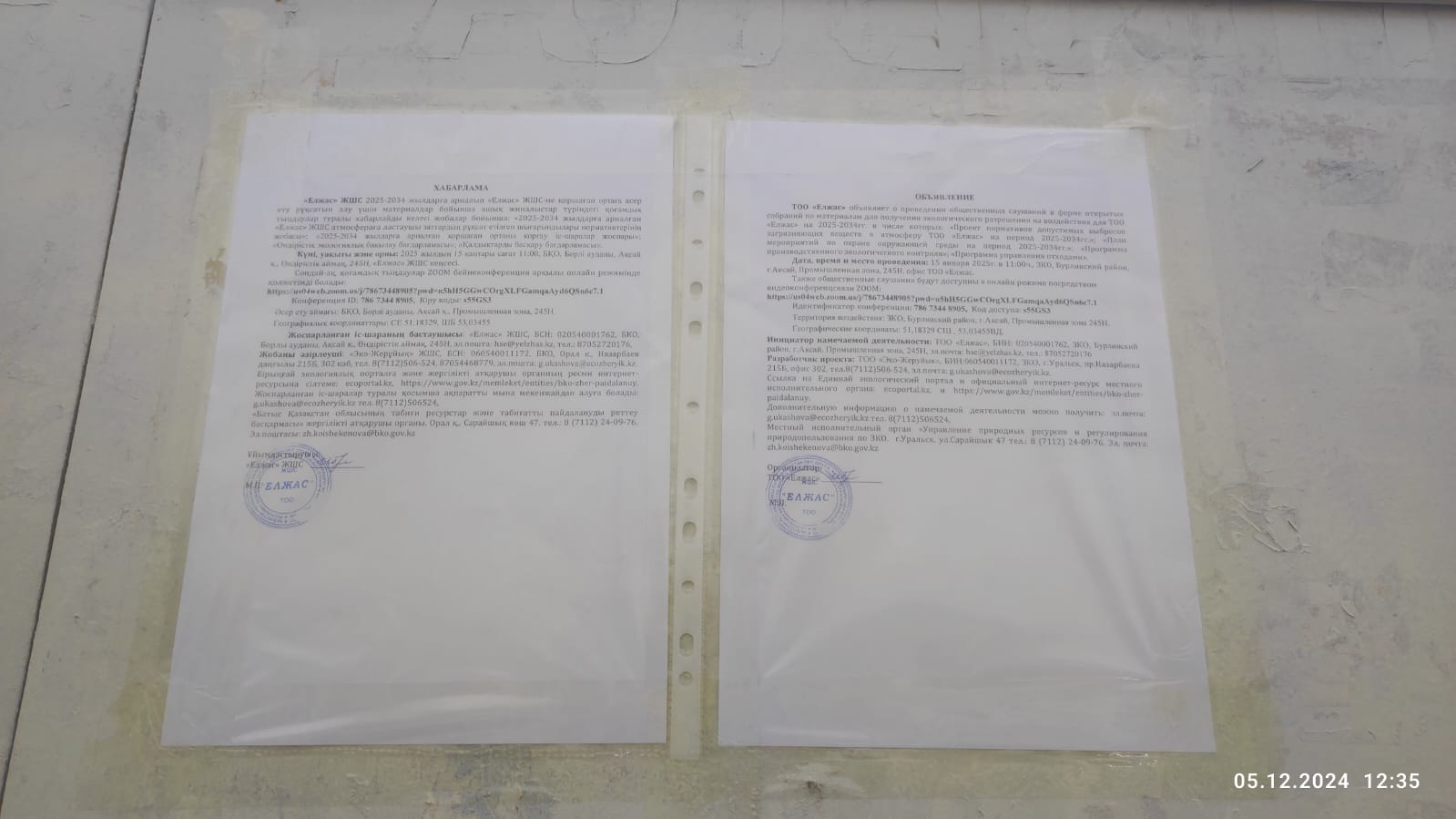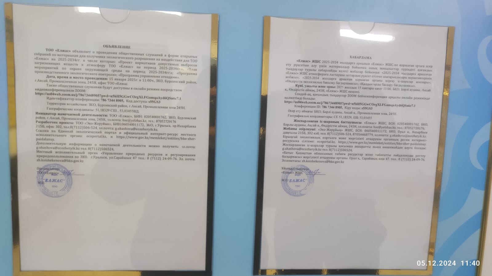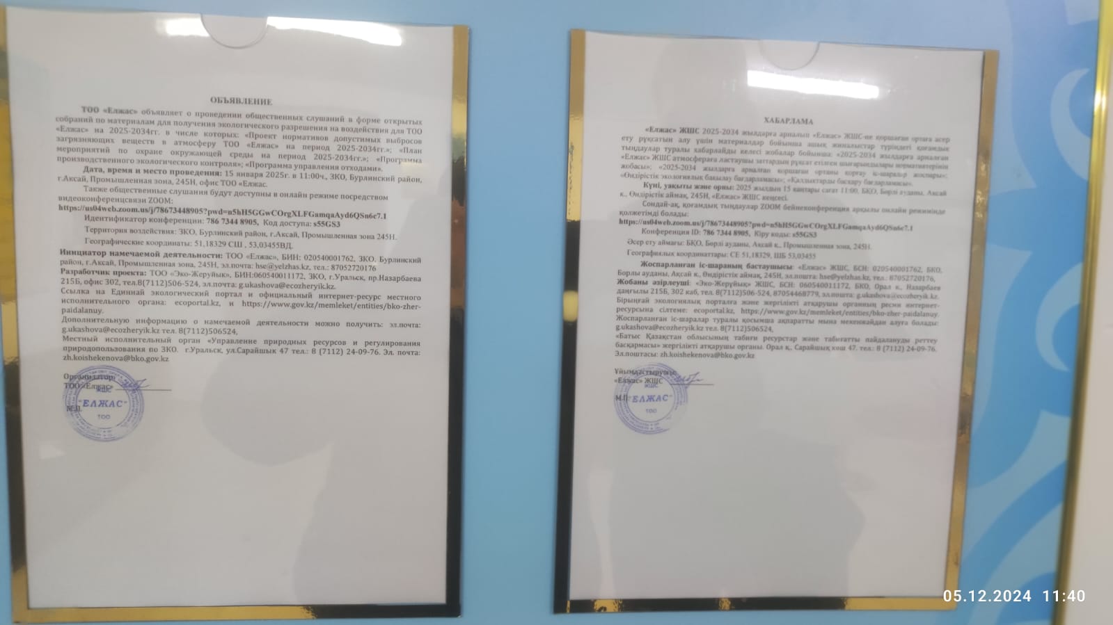 1.4. Описание для подключения к онлайн трансляции при прохождении общественного слушания: «Проект нормативов допустимых выбросов загрязняющих веществ в атмосферу ТОО «Елжас» на период 2025-2034гг.» Идентификатор конференции: 786 7344 8905 Код доступа: s55GS3