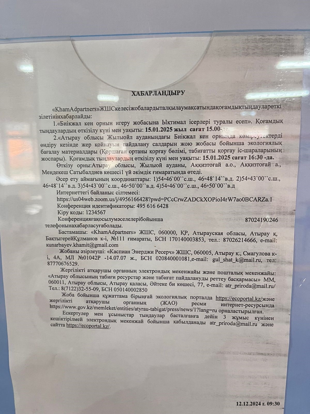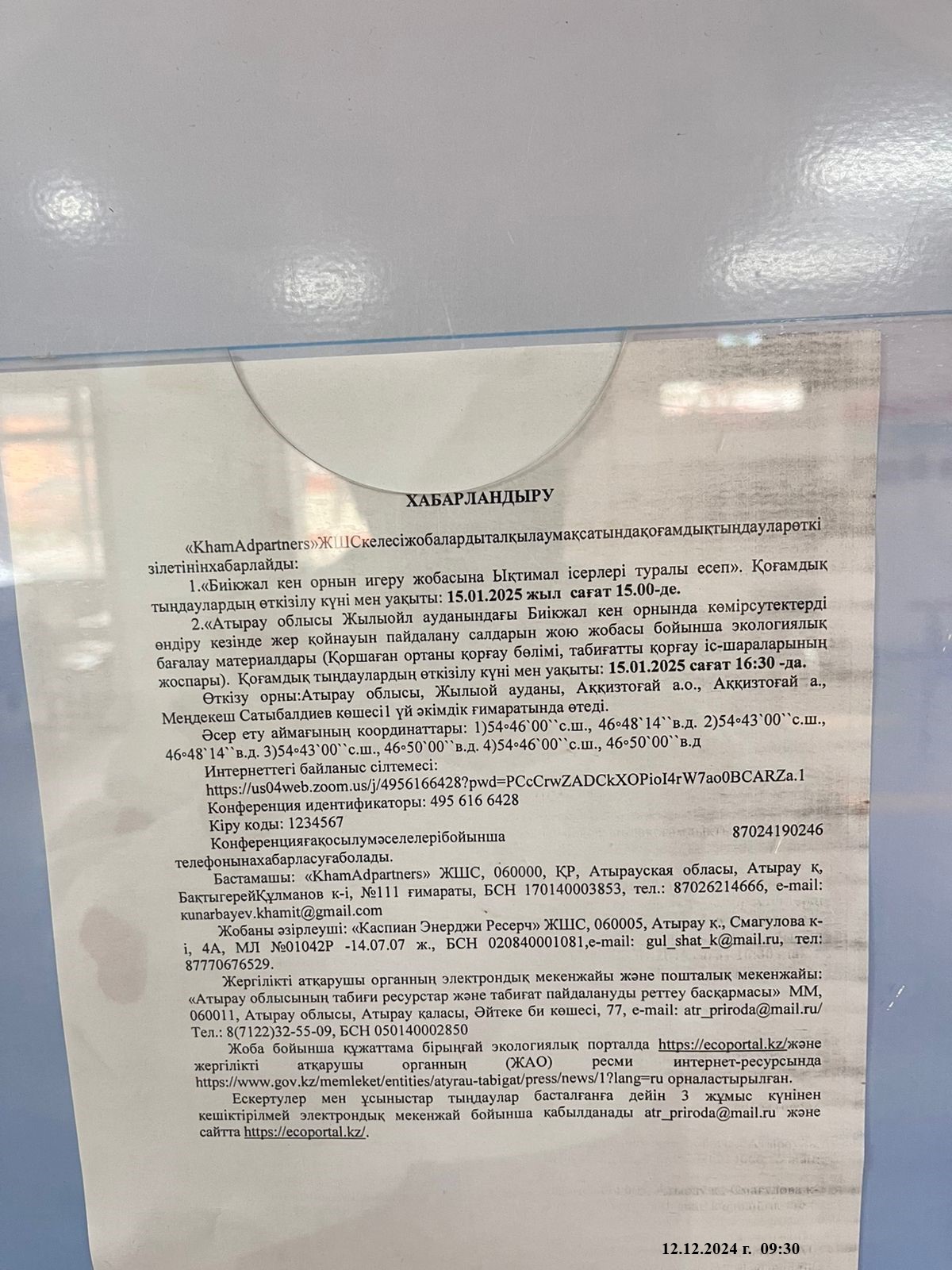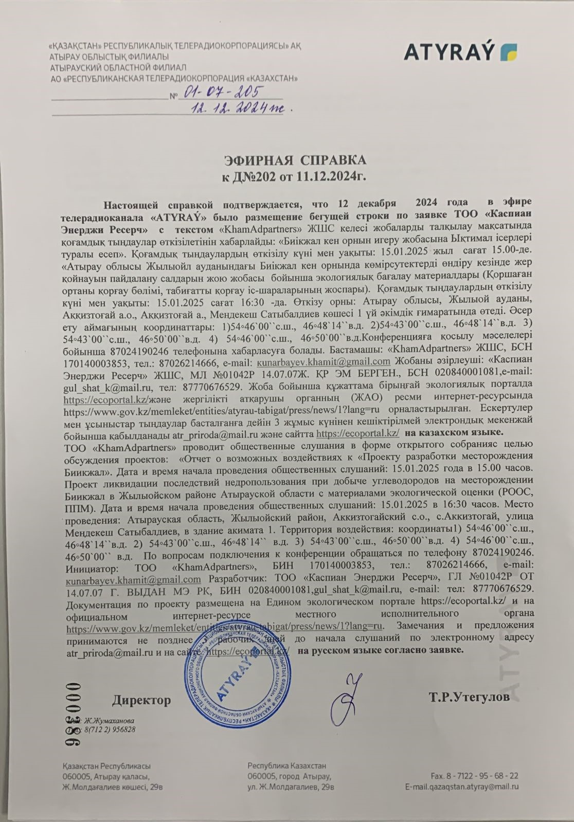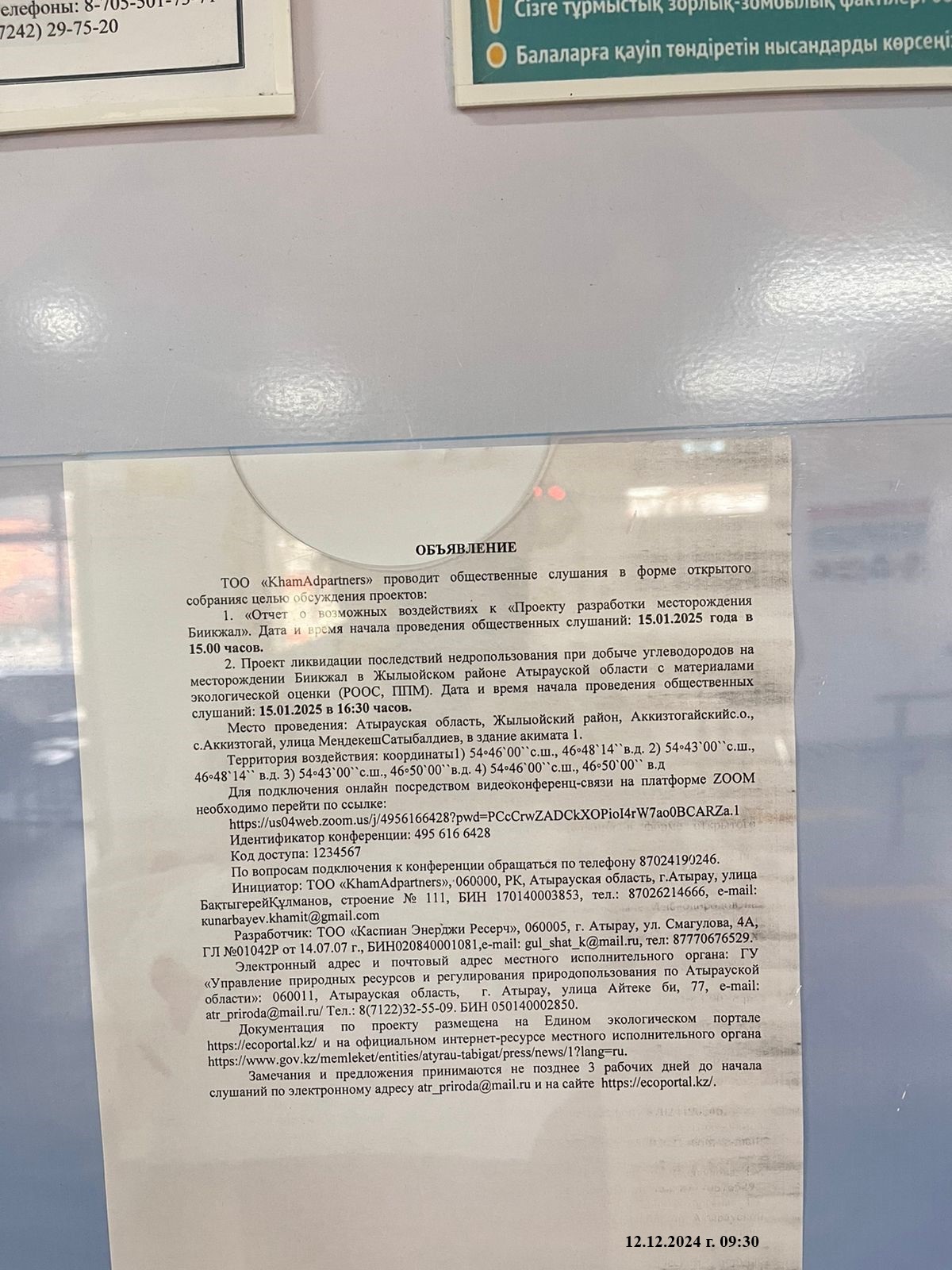 3. Общественные слушания организованны: Управление природных ресурсов и регулирования природопользования Атырауской области, ga.arystanova@atyrau.gov.kz ,