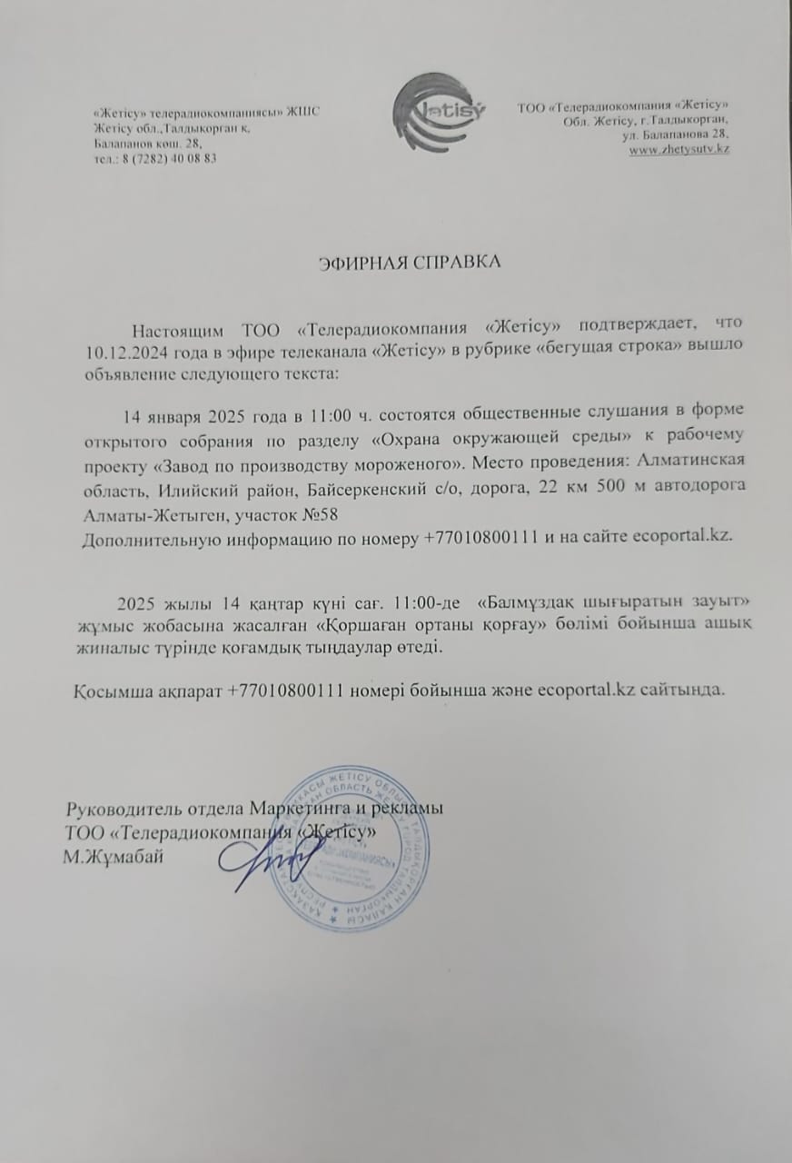 По проекту: Раздел «Охрана окружающей среды» к рабочему проекту «Завод по производству мороженого" ТОО «Шин – Лайн» расположенного по адресу: Алматинская область, Илийский район, с.о. Байсеркинский, с. Байсерке, ул. Сұлтан Бейбарыс, уч. 2 Е