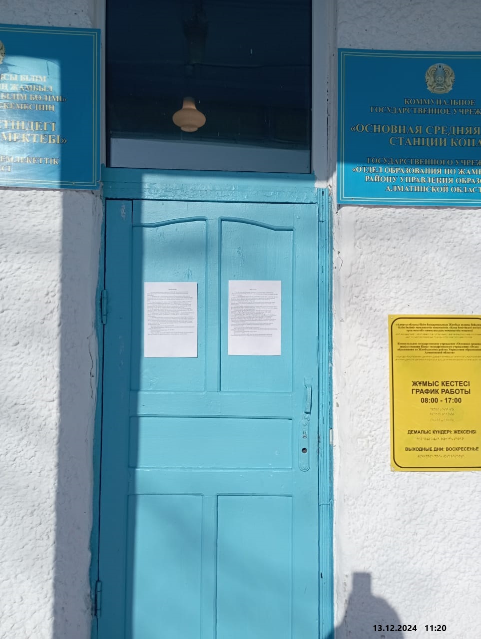 6.3. расположение мест, специально предназначенных для Размещения печатных объявлений (доски объявлений): Доска объявлений КГУ основная средняя школа станции Копа
