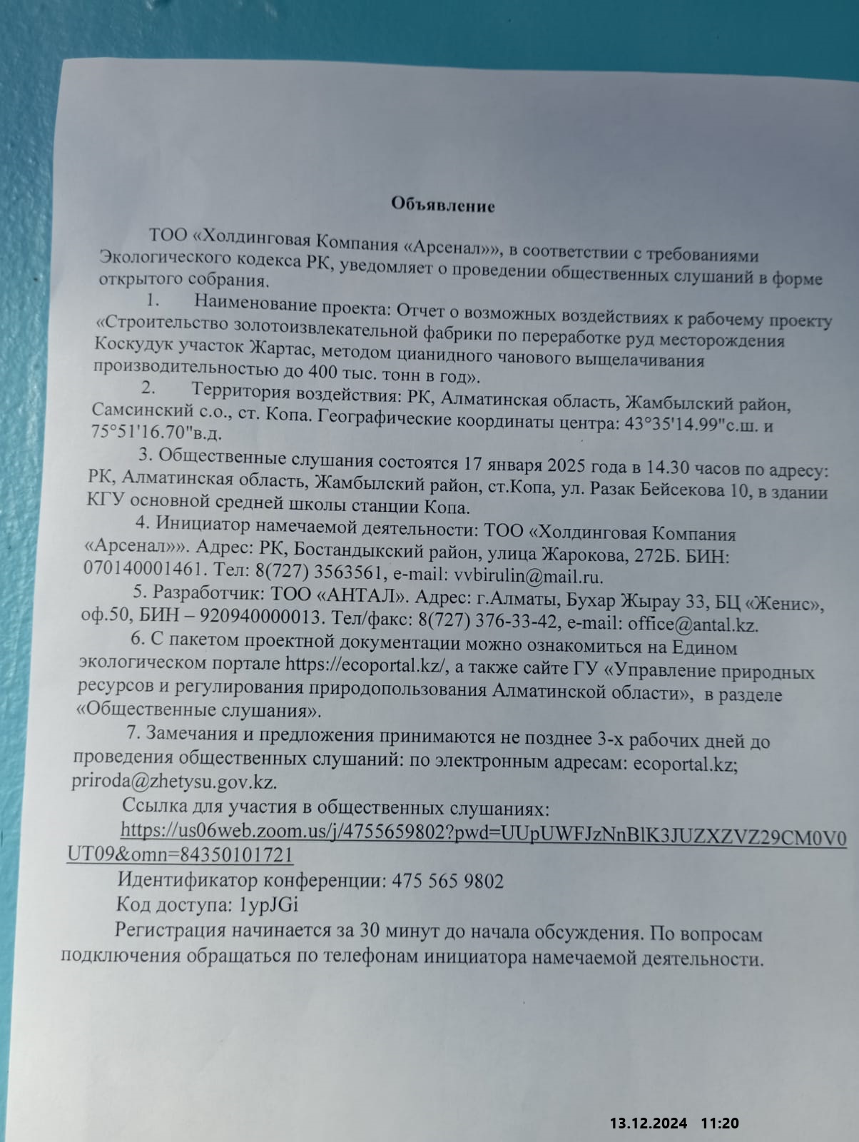 3. Общественные слушания организованны: Управление природных ресурсов и регулирования природопользования Алматинской области, 329267eco@mail.ru,
