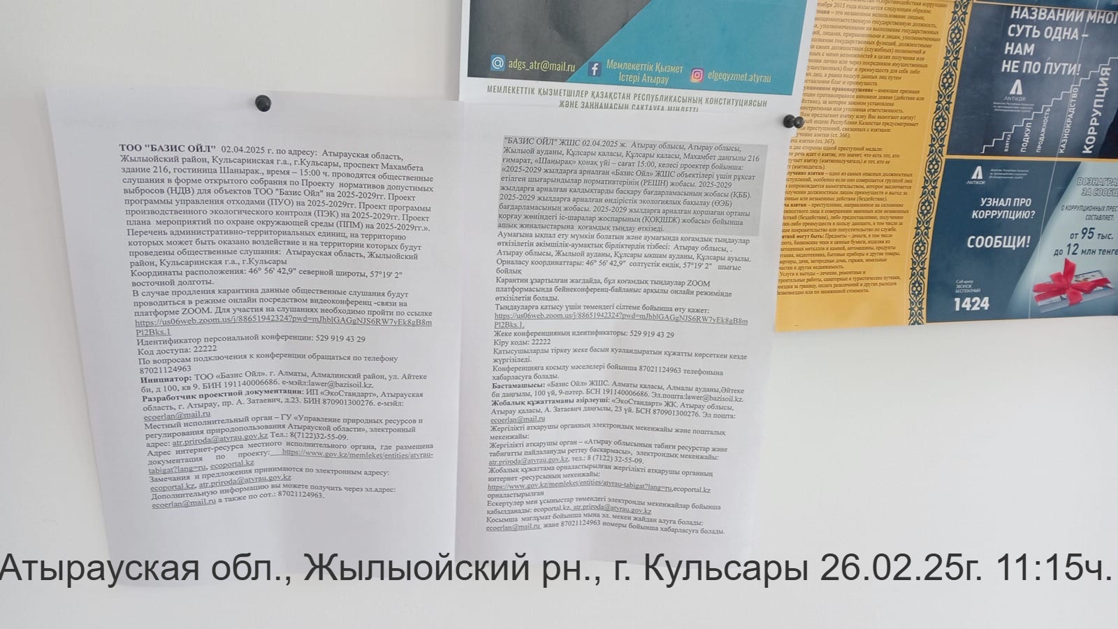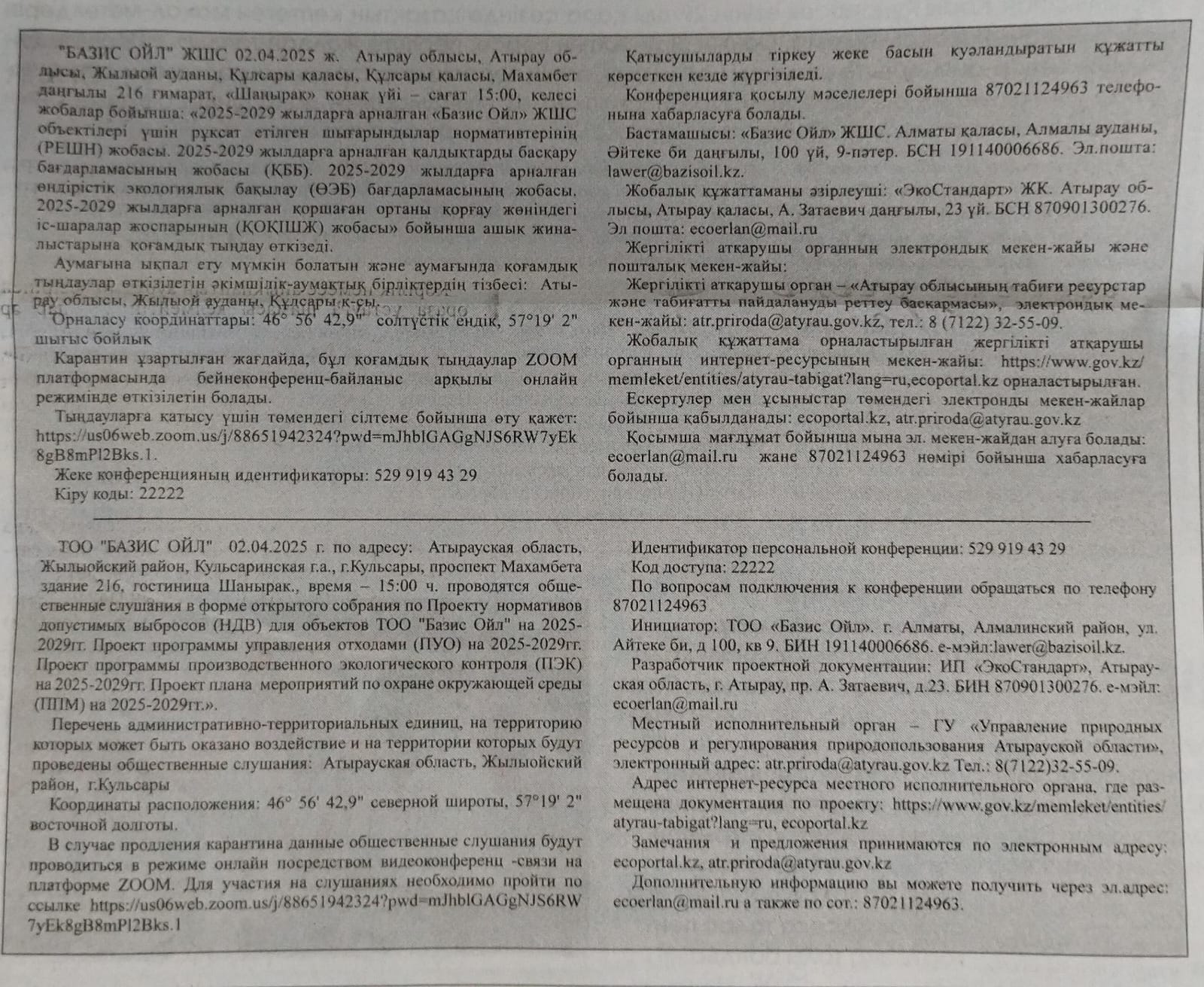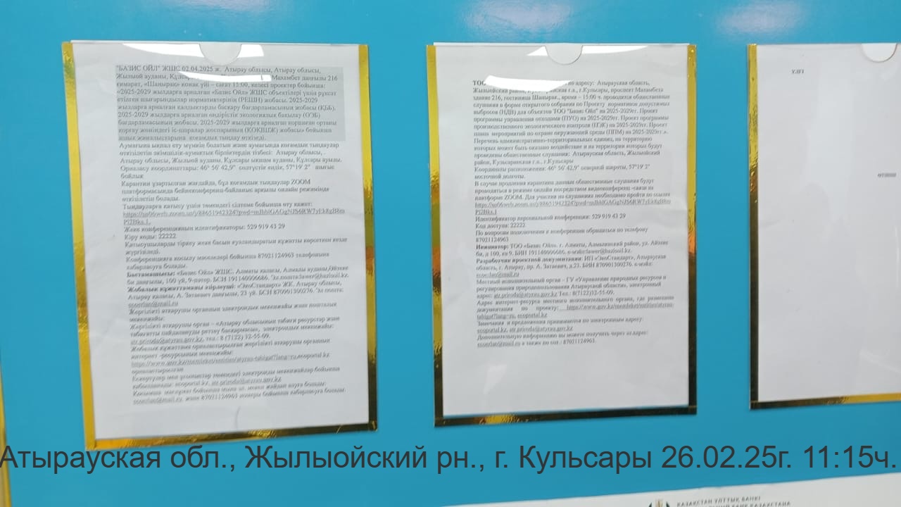 3. Общественные слушания организованны: Управление природных ресурсов и регулирования природопользования Атырауской области, ga.arystanova@atyrau.gov.kz ,