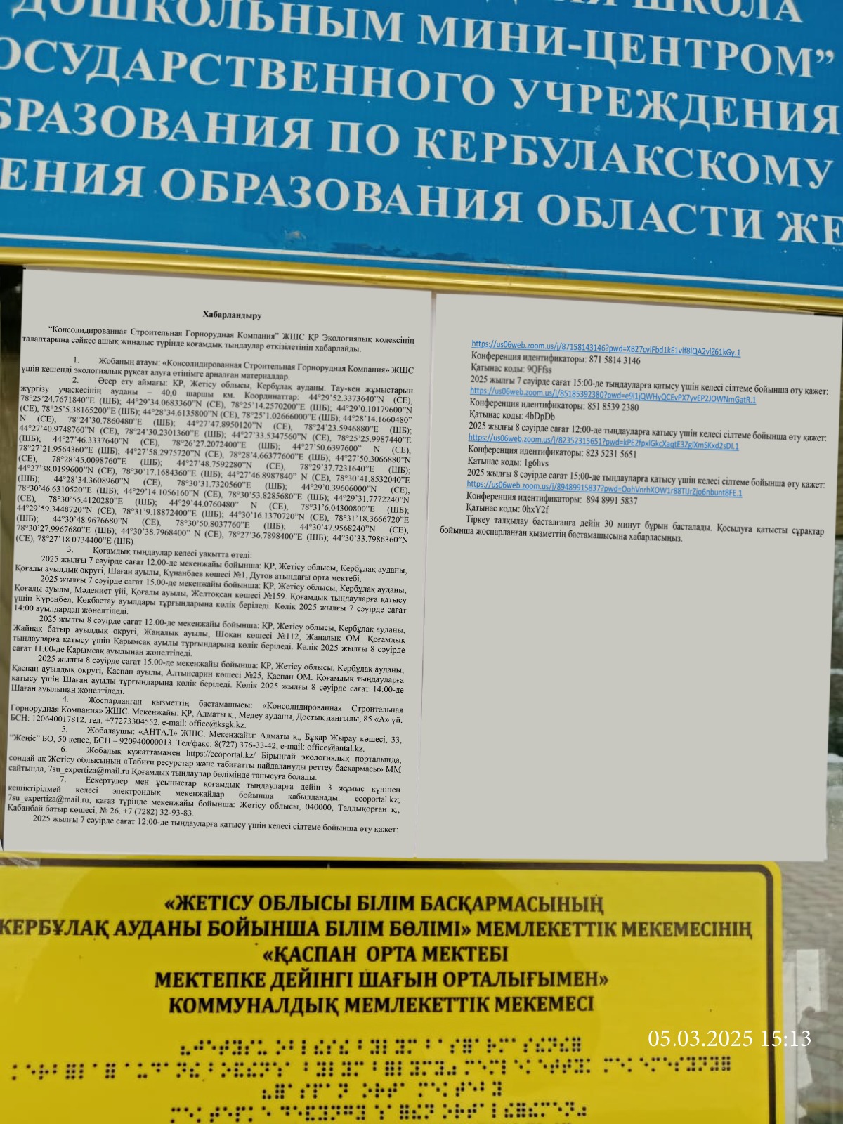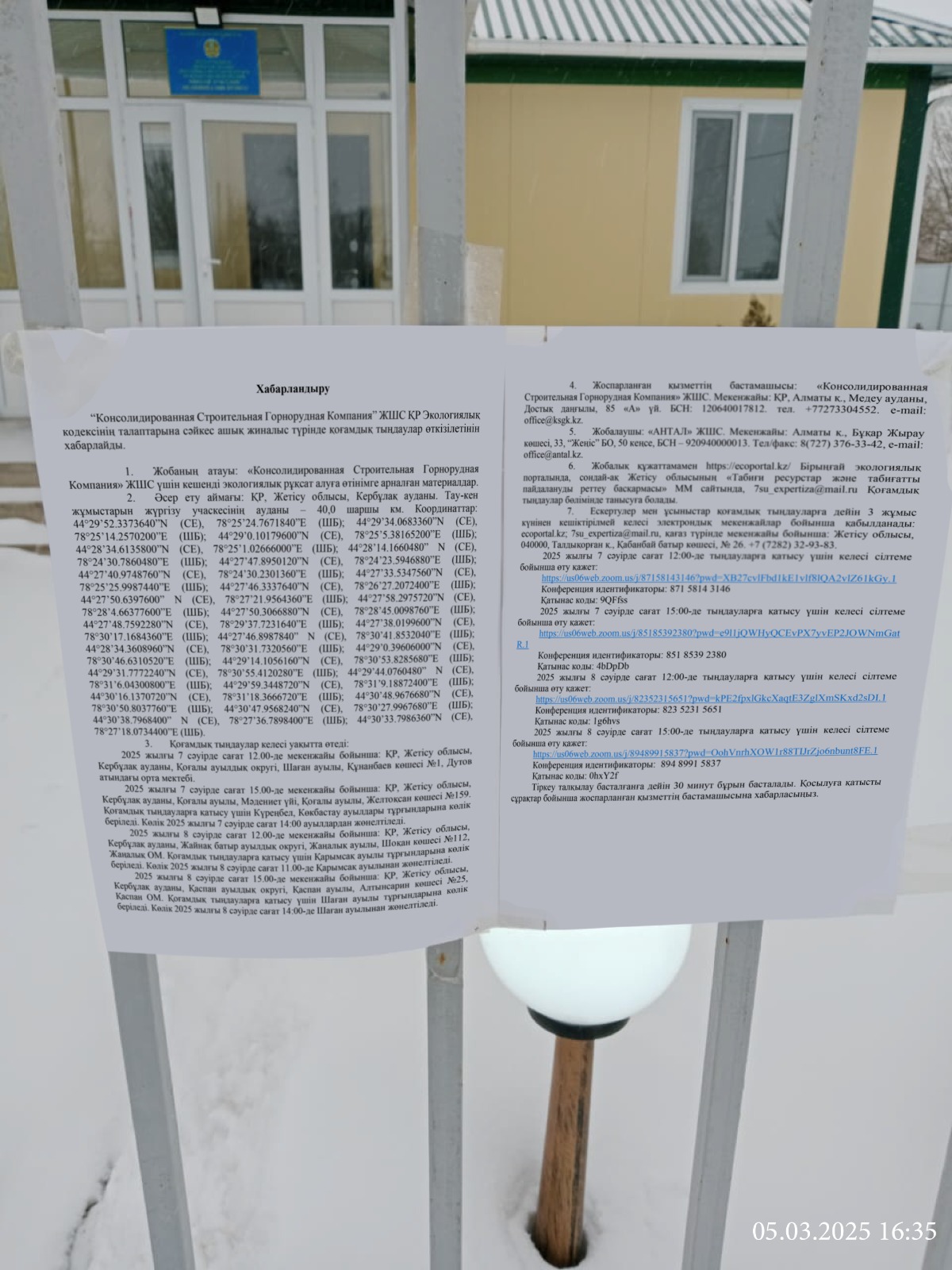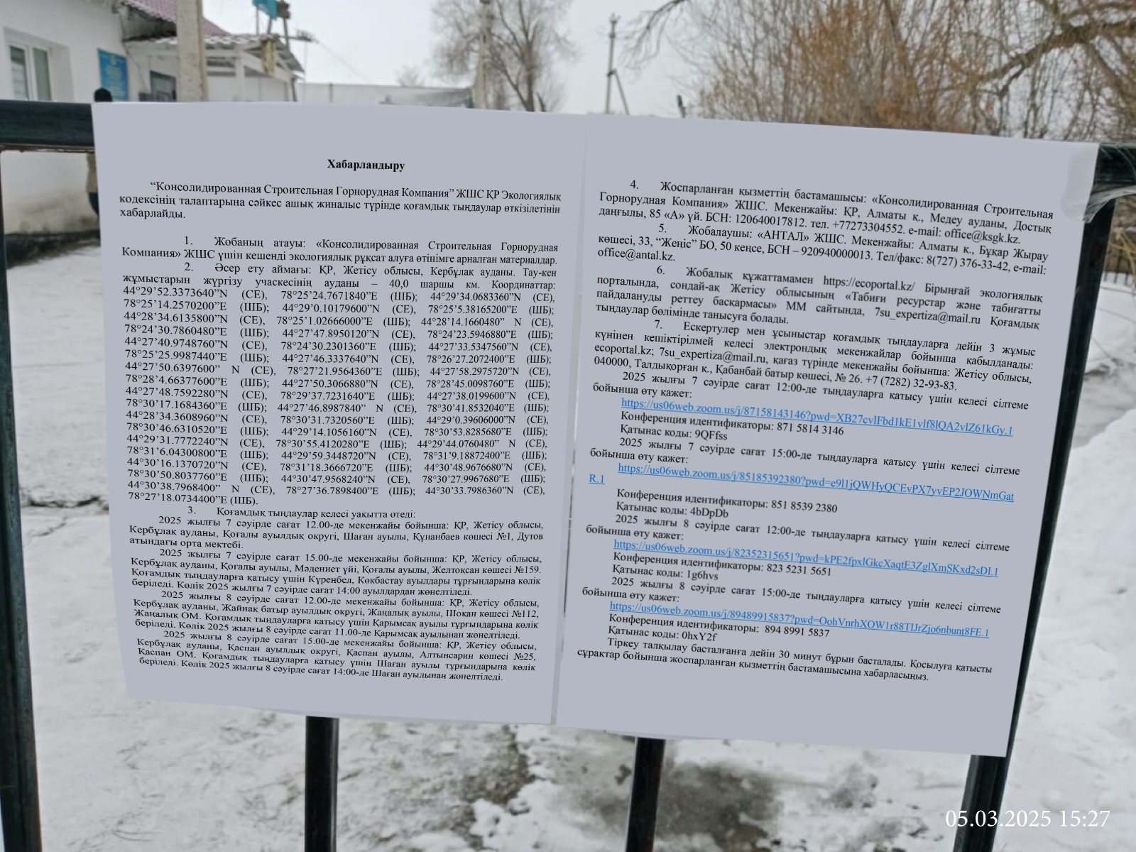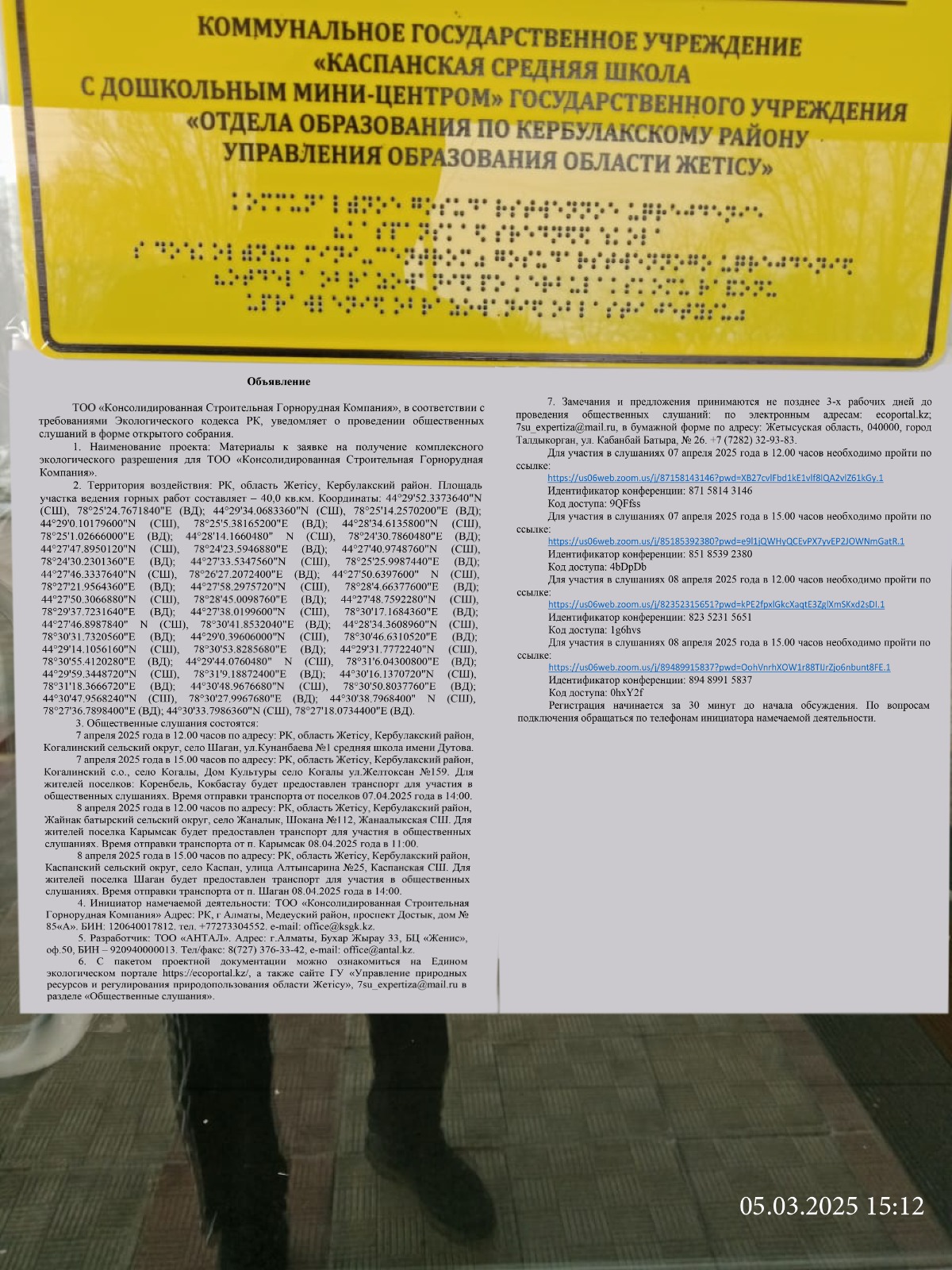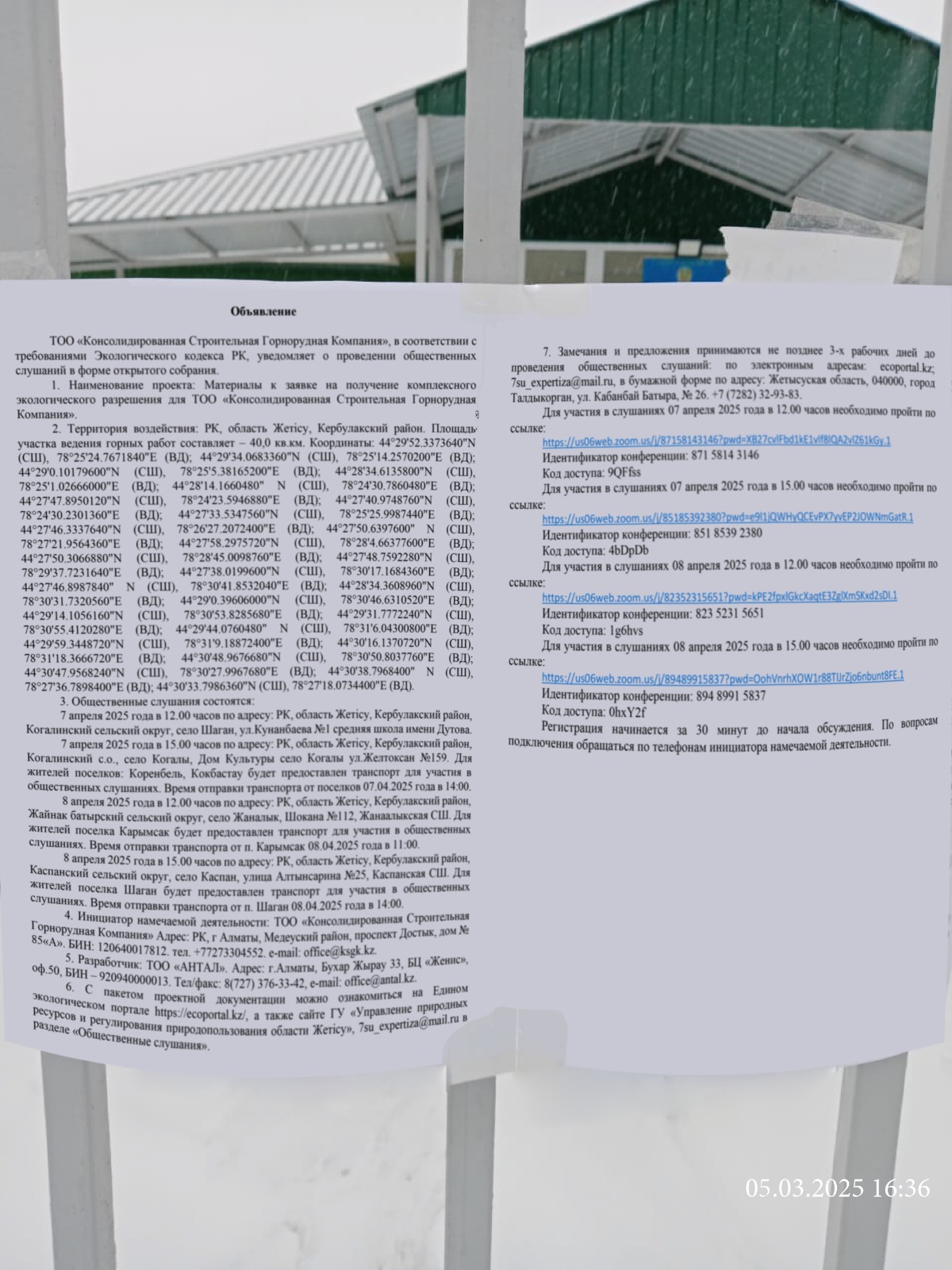 6. Объявление о проведении общественных слушаний на казахском и русском языках будет распространено следующими способами: