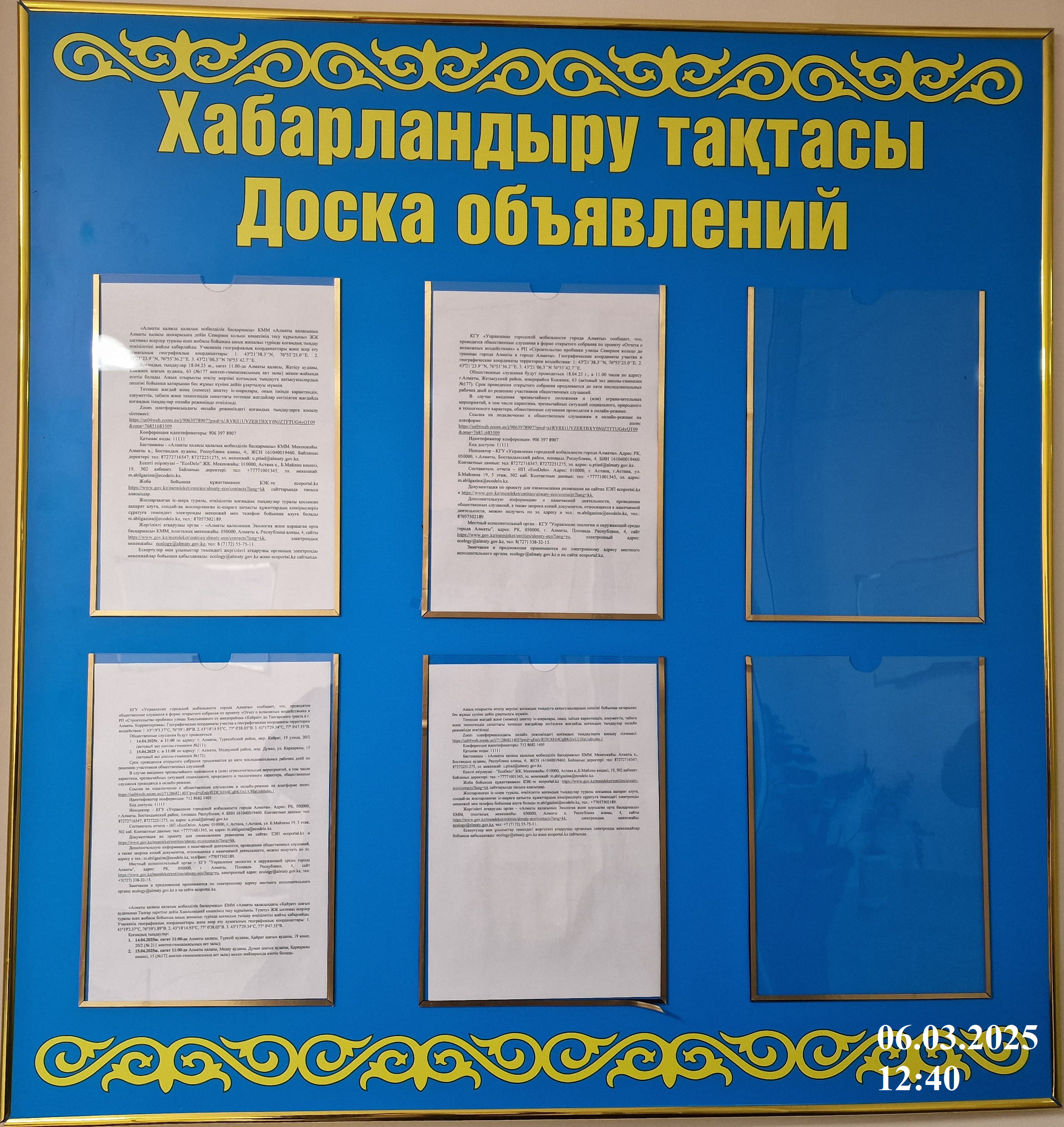 6.3. расположение мест, специально предназначенных для Размещения печатных объявлений (доски объявлений): Доски объявлений в г. Алматы