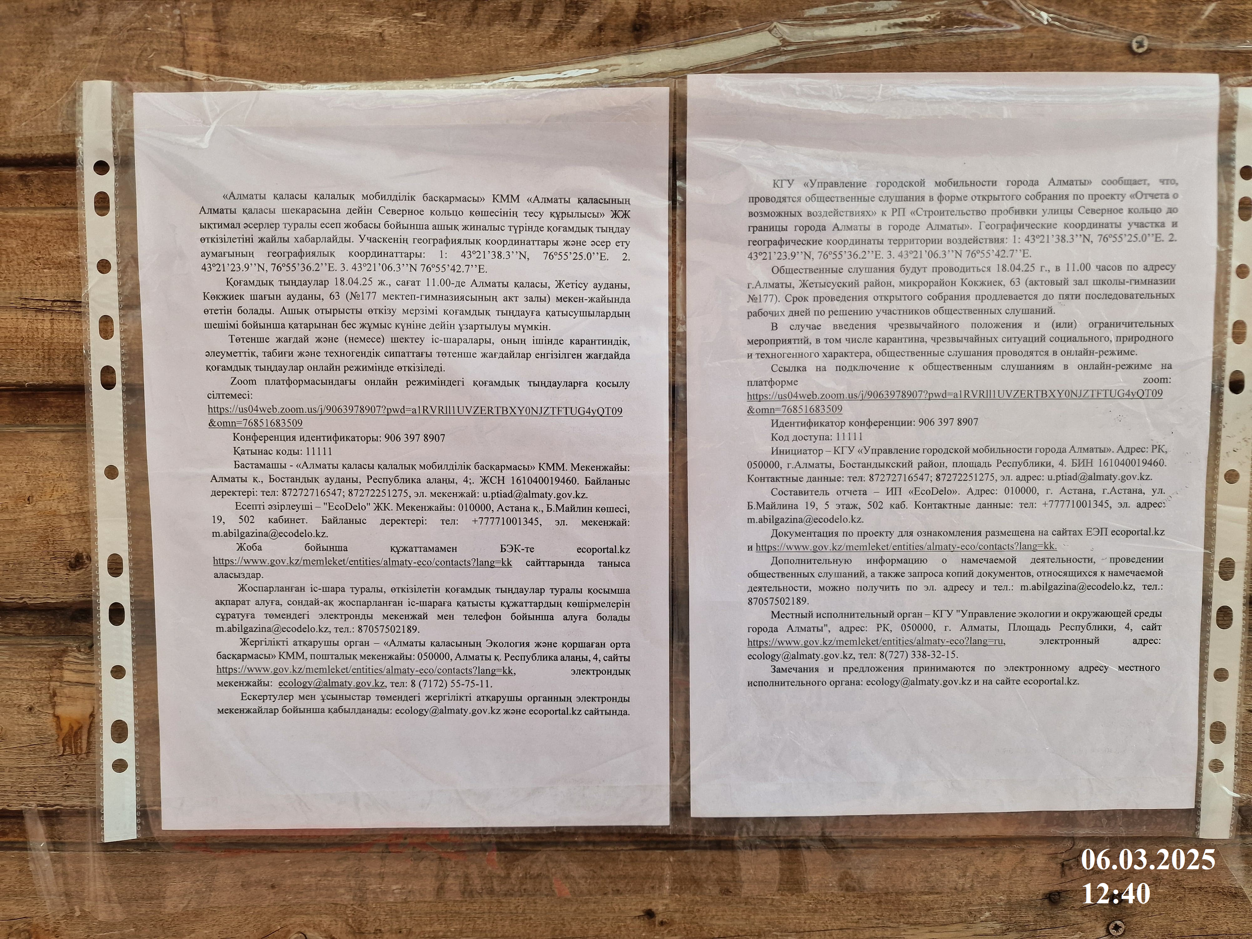 По проекту: Отчет о возможных воздействиях на рабочий проект «Строительство пробивки улицы Северное кольцо до границы города Алматы в городе Алматы»