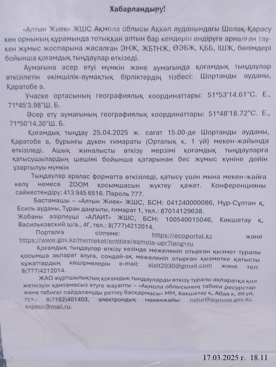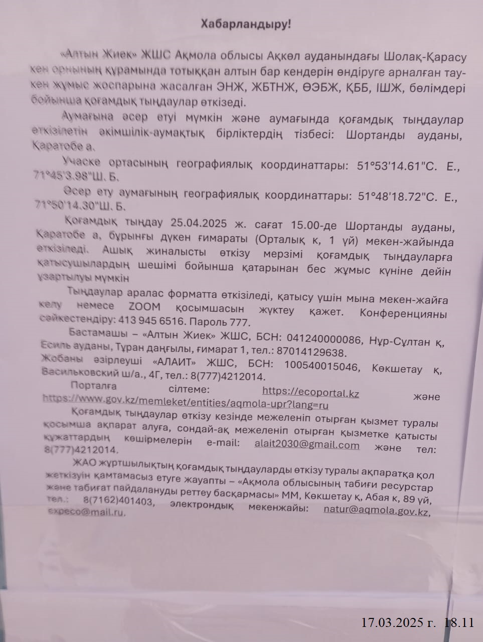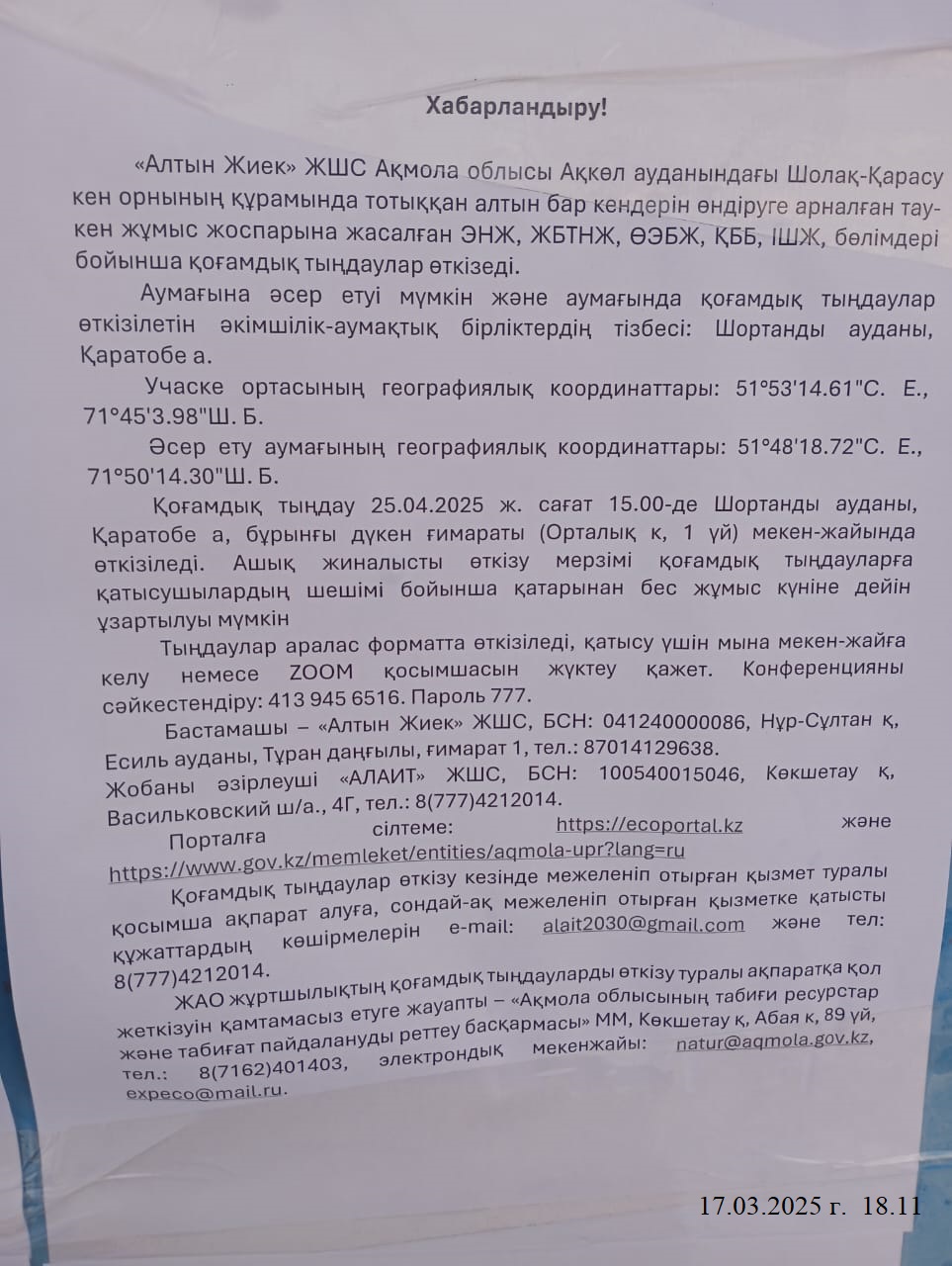 4. Повестка дня общественных слушаний: Золоторудное месторождение Шолак-Карасу находится в Аккольском районе Акмолинской области. Расстояния до районного центра г. Акколь - 53 км, до областного – г. Кокшетау – 215 км, до столицы г. Астана – 90 км. Ближайшие населенные пункты аул Каратобе и аул Карасай расположены в 10 км и 13,5 км, соответственно. Ближайшим водным объектом является река Шолак-Карасу, протекающая на расстоянии 140 м с северной стороны от месторождения. Указанные населенные пункты связаны между собой дорогами с твердым покрытием или улучшенными грунтовыми дорогами. По территории Аккольского района проходит железная дорога по нескольким направлениям: Алматы-Петропавловск, Кокшетау-Кызылорда и т.д., автомобильные дороги международного, республиканского и областного значения, что делает привлекательным развитие промышленности. Ближайшим крупнейшим предприятиям является филиал АО «ГМК Казахалтын» рудник Жолымбет. Местное население занято в горнодобывающей промышленности (рудник Жолымбет) и в сельском хозяйстве. В период 2005-2015 годов, комплекс геологоразведочных работ выполнен силами ТОО «Алтын Жиек» с привлечением подрядчиков для производства буровых, лабораторных и технологических, гидрогеологических и инженерно-геологических исследований. По результатам геологоразведочных работ выявлены два мелких золоторудных месторождения Арктас и Шолак-Карасу, связанных с развитием зоны окисления по минерализованным зонам штокверкого, прожилкового типа с рассеянной сульфидной минерализацией. На основании положительных результатов геологоразведочных работ, специалистами ТОО «ГРС консалтинг» разработано ТЭО промышленных кондиций для условий открытой отработки по состоянию на 01.07.2015г. В ТЭО произведены повариантный подсчет запасов и экономические расчеты месторождения Шолак-Карасу по вариантам бортовых содержаний золота: 0,2; 0,3; 0,5 г/т применительно к современным условиям. В 2023 году специалистами ТОО «BAITAS GEOLOGY» по заявке и за счет средств ТОО «Алтын Жиек» выполена переоценка запасов из категории С2 в категорию С1 золотосодержащих руд на месторождении «Шолак-Карасу» расположенного в пределах Аксу-Жолымбетской контрактной территории в Акмолинской области по состоянию на 01.09.2023 года. Геолого-экономическая оценка запасов месторождения в контурах открытой добычи по вариантам бортовых содержаний золота показали наибольшую эффективность для открытой отработки запасов по бортовому содержанию золота 0,2 г/т. В ТЭО определены гидрогеологические и горнотехнические параметры открытой отработки месторождения. Обоснована система отработки месторождения открытым способом, оптимизирована глубина карьера. Экологическая обстановка контролируется и обеспечивается выполнением широкомасштабной программы экологического контроля, начиная со стадии поисков и разведки по настоящее время. Запасы месторождения Шолак-Карасу утверждены протоколом № 2614-23-У заседания ГКЗ от 22.11.2023 года.