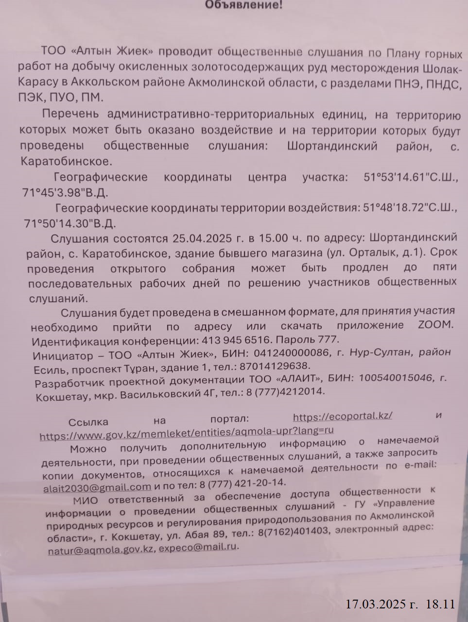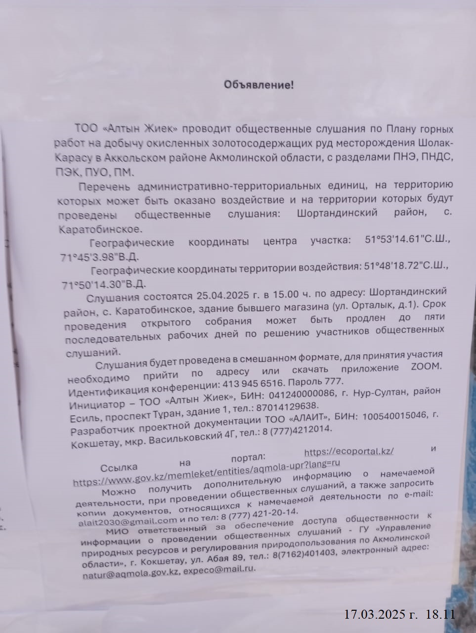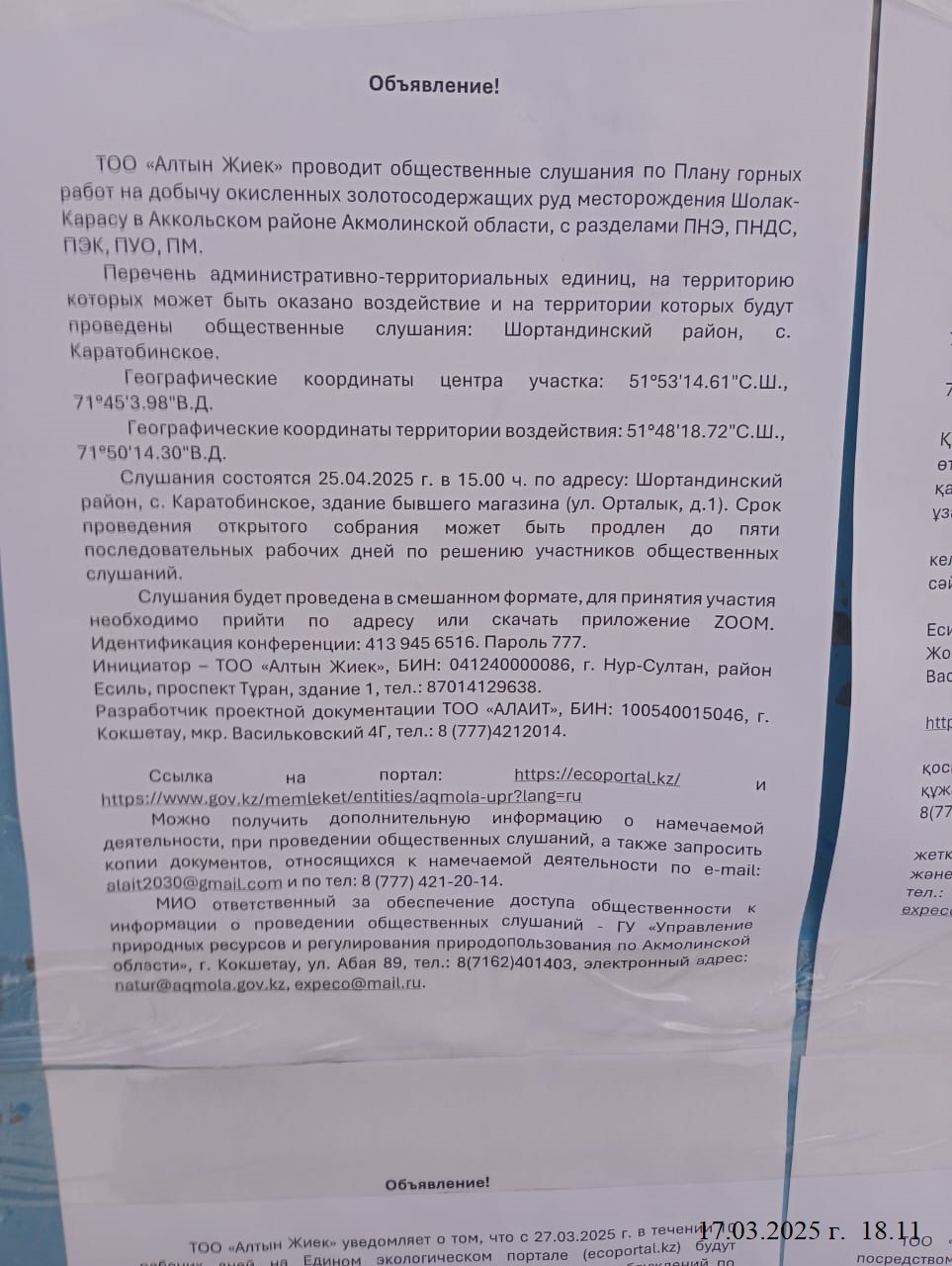 3. Общественные слушания организованны: Управление природных ресурсов и регулирования природопользования Акмолинской области, expeco@mail.ru,