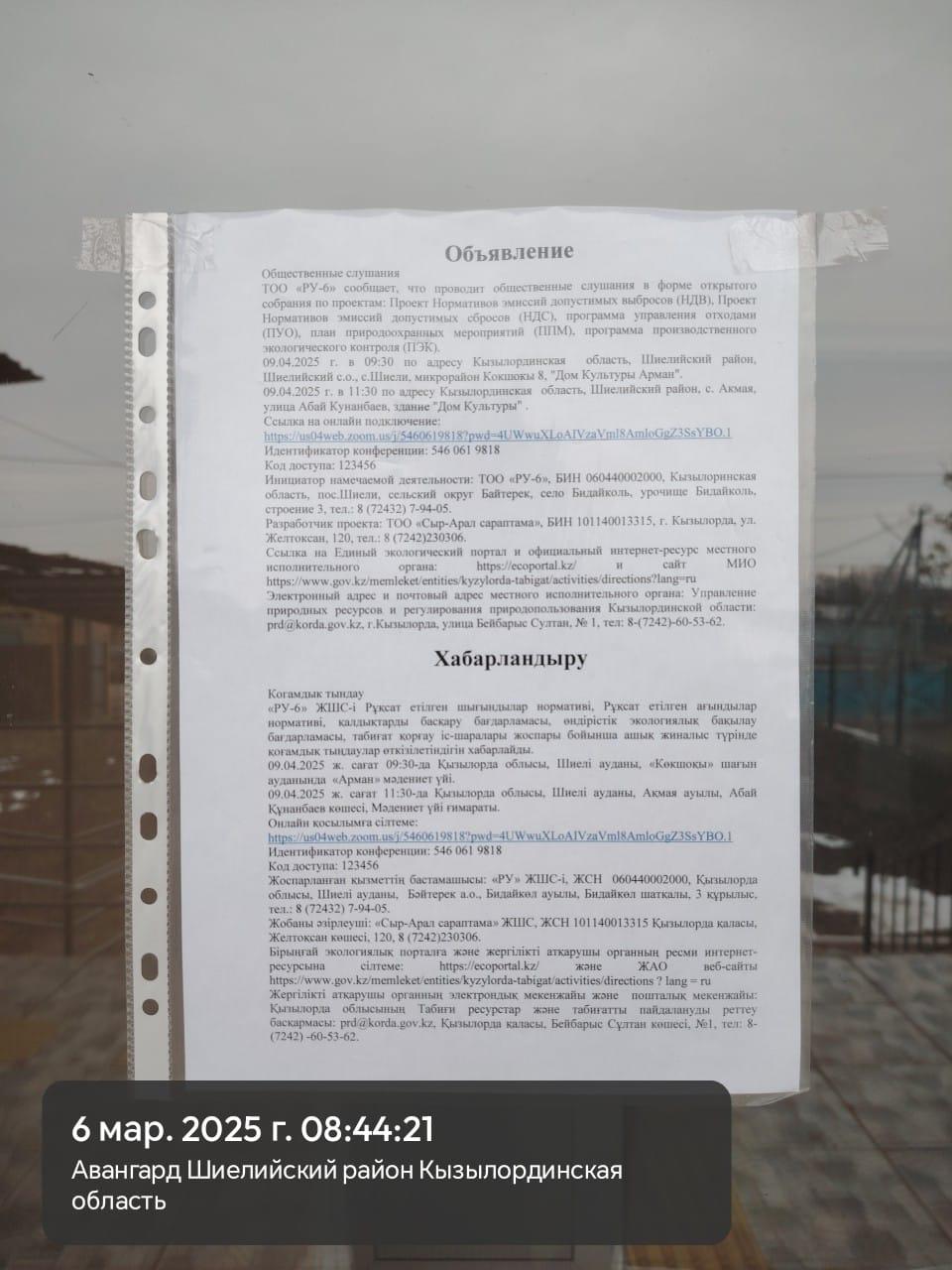 3. Общественные слушания организованны: Управление природных ресурсов и регулирования природопользования Кызылординской области, 87242605369, a.koszhanova@korda.gov.kz,