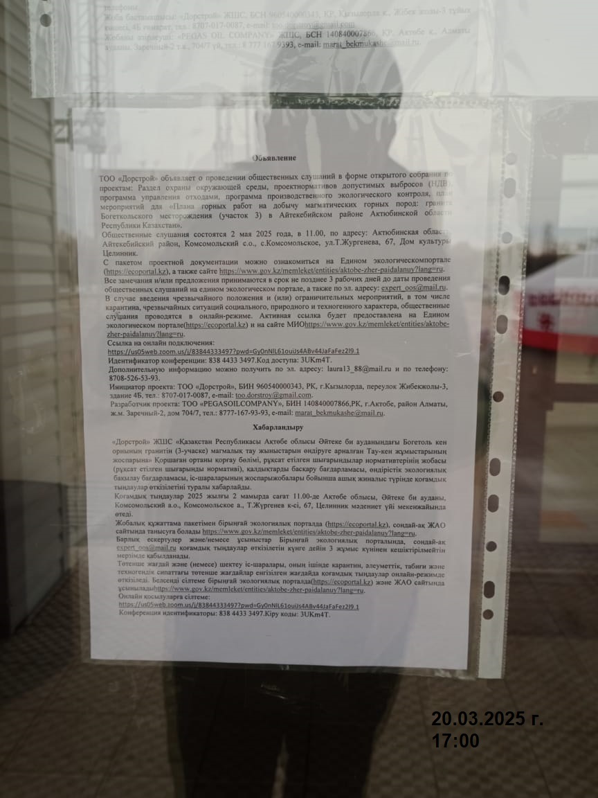 3. Общественные слушания организованны: Управление природных ресурсов и регулирования природопользования Актюбинской области, expert_oos@mail.ru,