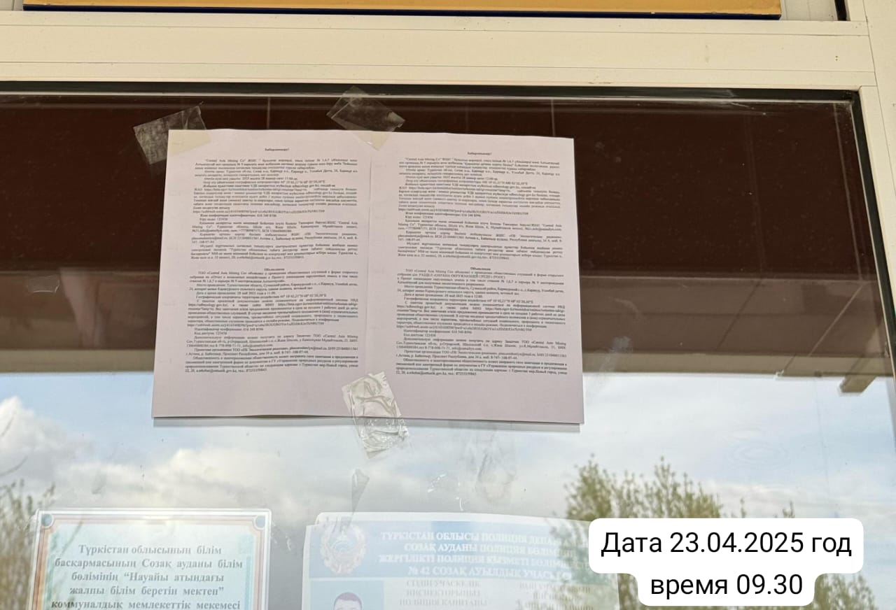 3. Общественные слушания организованны: Управление природных ресурсов и регулирования природопользования Туркестанской области, a.erkebai@ontustik.gov.kz,