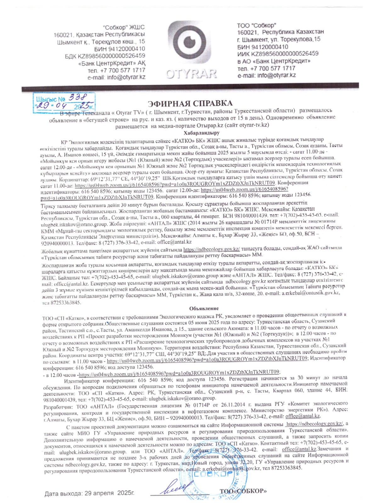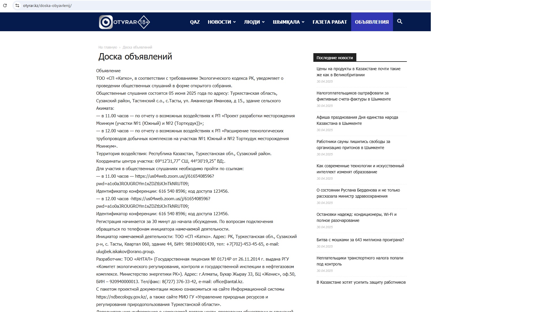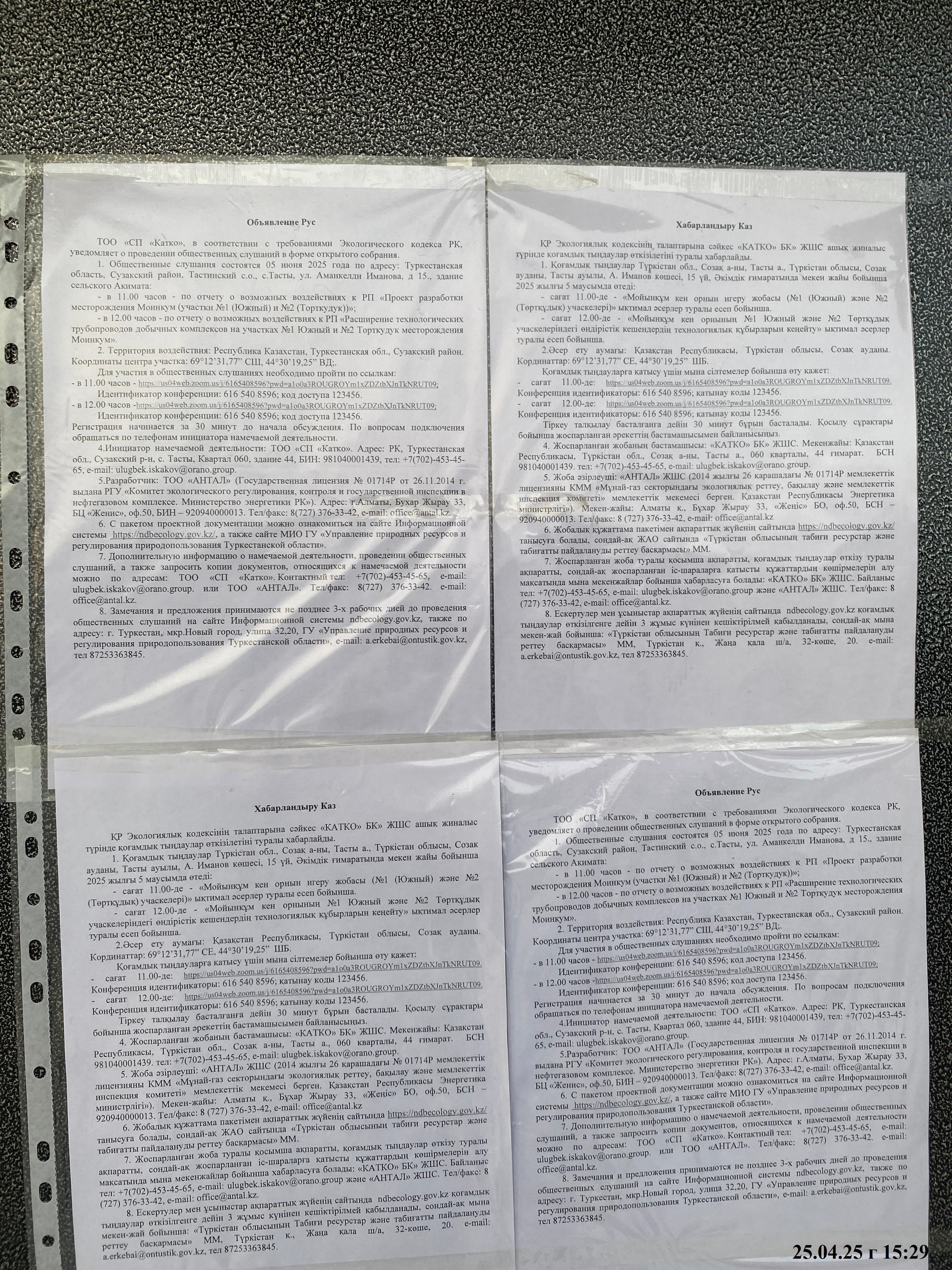 3. Общественные слушания организованны: Управление природных ресурсов и регулирования природопользования Туркестанской области, a.erkebai@ontustik.gov.kz,