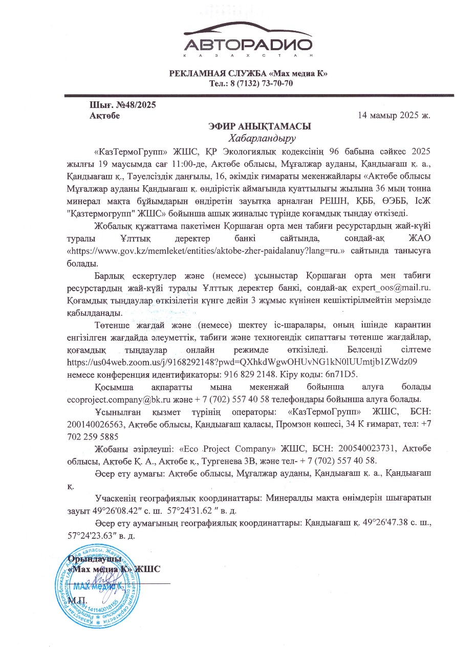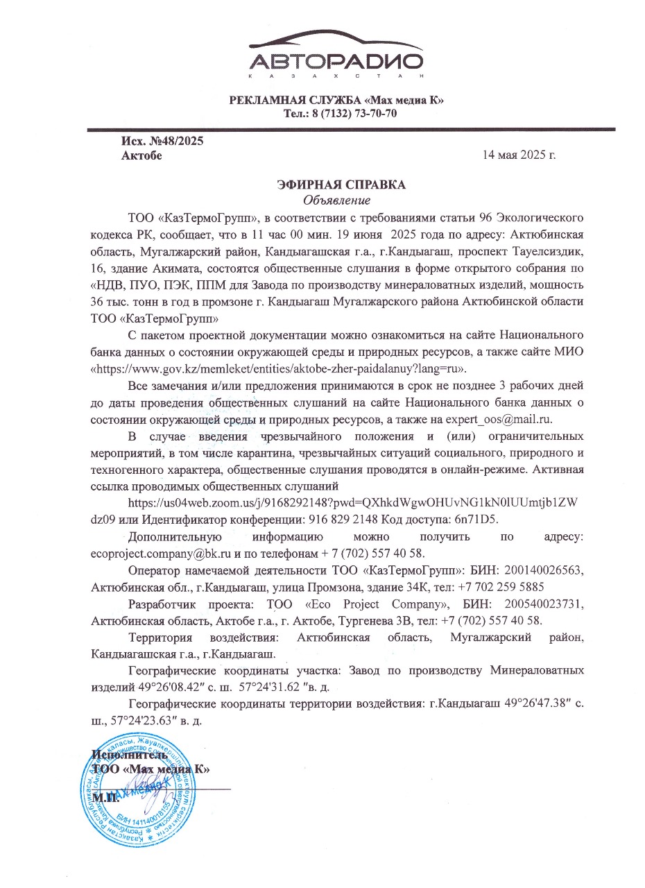 Вопрос:8: «Байтақ» жасылдар партиясы: По требованию пп.4) п.11 Правил проведения общественных слушаний (далее - Правила), инициатор направляет в подведомственную организацию уполномоченного органа в области охраны окружающей среды объявление о проведении общественных слушаний или подтверждающий документ о своевременном его размещении в периодическом печатном издании (газета) и не менее чем в одном теле- или радиоканале. Однако, представленная инициатором эфирная справка не подтверждает о своевременном размещении объявления в радиоканале. Во-первых, в эфирной справке не указано должностное лицо, подписавший данный документ. Во-вторых, в справке нет сведений о том, что радиостанция подтверждает какие-либо действия. Также не указаны: дата выхода объявления в эфир и с какой периодичностью. Поэтому, данная справка не отвечает требованиям Правил.