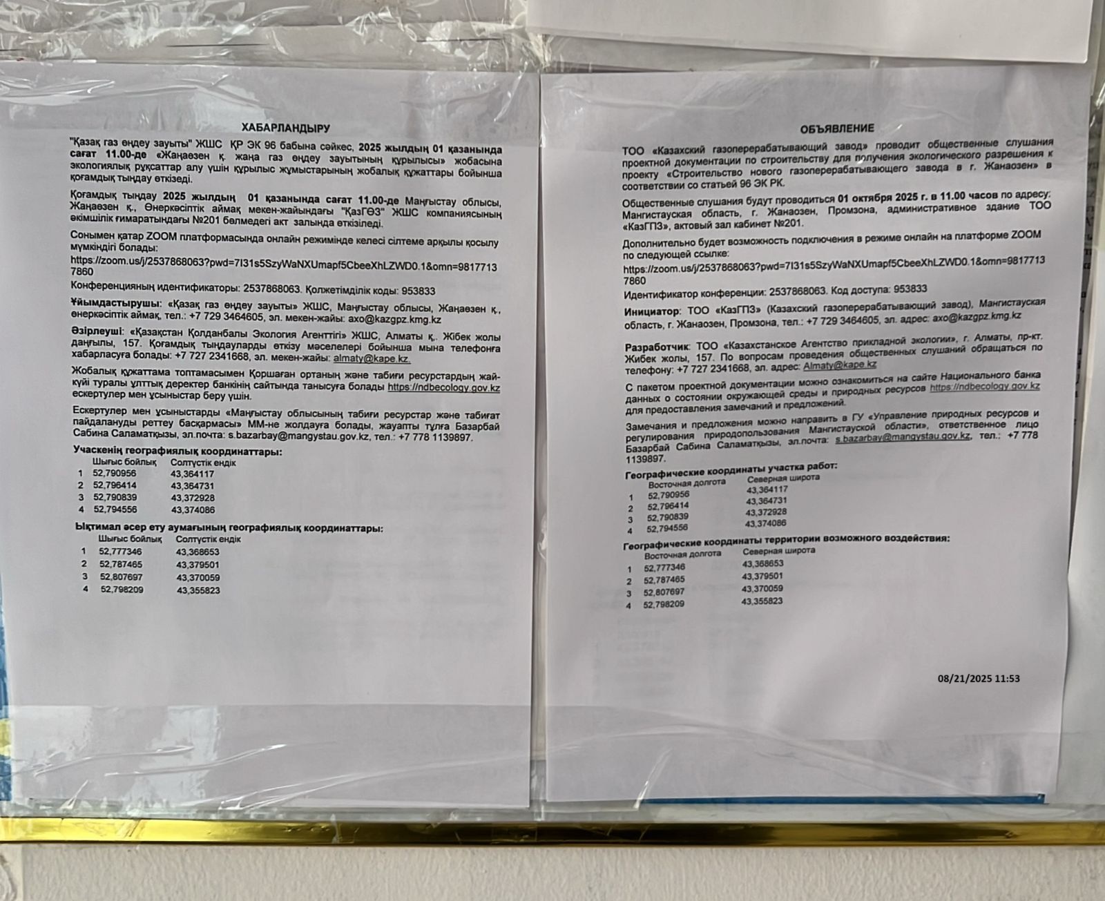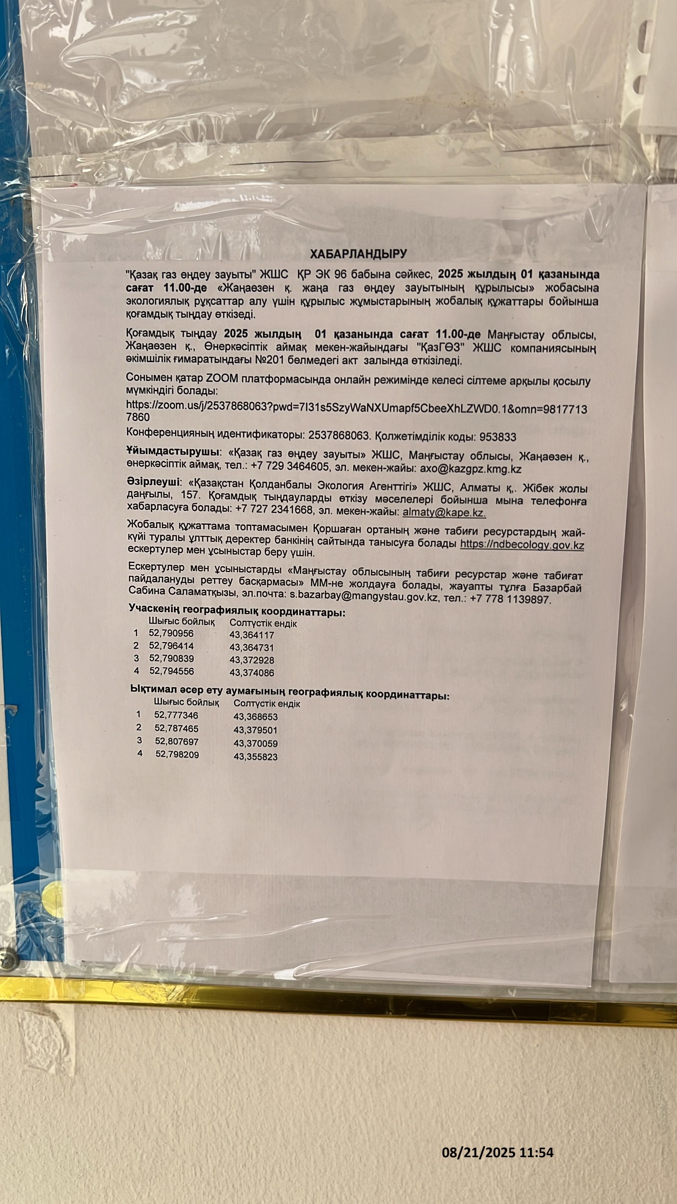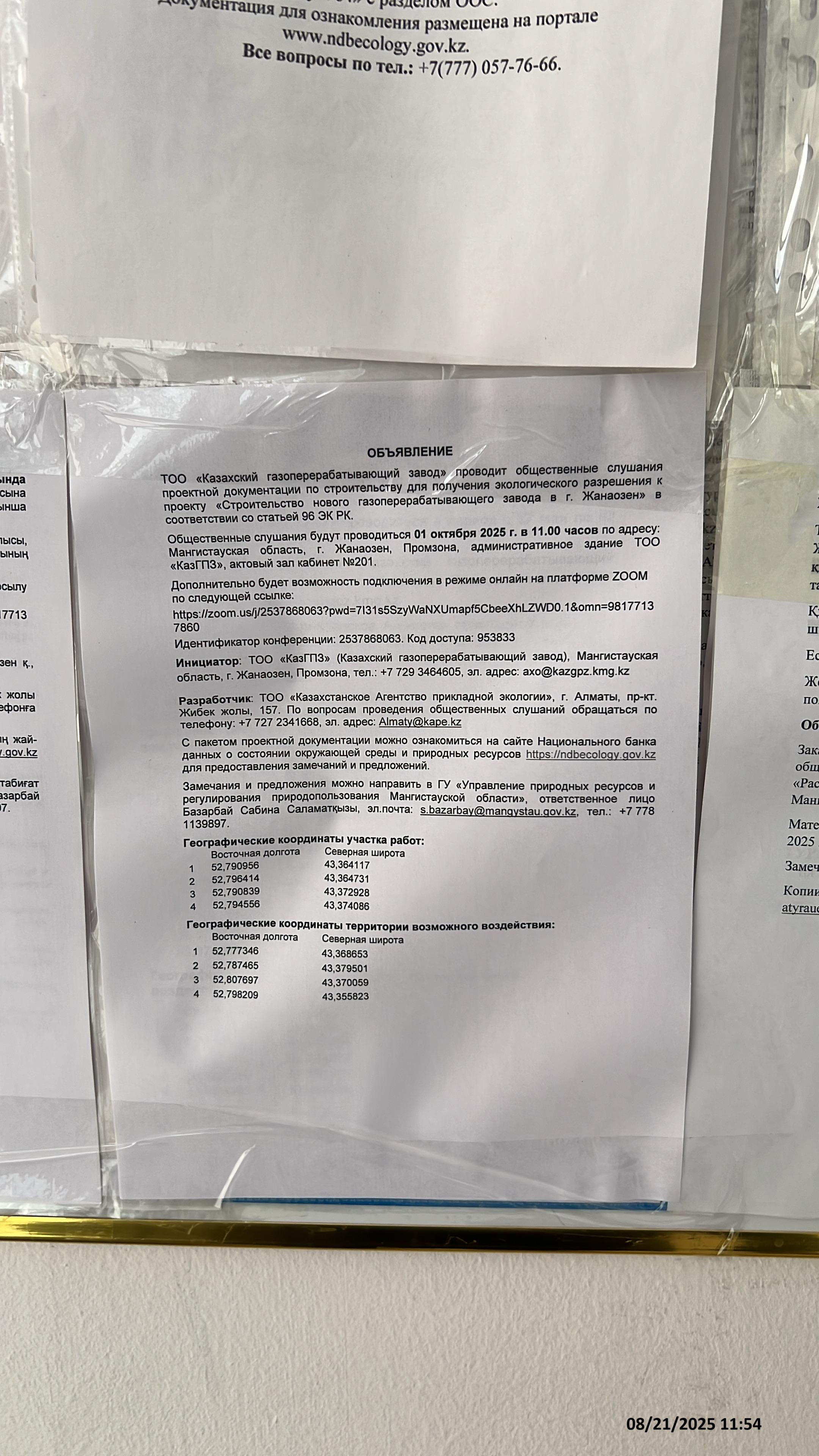 3. Общественные слушания организованны: Управление природных ресурсов и регулирования природопользования Мангистауской области, s.bazarbay@mangystau.gov.kz,