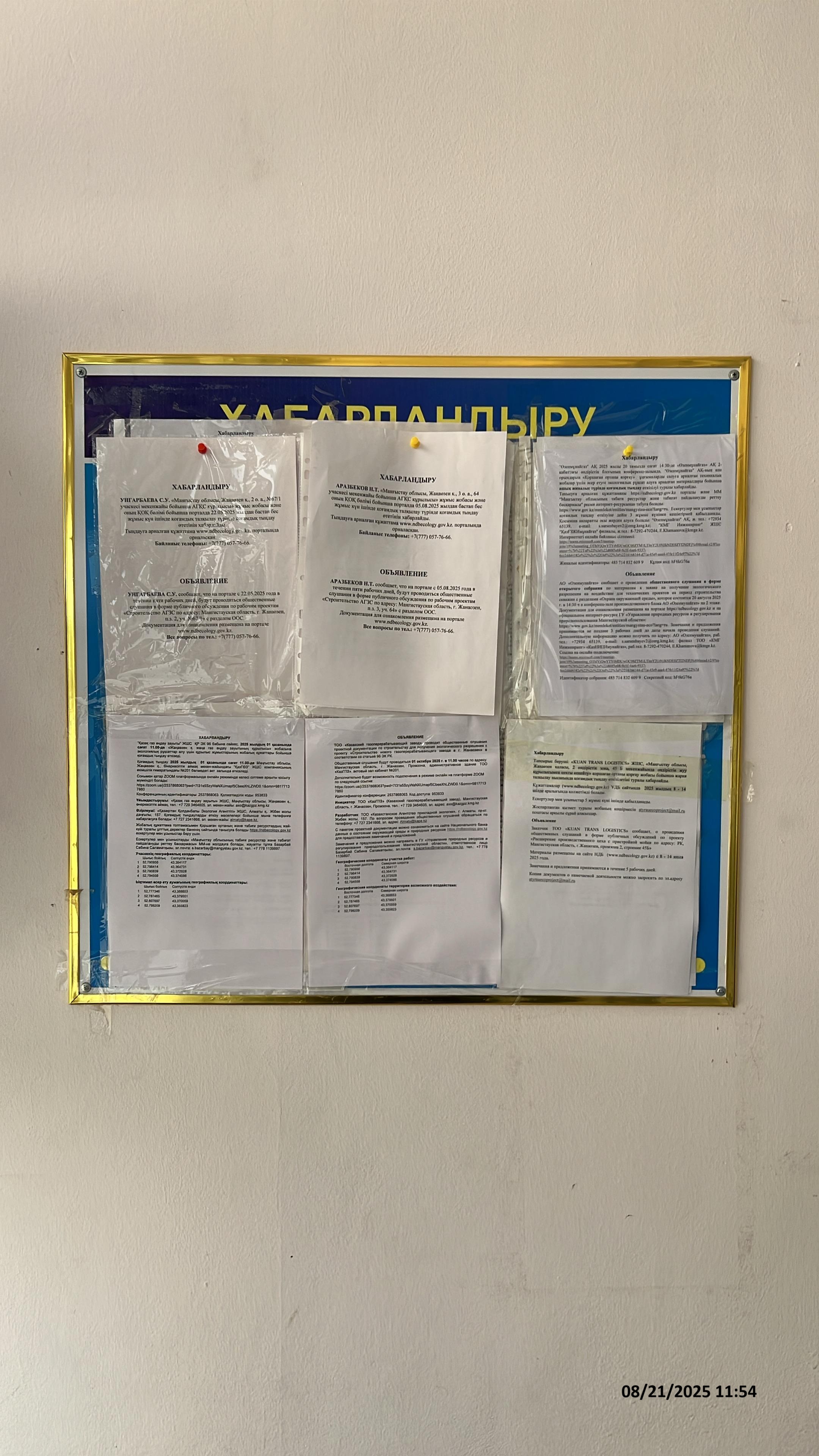 6.3. расположение мест, специально предназначенных для Размещения печатных объявлений (доски объявлений): доска объявлений в Акимате г. Жанаозен.
