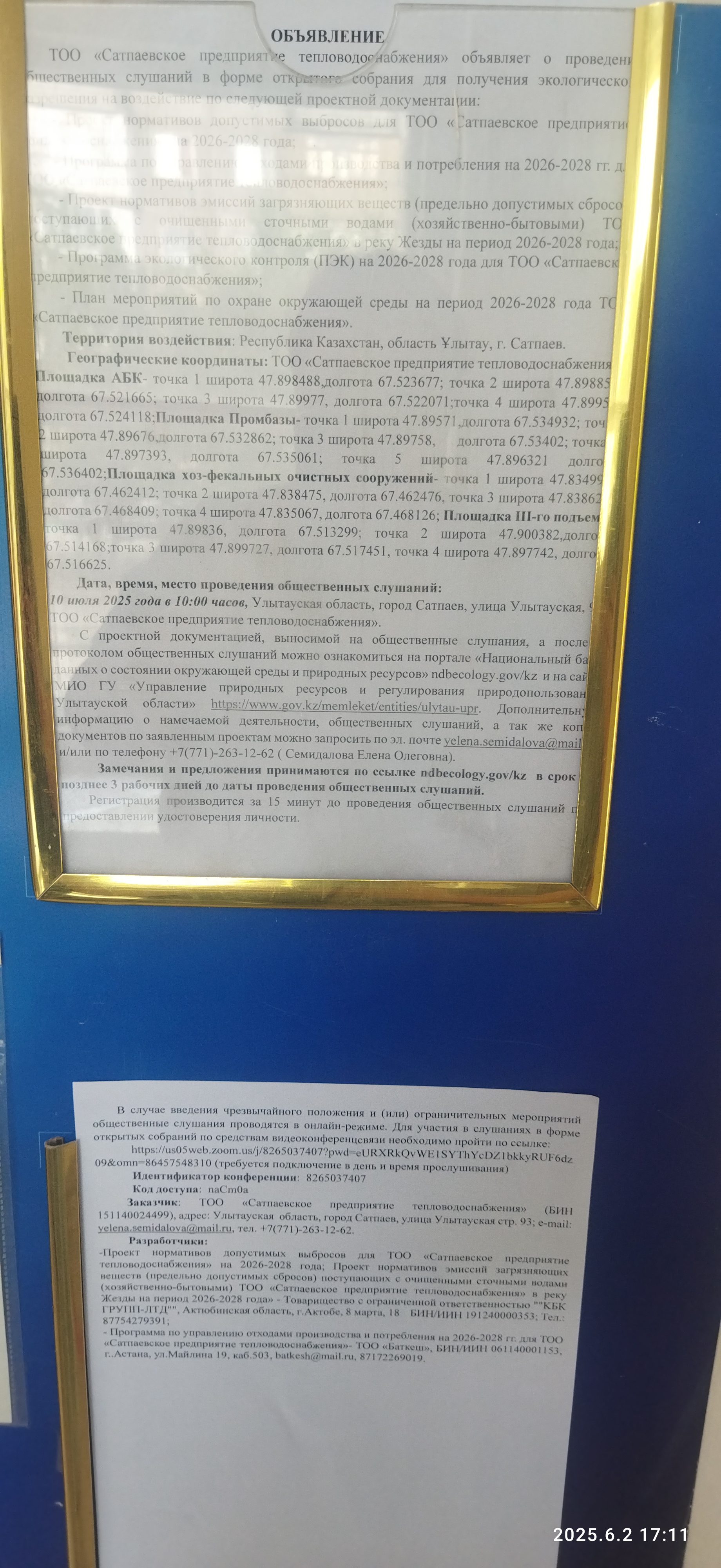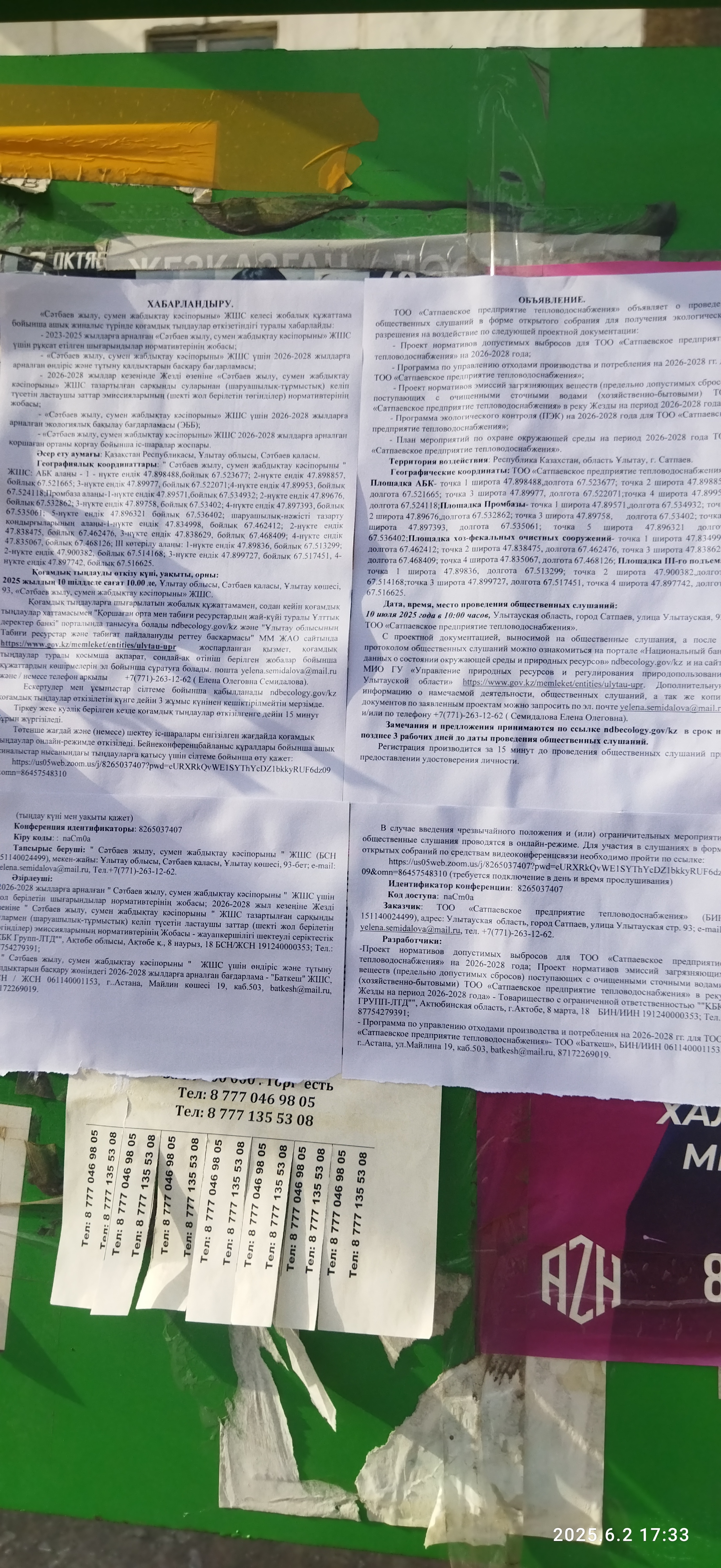 1.4. Описание для подключения к онлайн трансляции при прохождении общественного слушания: в соответствии с пп.4, п.11 прил. 3 Правил, информация о проведении общественных слушаний должна быть распространена на государственном и русском языках на досках объявлений местных исполнительных органов административно-территориальных единиц и в местах, специально предназначенных для размещения объявлений. В связи с чем необходимо дополнительно разместить печатные объявления на досках объявлений в акимате и в местах, специально предназначенных для размещения объявлений.