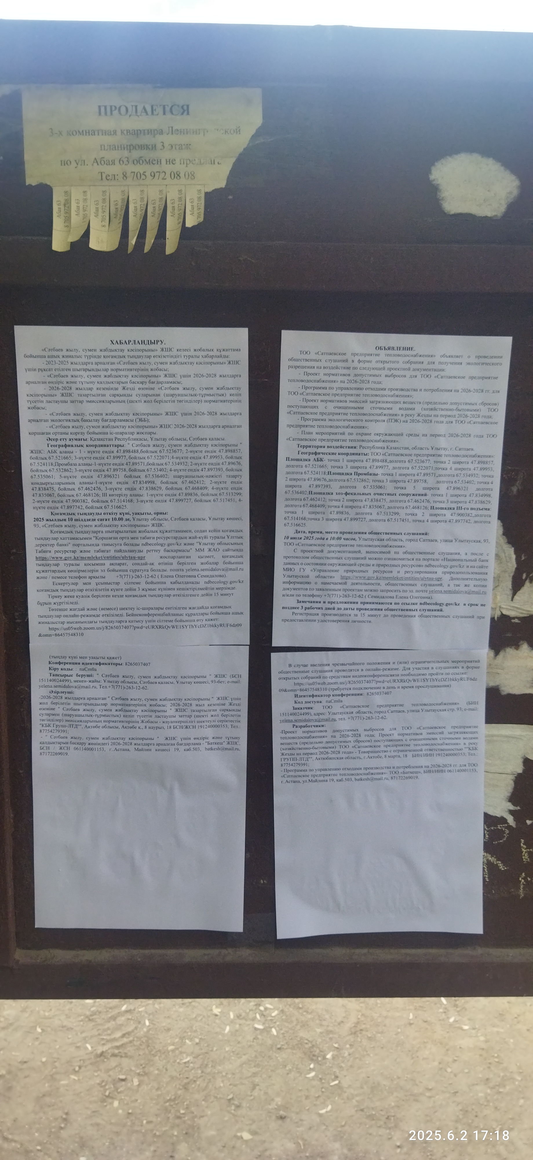 6.3. расположение мест, специально предназначенных для Размещения печатных объявлений (доски объявлений): "Автостанция" г. Сатпаев, район Акимата г.Сатпаев проспект К.Сатпаева, район "Медсанчасти" улица В.Гурбы, "Отделение коммунальных платежей" улица Абая 20