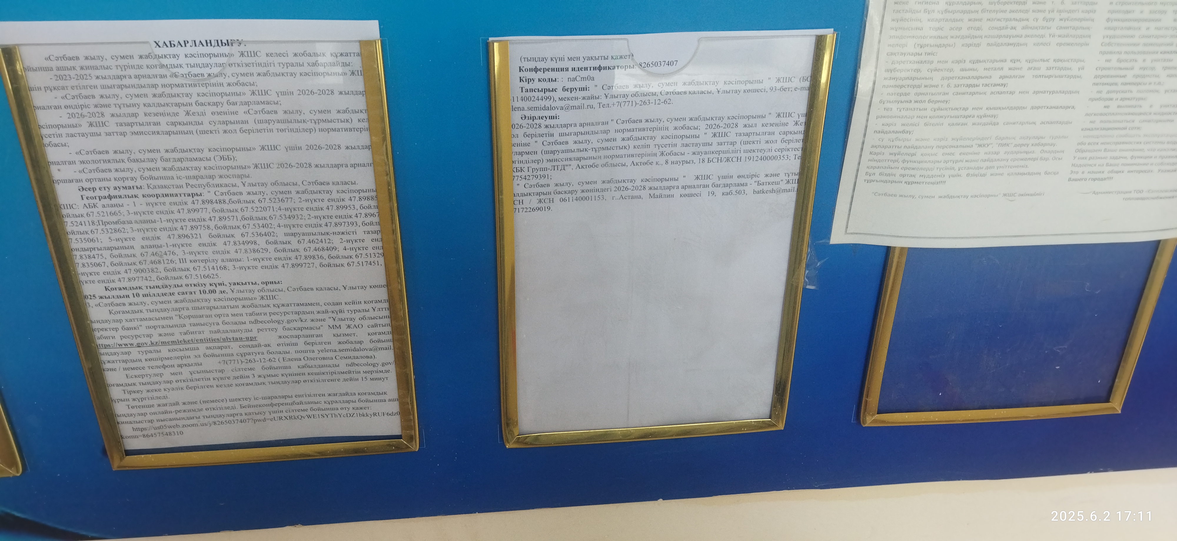 3. Общественные слушания организованны: Главный специалист УПР и ПР область Ұлытау, ulytau.obl_priroda@mail.ru,