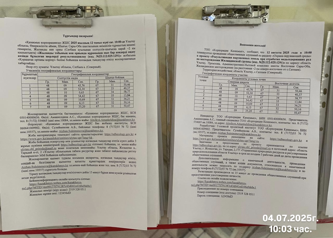 3. Общественные слушания организованны: Главный специалист УПР и ПР область Ұлытау, ulytau.obl_priroda@mail.ru,