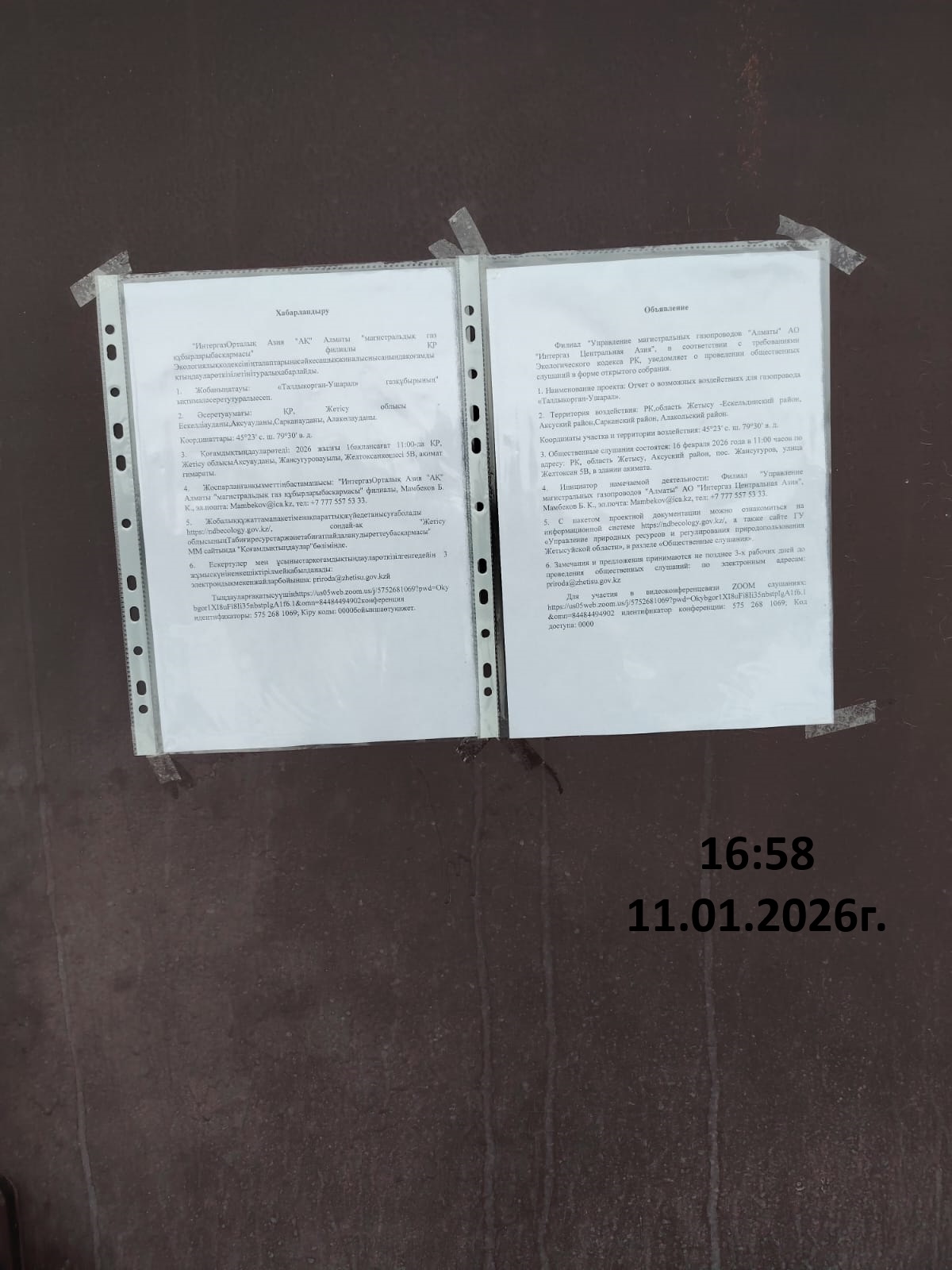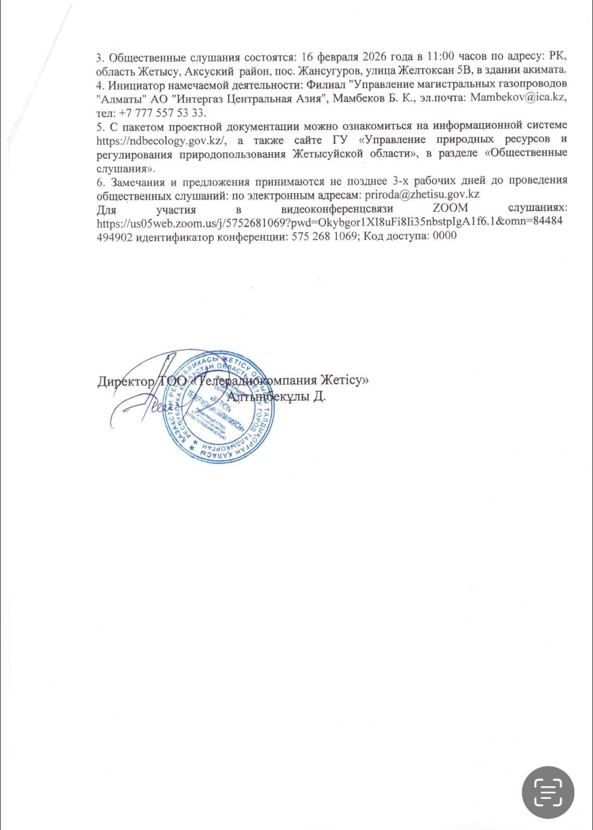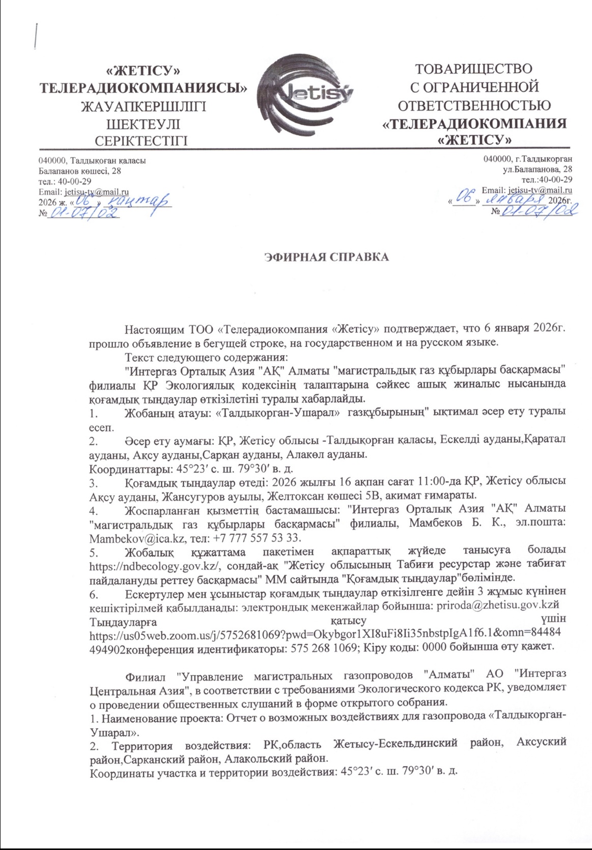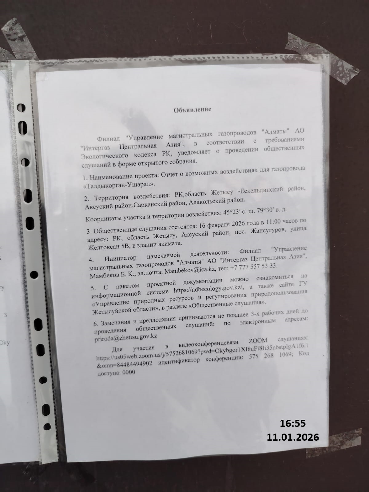 4. Повестка дня общественных слушаний: Хабарландыру "Интергаз Орталық Азия "АҚ" Алматы "магистральдық газ құбырлары басқармасы" филиалы ҚР Экологиялық кодексінің талаптарына сәйкес ашық жиналыс нысанында қоғамдық тыңдаулар өткізілетіні туралы хабарлайды. 1. Жобаның атауы: «Талдыкорган-Ушарал» газқұбырының" ықтимал әсер ету туралы есеп. 2. Әсер ету аумағы: ҚР, Жетісу облысы -Талдықорған қаласы, Ескелді ауданы,Қаратал ауданы, Ақсу ауданы,Сарқан ауданы, Алакөл ауданы. Координаттары: 45°23′ с. ш. 79°30′ в. д. 3. Қоғамдық тыңдаулар өтеді: 2026 жылғы 16 ақпан сағат 11:00-да ҚР, Жетісу облысы Ақсу ауданы, Жансугуров ауылы, Желтоксан көшесі 5В, акимат ғимараты. 4. Жоспарланған қызметтің бастамашысы: "Интергаз Орталық Азия "АҚ" Алматы "магистральдық газ құбырлары басқармасы" филиалы, Мамбеков Б. К., эл.пошта: Mambekov@ica.kz, тел: +7 777 557 53 33. 5. Жобалық құжаттама пакетімен ақпараттық жүйеде танысуға болады https://ndbecology.gov.kz/, сондай-ақ "Жетісу облысының Табиғи ресурстар және табиғат пайдалануды реттеу басқармасы" ММ сайтында "Қоғамдық тыңдаулар"бөлімінде. 6. Ескертулер мен ұсыныстар қоғамдық тыңдаулар өткізілгенге дейін 3 жұмыс күнінен кешіктірілмей қабылданады: электрондық мекенжайлар бойынша: priroda@zhetisu.gov.kzй Тыңдауларға қатысу үшін https://us05web.zoom.us/j/5752681069?pwd=Okybgor1XI8uFi8Ii35nbstpIgA1f6.1&omn=84484494902конференция идентификаторы: 575 268 1069; Кіру коды: 0000 бойынша өту қажет. Объявление Филиал "Управление магистральных газопроводов "Алматы" АО "Интергаз Центральная Азия", в соответствии с требованиями Экологического кодекса РК, уведомляет о проведении общественных слушаний в форме открытого собрания. 1. Наименование проекта: Отчет о возможных воздействиях для газопровода «Талдыкорган-Ушарал». 2. Территория воздействия: РК,область Жетысу-Ескельдинский район, Аксуский район,Сарканский район, Алакольский район. Координаты участка и территории воздействия: 45°23′ с. ш. 79°30′ в. д. 3. Общественные слушания состоятся: 16 февраля 2026 года в 11:00 часов по адресу: РК, область Жетысу, Аксуский район, пос. Жансугуров, улица Желтоксан 5В, в здании акимата. 4. Инициатор намечаемой деятельности: Филиал "Управление магистральных газопроводов "Алматы" АО "Интергаз Центральная Азия", Мамбеков Б. К., эл.почта: Mambekov@ica.kz, тел: +7 777 557 53 33. 5. С пакетом проектной документации можно ознакомиться на информационной системе https://ndbecology.gov.kz/, а также сайте ГУ «Управление природных ресурсов и регулирования природопользования Жетысуйской области», в разделе «Общественные слушания». 6. Замечания и предложения принимаются не позднее 3-х рабочих дней до проведения общественных слушаний: по электронным адресам: priroda@zhetisu.gov.kz Для участия в видеоконференцсвязи ZOOM слушаниях: https://us05web.zoom.us/j/5752681069?pwd=Okybgor1XI8uFi8Ii35nbstpIgA1f6.1&omn=84484494902 идентификатор конференции: 575 268 1069; Код доступа: 0000