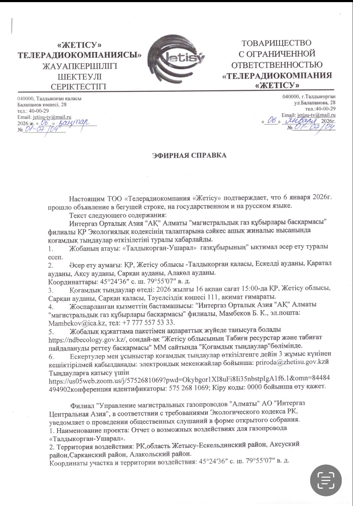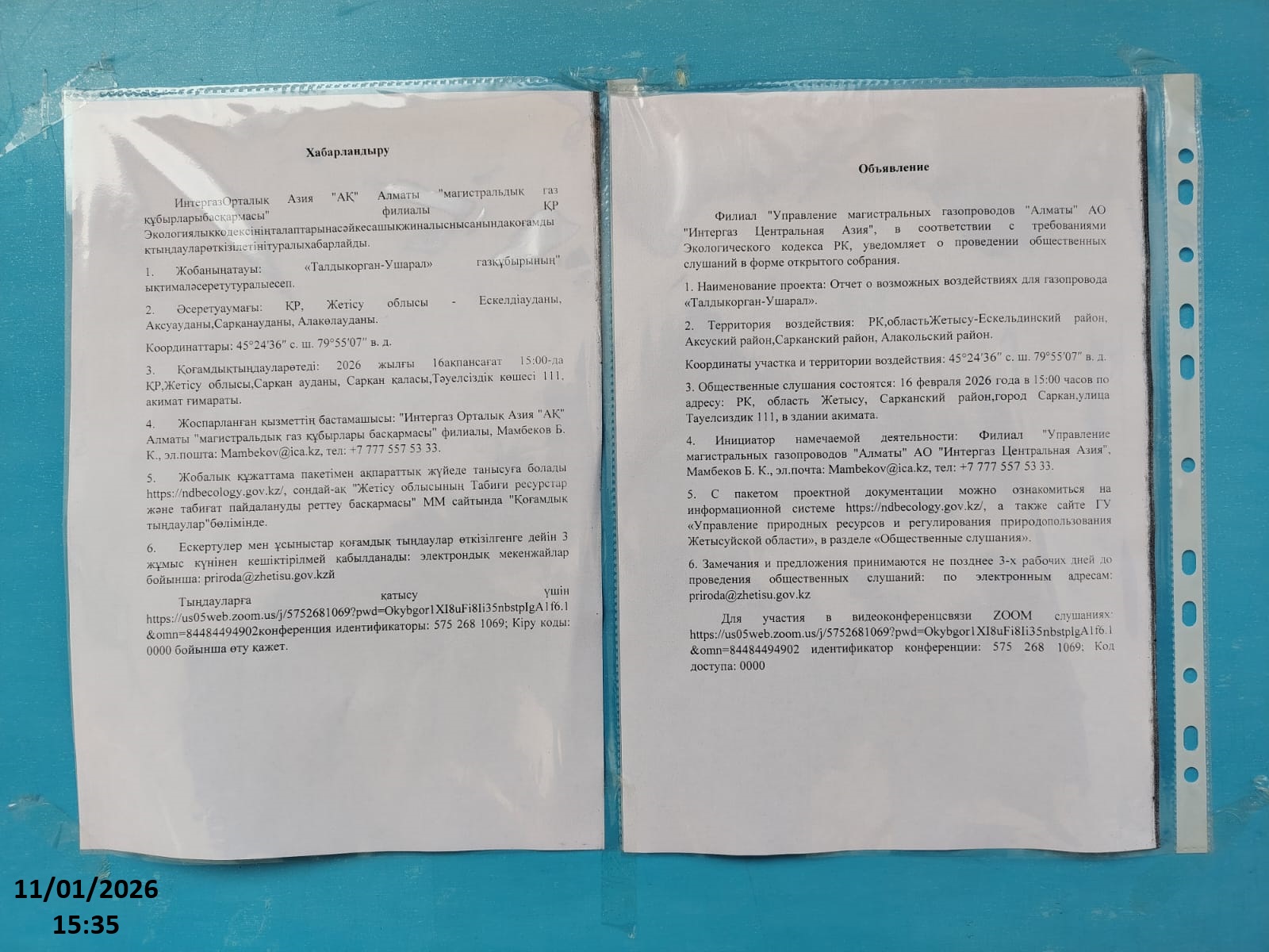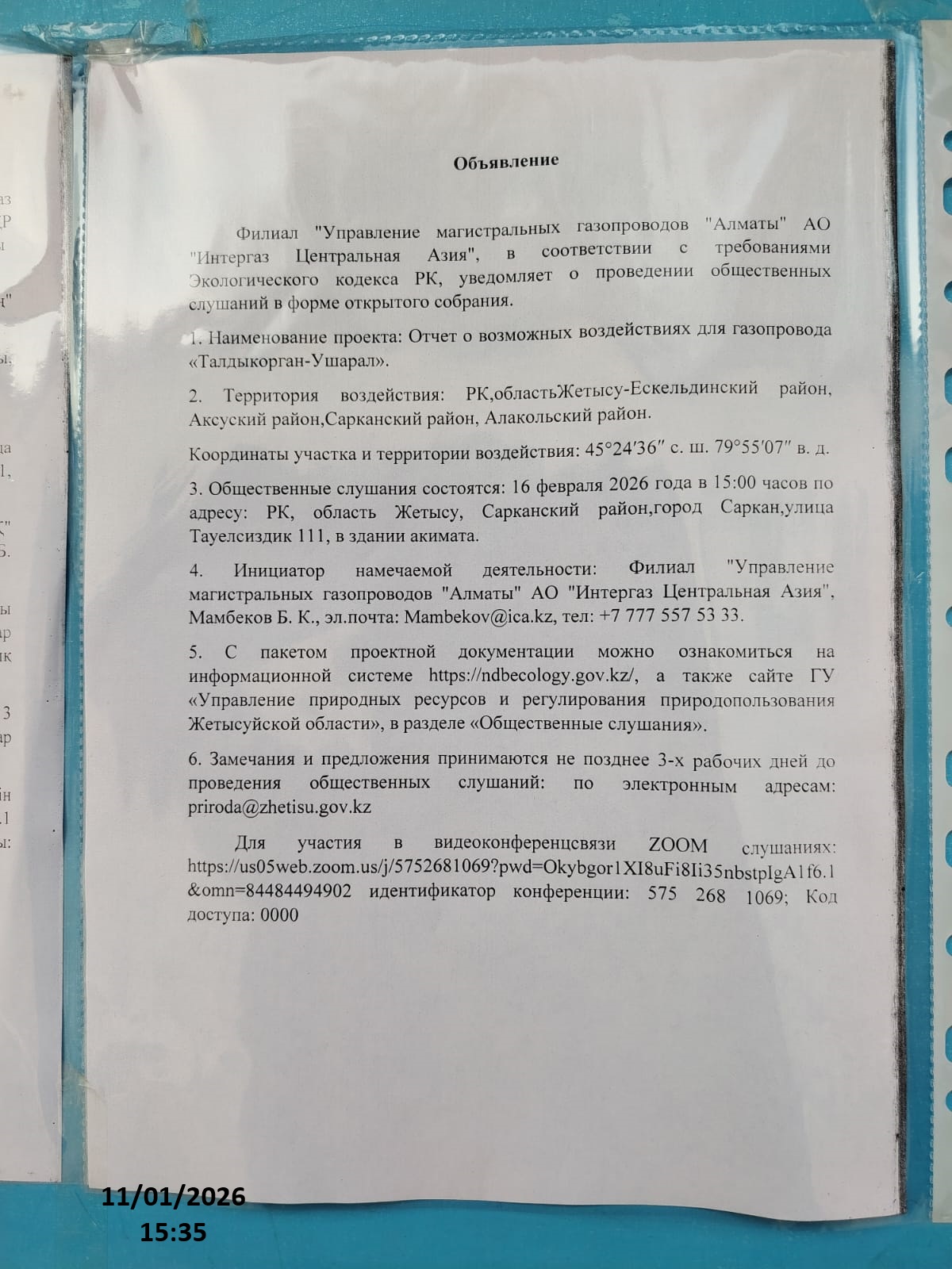 4. Повестка дня общественных слушаний: Хабарландыру Интергаз Орталық Азия "АҚ" Алматы "магистральдық газ құбырлары басқармасы" филиалы ҚР Экологиялық кодексінің талаптарына сәйкес ашық жиналыс нысанында қоғамдық тыңдаулар өткізілетіні туралы хабарлайды. 1. Жобаның атауы: «Талдыкорган-Ушарал» газқұбырының" ықтимал әсер ету туралы есеп. 2. Әсер ету аумағы: ҚР, Жетісу облысы -Талдықорған қаласы, Ескелді ауданы,Қаратал ауданы, Ақсу ауданы,Сарқан ауданы, Алакөл ауданы. Координаттары: 45°24′36″ с. ш. 79°55′07″ в. д. 3. Қоғамдық тыңдаулар өтеді: 2026 жылғы 16 ақпан сағат 15:00-да ҚР, Жетісу облысы, Сарқан ауданы, Сарқан қаласы, Тәуелсіздік көшесі 111, акимат ғимараты. 4. Жоспарланған қызметтің бастамашысы: "Интергаз Орталық Азия "АҚ" Алматы "магистральдық газ құбырлары басқармасы" филиалы, Мамбеков Б. К., эл.пошта: Mambekov@ica.kz, тел: +7 777 557 53 33. 5. Жобалық құжаттама пакетімен ақпараттық жүйеде танысуға болады https://ndbecology.gov.kz/, сондай-ақ "Жетісу облысының Табиғи ресурстар және табиғат пайдалануды реттеу басқармасы" ММ сайтында "Қоғамдық тыңдаулар"бөлімінде. 6. Ескертулер мен ұсыныстар қоғамдық тыңдаулар өткізілгенге дейін 3 жұмыс күнінен кешіктірілмей қабылданады: электрондық мекенжайлар бойынша: priroda@zhetisu.gov.kzй Тыңдауларға қатысу үшін https://us05web.zoom.us/j/5752681069?pwd=Okybgor1XI8uFi8Ii35nbstpIgA1f6.1&omn=84484494902конференция идентификаторы: 575 268 1069; Кіру коды: 0000 бойынша өту қажет. Объявление Филиал "Управление магистральных газопроводов "Алматы" АО "Интергаз Центральная Азия", в соответствии с требованиями Экологического кодекса РК, уведомляет о проведении общественных слушаний в форме открытого собрания. 1. Наименование проекта: Отчет о возможных воздействиях для газопровода «Талдыкорган-Ушарал». 2. Территория воздействия: РК,область Жетысу-Ескельдинский район, Аксуский район,Сарканский район, Алакольский район. Координаты участка и территории воздействия: 45°24′36″ с. ш. 79°55′07″ в. д. 3. Общественные слушания состоятся: 16 февраля 2026 года в 15:00 часов по адресу: РК, область Жетысу, Сарканский район, город Саркан,улица Тауелсиздик 111, в здании акимата. 4. Инициатор намечаемой деятельности: Филиал "Управление магистральных газопроводов "Алматы" АО "Интергаз Центральная Азия", Мамбеков Б. К., эл.почта: Mambekov@ica.kz, тел: +7 777 557 53 33. 5. С пакетом проектной документации можно ознакомиться на информационной системе https://ndbecology.gov.kz/, а также сайте ГУ «Управление природных ресурсов и регулирования природопользования Жетысуйской области», в разделе «Общественные слушания». 6. Замечания и предложения принимаются не позднее 3-х рабочих дней до проведения общественных слушаний: по электронным адресам: priroda@zhetisu.gov.kz Для участия в видеоконференцсвязи ZOOM слушаниях: https://us05web.zoom.us/j/5752681069?pwd=Okybgor1XI8uFi8Ii35nbstpIgA1f6.1&omn=84484494902 идентификатор конференции: 575 268 1069; Код доступа: 0000