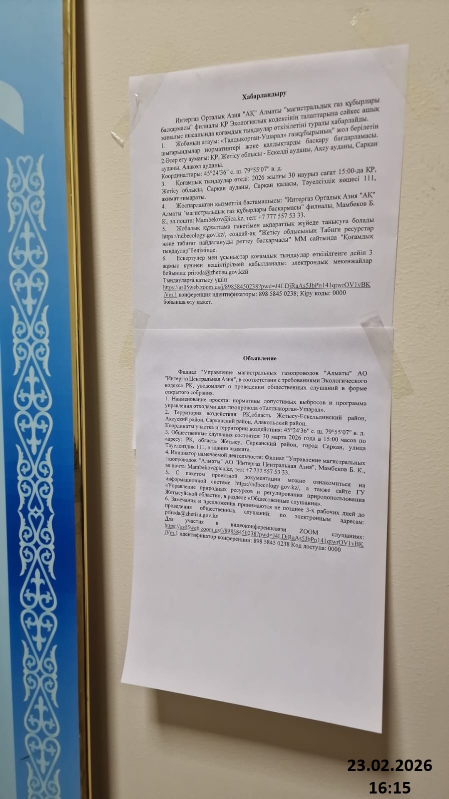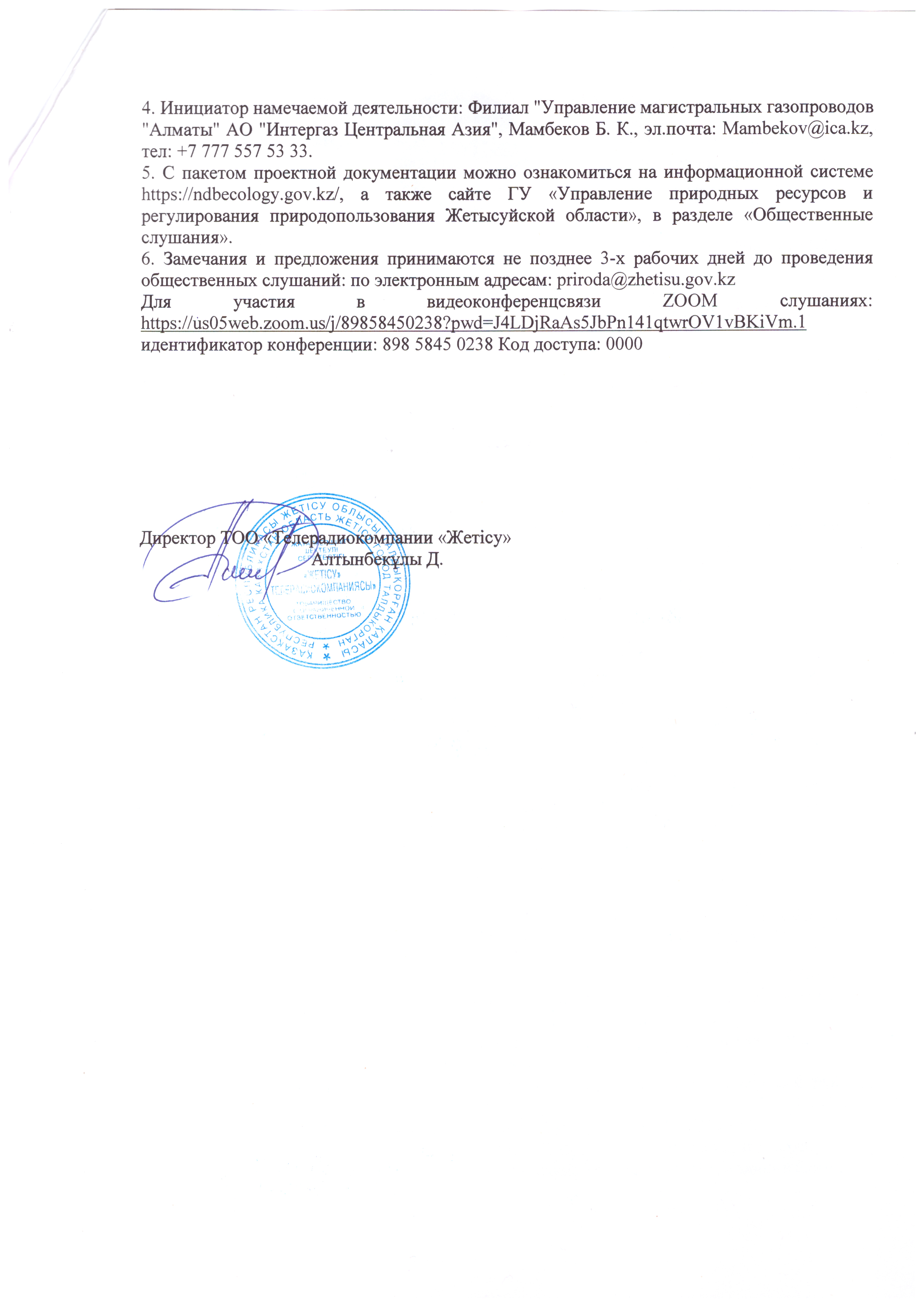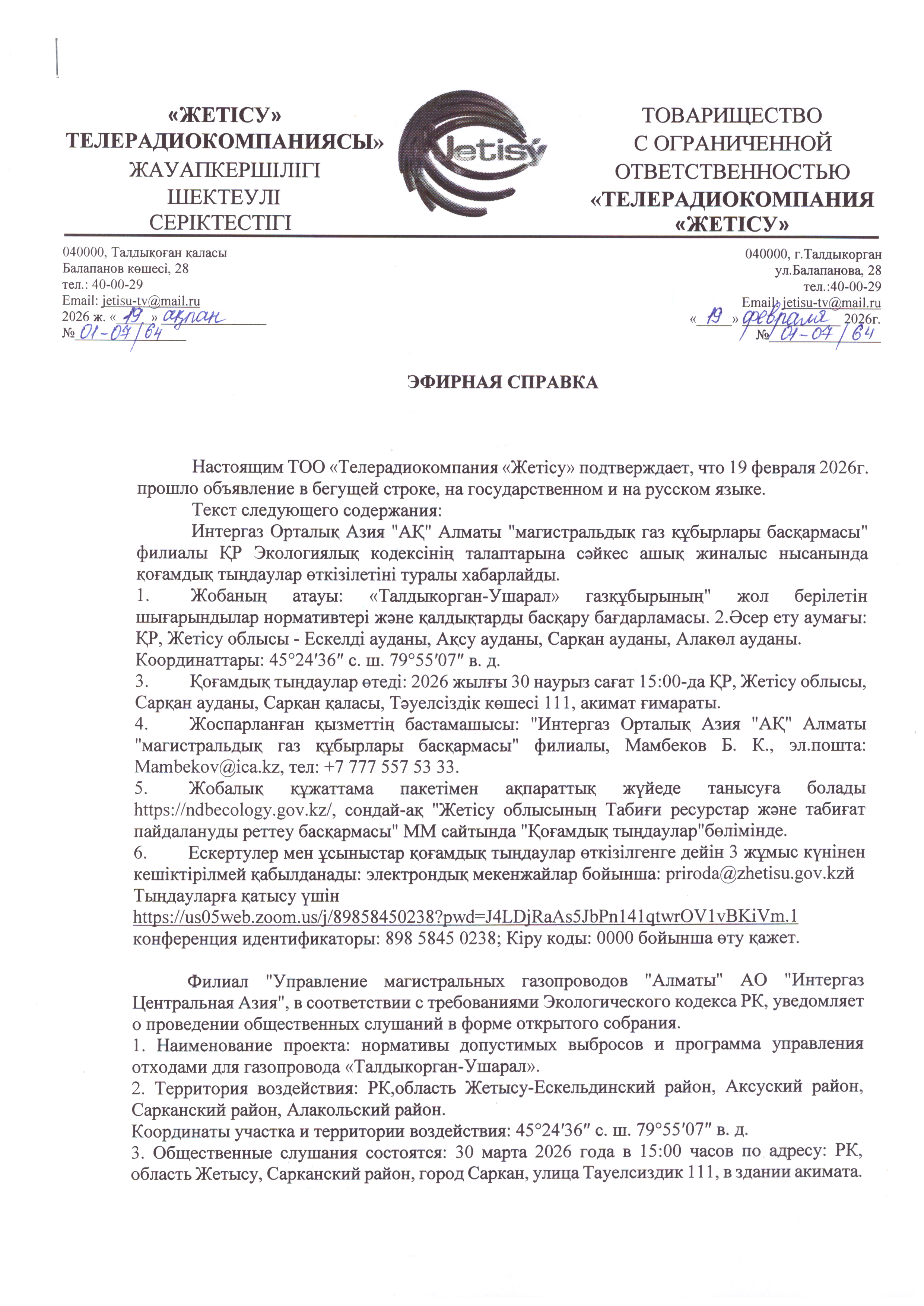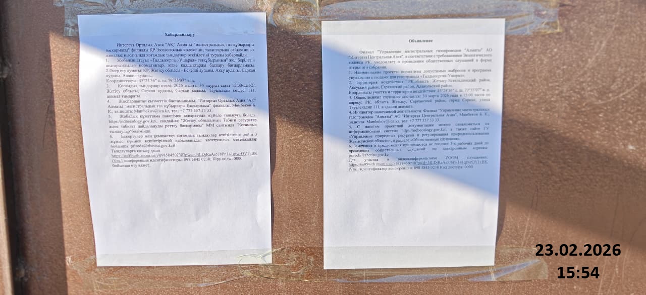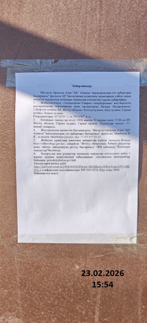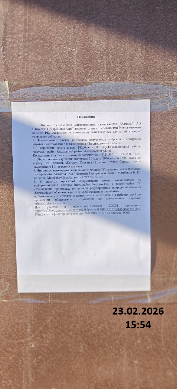4. Повестка дня общественных слушаний: Хабарландыру Интергаз Орталық Азия "АҚ" Алматы "магистральдық газ құбырлары басқармасы" филиалы ҚР Экологиялық кодексінің талаптарына сәйкес ашық жиналыс нысанында қоғамдық тыңдаулар өткізілетіні туралы хабарлайды. 1. Жобаның атауы: «Талдыкорган-Ушарал» газқұбырының" жол берілетін шығарындылар нормативтері және қалдықтарды басқару бағдарламасы. 2.Әсер ету аумағы: ҚР, Жетісу облысы - Ескелді ауданы, Ақсу ауданы, Сарқан ауданы, Алакөл ауданы. Координаттары: 45°24′36″ с. ш. 79°55′07″ в. д. 3. Қоғамдық тыңдаулар өтеді: 2026 жылғы 30 наурыз сағат 15:00-да ҚР, Жетісу облысы, Сарқан ауданы, Сарқан қаласы, Тәуелсіздік көшесі 111, акимат ғимараты. 4. Жоспарланған қызметтің бастамашысы: "Интергаз Орталық Азия "АҚ" Алматы "магистральдық газ құбырлары басқармасы" филиалы, Мамбеков Б. К., эл.пошта: Mambekov@ica.kz, тел: +7 777 557 53 33. 5. Жобалық құжаттама пакетімен ақпараттық жүйеде танысуға болады https://ndbecology.gov.kz/, сондай-ақ "Жетісу облысының Табиғи ресурстар және табиғат пайдалануды реттеу басқармасы" ММ сайтында "Қоғамдық тыңдаулар"бөлімінде. 6. Ескертулер мен ұсыныстар қоғамдық тыңдаулар өткізілгенге дейін 3 жұмыс күнінен кешіктірілмей қабылданады: электрондық мекенжайлар бойынша: priroda@zhetisu.gov.kzй Тыңдауларға қатысу үшін https://us05web.zoom.us/j/89858450238?pwd=J4LDjRaAs5JbPn141qtwrOV1vBKiVm.1 конференция идентификаторы: 898 5845 0238; Кіру коды: 0000 бойынша өту қажет. Объявление Филиал "Управление магистральных газопроводов "Алматы" АО "Интергаз Центральная Азия", в соответствии с требованиями Экологического кодекса РК, уведомляет о проведении общественных слушаний в форме открытого собрания. 1. Наименование проекта: нормативы допустимых выбросов и программа управления отходами для газопровода «Талдыкорган-Ушарал». 2. Территория воздействия: РК,область Жетысу-Ескельдинский район, Аксуский район, Сарканский район, Алакольский район. Координаты участка и территории воздействия: 45°24′36″ с. ш. 79°55′07″ в. д. 3. Общественные слушания состоятся: 30 марта 2026 года в 15:00 часов по адресу: РК, область Жетысу, Сарканский район, город Саркан, улица Тауелсиздик 111, в здании акимата. 4. Инициатор намечаемой деятельности: Филиал "Управление магистральных газопроводов "Алматы" АО "Интергаз Центральная Азия", Мамбеков Б. К., эл.почта: Mambekov@ica.kz, тел: +7 777 557 53 33. 5. С пакетом проектной документации можно ознакомиться на информационной системе https://ndbecology.gov.kz/, а также сайте ГУ «Управление природных ресурсов и регулирования природопользования Жетысуйской области», в разделе «Общественные слушания». 6. Замечания и предложения принимаются не позднее 3-х рабочих дней до проведения общественных слушаний: по электронным адресам: priroda@zhetisu.gov.kz Для участия в видеоконференцсвязи ZOOM слушаниях: https://us05web.zoom.us/j/89858450238?pwd=J4LDjRaAs5JbPn141qtwrOV1vBKiVm.1 идентификатор конференции: 898 5845 0238 Код доступа: 0000