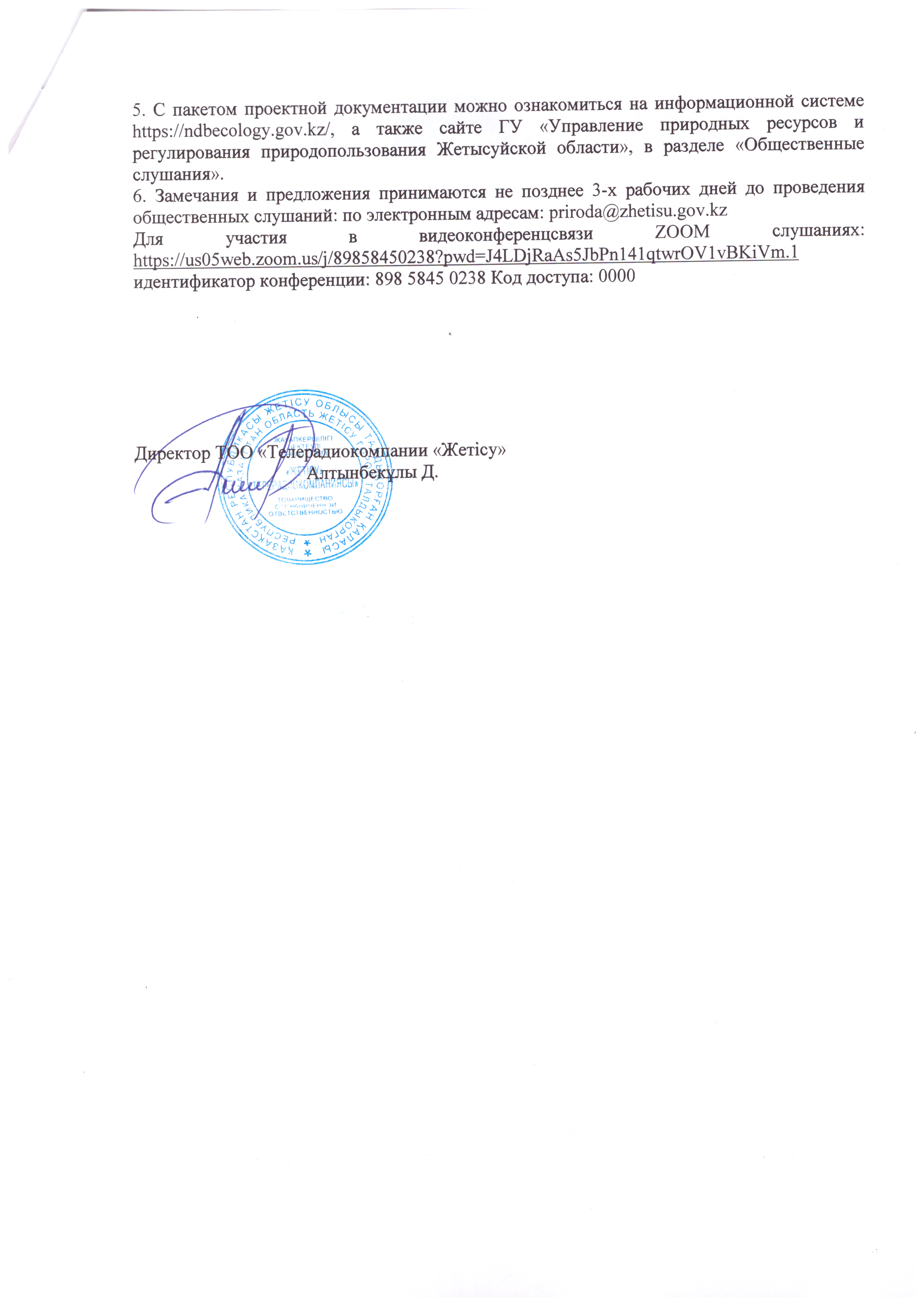 3. Общественные слушания организованны: Главный специалист УПР и ПР Жетысуйской области, priroda@zhetisu.gov.kz,