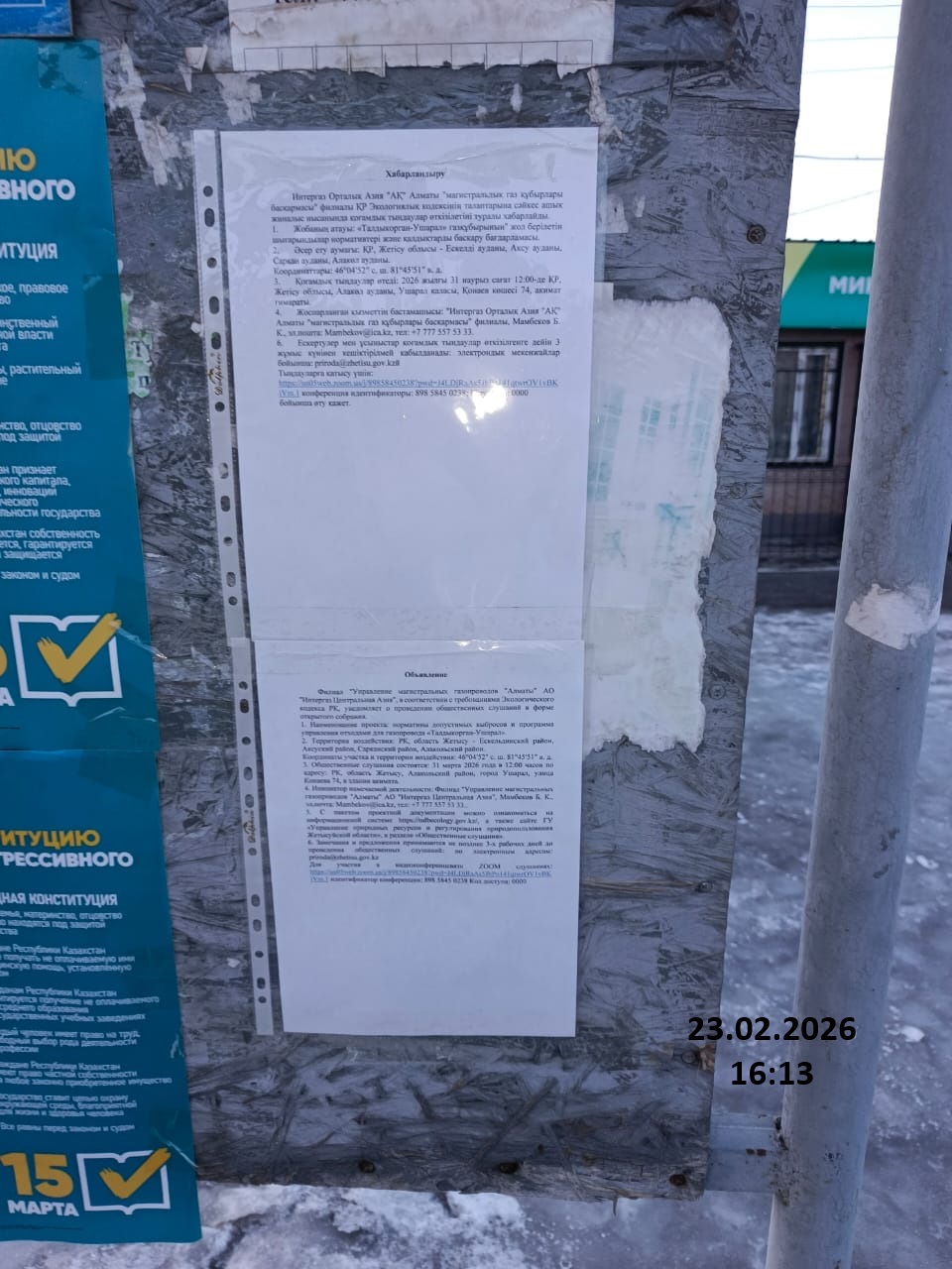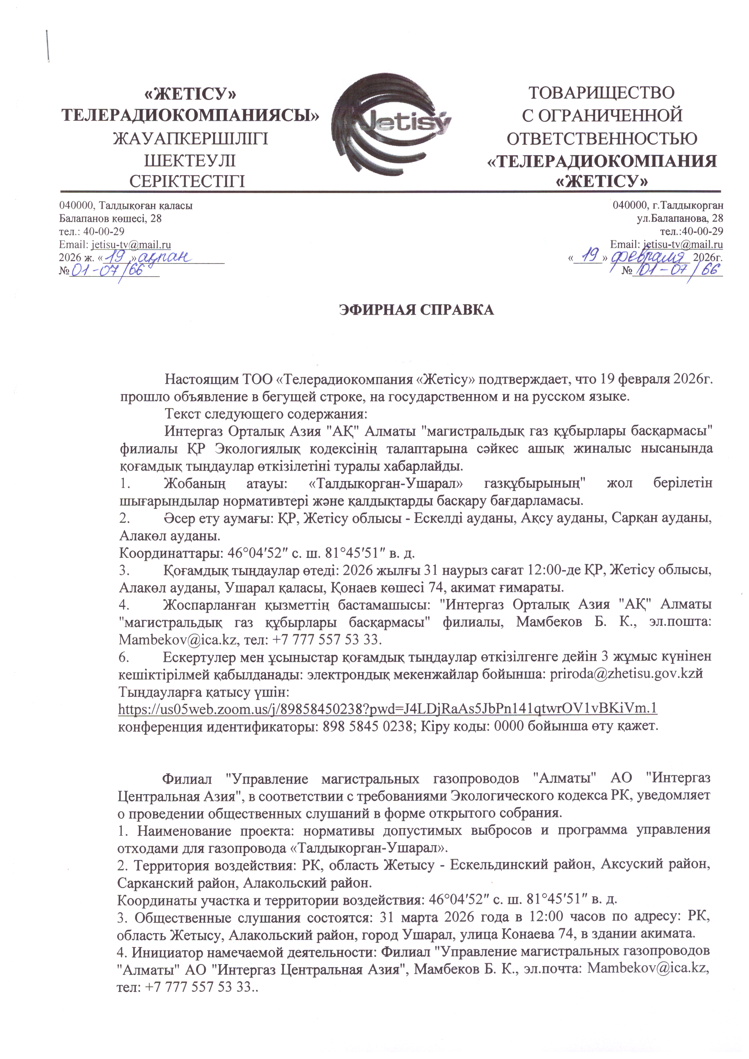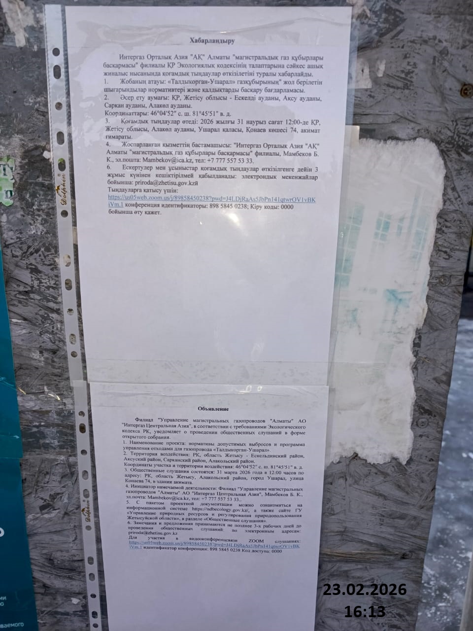4. Повестка дня общественных слушаний: Хабарландыру Интергаз Орталық Азия "АҚ" Алматы "магистральдық газ құбырлары басқармасы" филиалы ҚР Экологиялық кодексінің талаптарына сәйкес ашық жиналыс нысанында қоғамдық тыңдаулар өткізілетіні туралы хабарлайды. 1. Жобаның атауы: «Талдыкорган-Ушарал» газқұбырының" жол берілетін шығарындылар нормативтері және қалдықтарды басқару бағдарламасы. 2. Әсер ету аумағы: ҚР, Жетісу облысы - Ескелді ауданы, Ақсу ауданы, Сарқан ауданы, Алакөл ауданы. Координаттары: 46°04′52″ с. ш. 81°45′51″ в. д. 3. Қоғамдық тыңдаулар өтеді: 2026 жылғы 31 наурыз сағат 12:00-де ҚР, Жетісу облысы, Алакөл ауданы, Ушарал қаласы, Қонаев көшесі 74, акимат ғимараты. 4. Жоспарланған қызметтің бастамашысы: "Интергаз Орталық Азия "АҚ" Алматы "магистральдық газ құбырлары басқармасы" филиалы, Мамбеков Б. К., эл.пошта: Mambekov@ica.kz, тел: +7 777 557 53 33. 6. Ескертулер мен ұсыныстар қоғамдық тыңдаулар өткізілгенге дейін 3 жұмыс күнінен кешіктірілмей қабылданады: электрондық мекенжайлар бойынша: priroda@zhetisu.gov.kzй Тыңдауларға қатысу үшін: https://us05web.zoom.us/j/89858450238?pwd=J4LDjRaAs5JbPn141qtwrOV1vBKiVm.1 конференция идентификаторы: 898 5845 0238; Кіру коды: 0000 бойынша өту қажет. Объявление Филиал "Управление магистральных газопроводов "Алматы" АО "Интергаз Центральная Азия", в соответствии с требованиями Экологического кодекса РК, уведомляет о проведении общественных слушаний в форме открытого собрания. 1. Наименование проекта: нормативы допустимых выбросов и программа управления отходами для газопровода «Талдыкорган-Ушарал». 2. Территория воздействия: РК, область Жетысу - Ескельдинский район, Аксуский район, Сарканский район, Алакольский район. Координаты участка и территории воздействия: 46°04′52″ с. ш. 81°45′51″ в. д. 3. Общественные слушания состоятся: 31 марта 2026 года в 12:00 часов по адресу: РК, область Жетысу, Алакольский район, город Ушарал, улица Конаева 74, в здании акимата. 4. Инициатор намечаемой деятельности: Филиал "Управление магистральных газопроводов "Алматы" АО "Интергаз Центральная Азия", Мамбеков Б. К., эл.почта: Mambekov@ica.kz, тел: +7 777 557 53 33.. 5. С пакетом проектной документации можно ознакомиться на информационной системе https://ndbecology.gov.kz/, а также сайте ГУ «Управление природных ресурсов и регулирования природопользования Жетысуйской области», в разделе «Общественные слушания». 6. Замечания и предложения принимаются не позднее 3-х рабочих дней до проведения общественных слушаний: по электронным адресам: priroda@zhetisu.gov.kz Для участия в видеоконференцсвязи ZOOM слушаниях: https://us05web.zoom.us/j/89858450238?pwd=J4LDjRaAs5JbPn141qtwrOV1vBKiVm.1 идентификатор конференции: 898 5845 0238 Код доступа: 0000