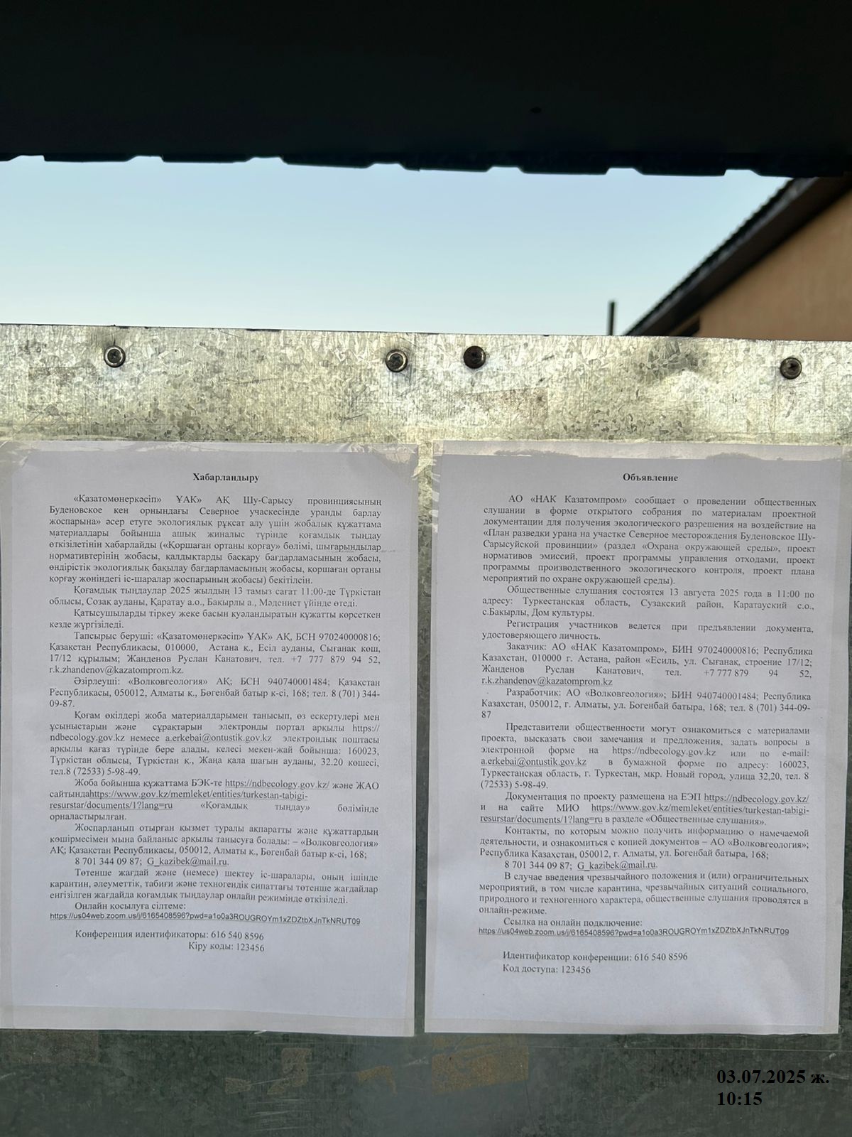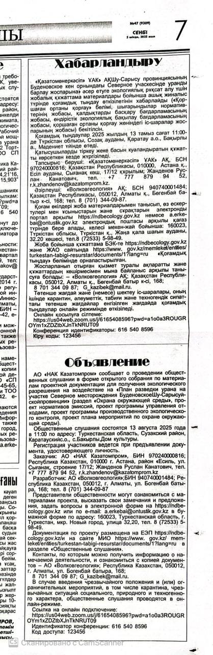 3. Общественные слушания организованны: Управление природных ресурсов и регулирования природопользования Туркестанской области, a.erkebai@ontustik.gov.kz,