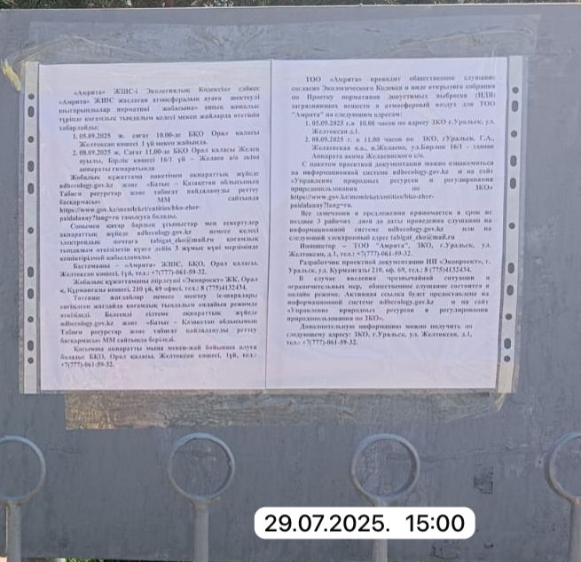 3. Общественные слушания организованны: Управление природных ресурсов и регулирования природопользования Западно-Казахстанской области, zko_forest@bko.gov.kz,