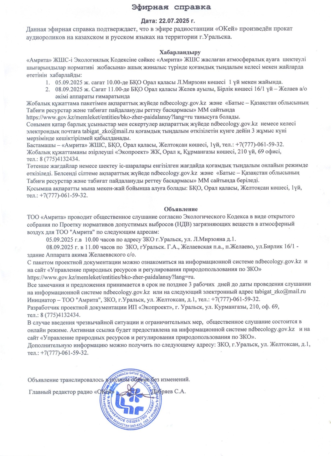 Подтверждающий документ о своевременном размещении объявления о проведении общественных слушаний не менее чем в одном теле- или радиоканале