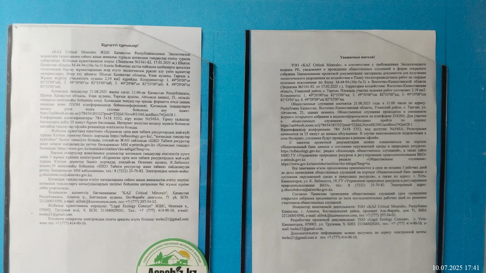 3. Общественные слушания организованны: Управление природных ресурсов и регулирования природопользования Восточно-Казахстанской области, g.zhunisbekova@akimvko.gov.kz,