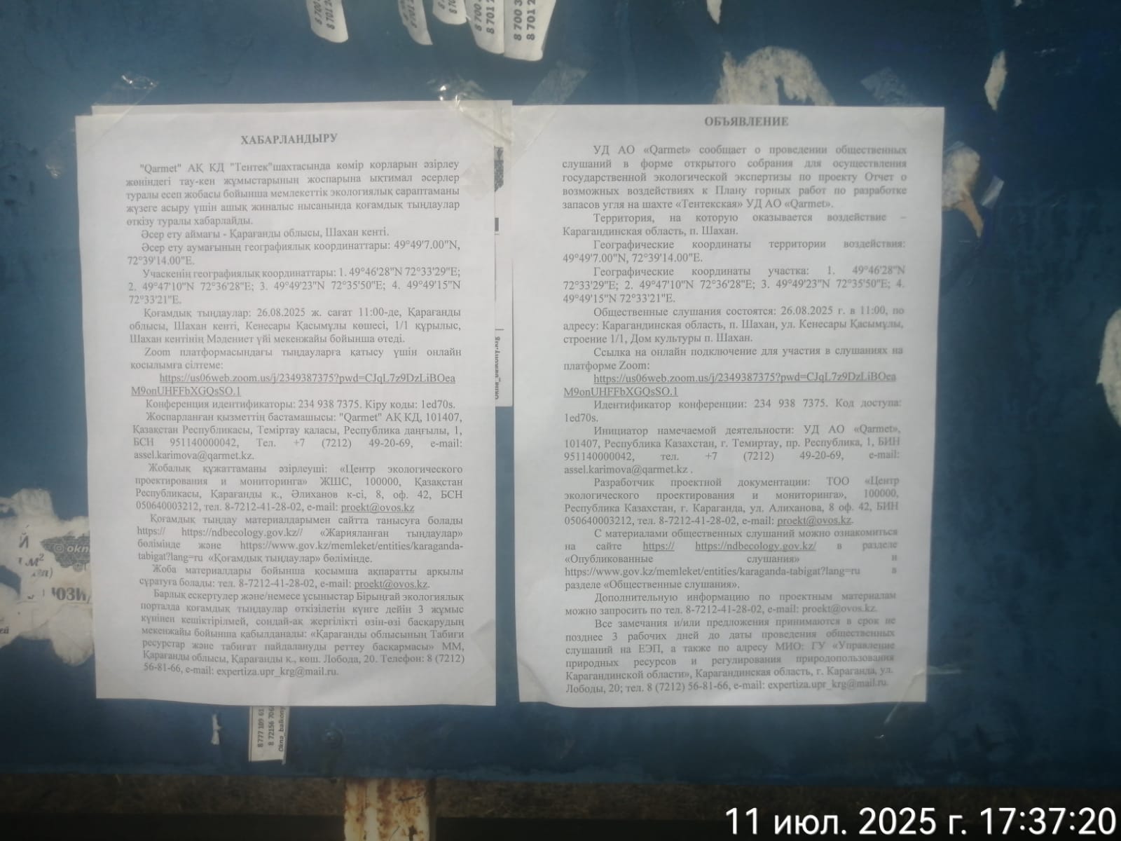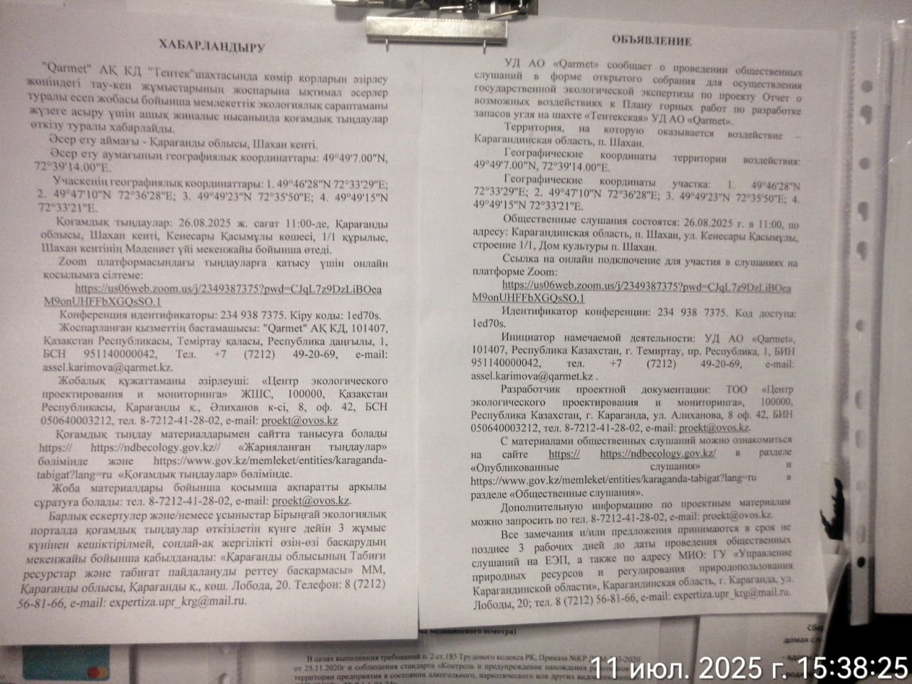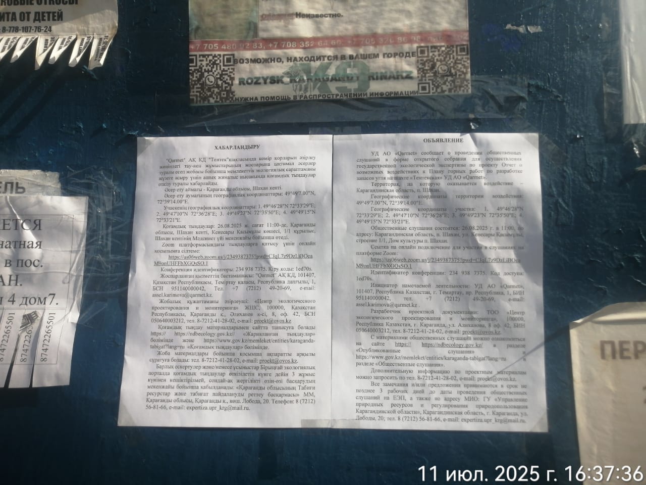 3. Общественные слушания организованны: Управление природных ресурсов и регулирования природопользования Карагандинской области, expertiza.upr_krg@mail.ru,