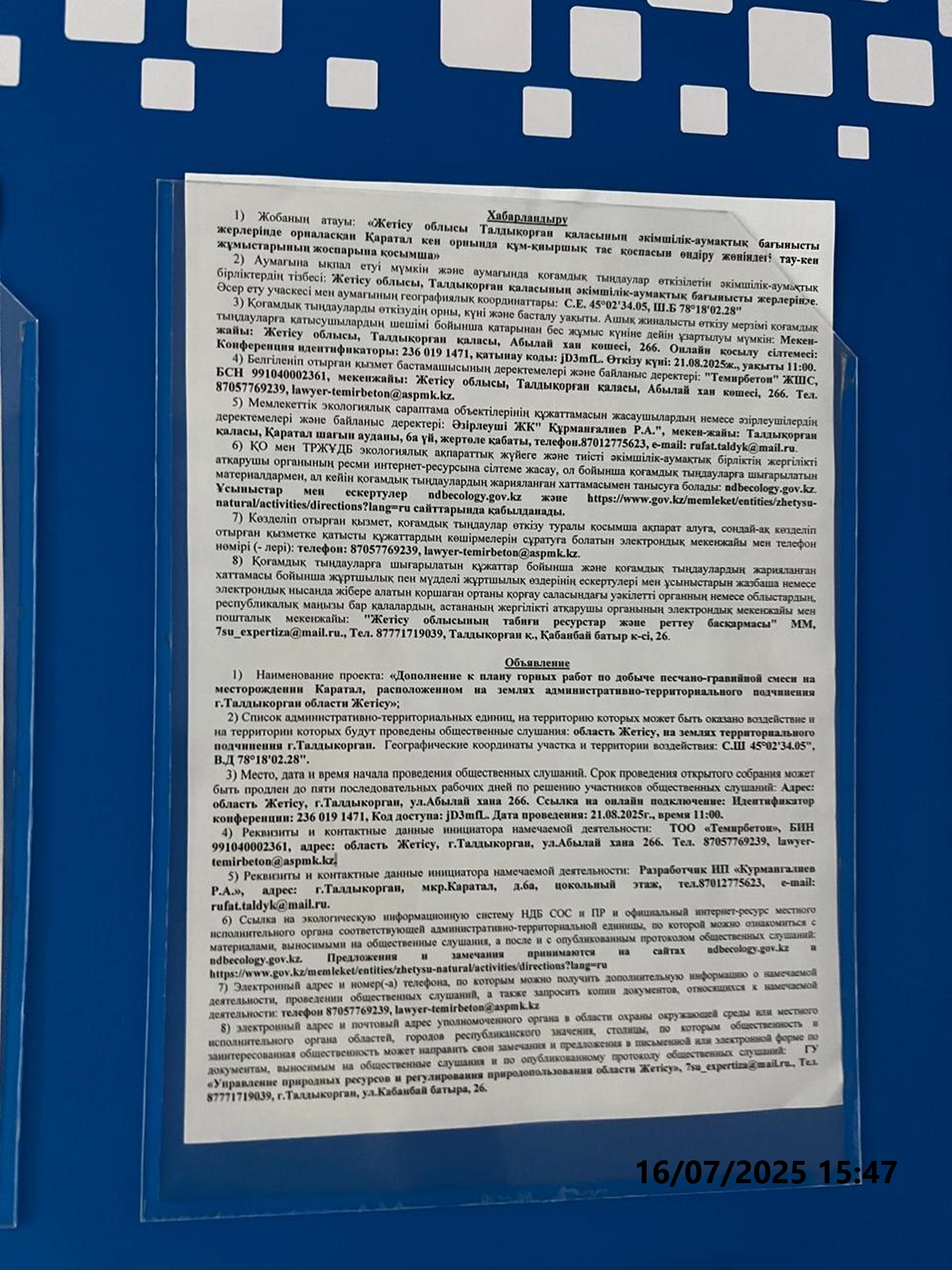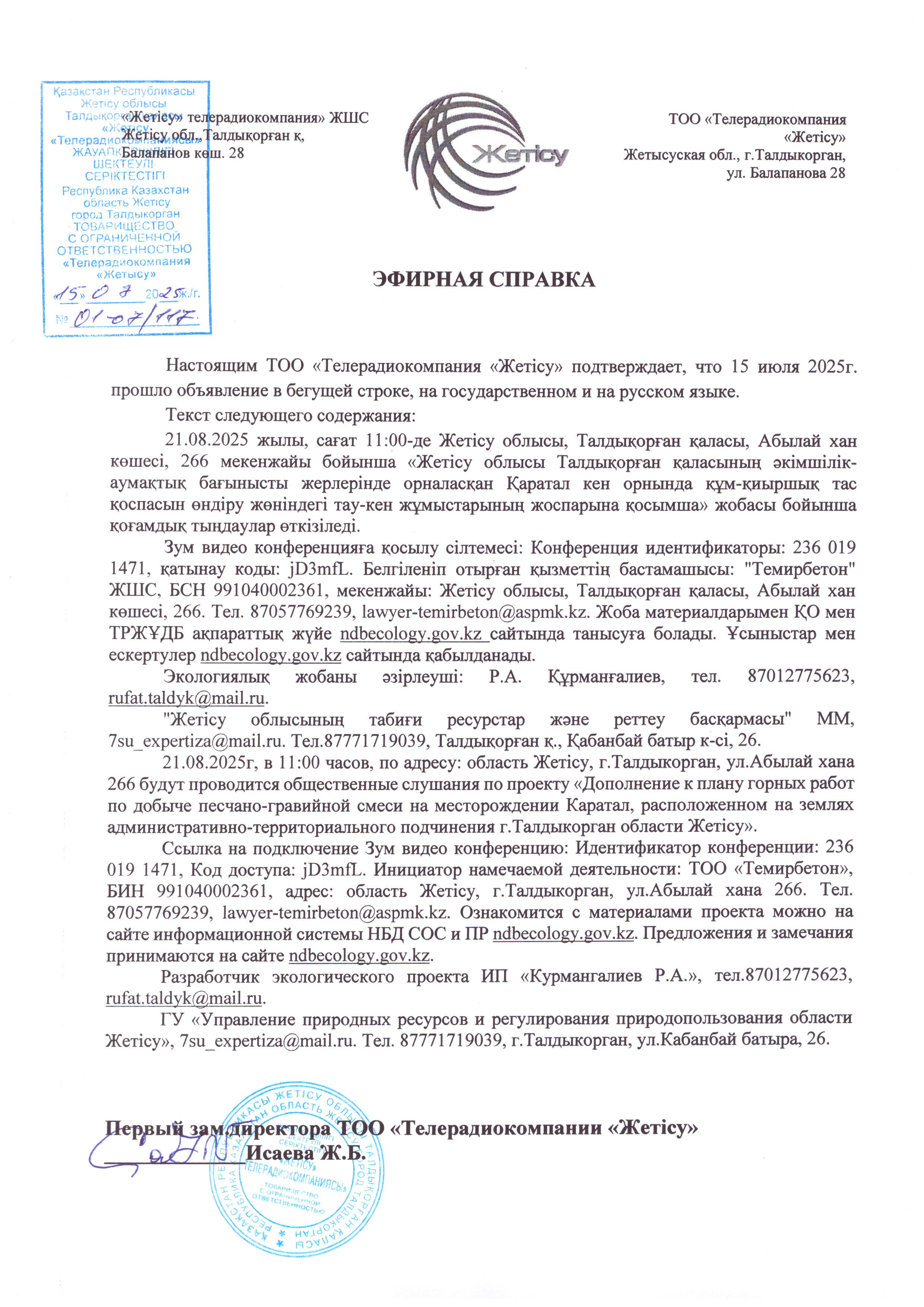 3. Общественные слушания организованны: Главный специалист УПР и ПР Жетысуйской области, priroda@zhetisu.gov.kz,