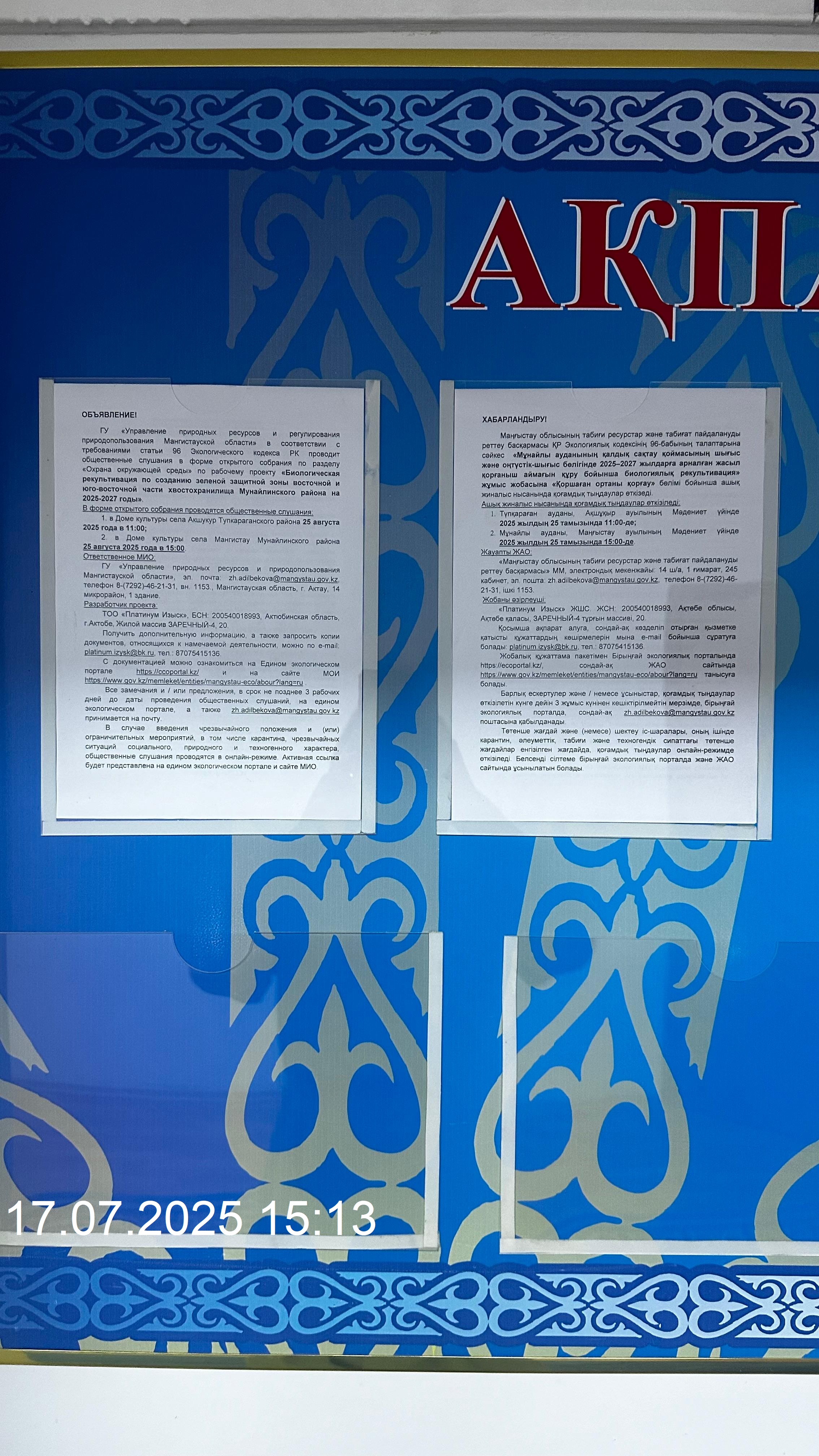 3. Общественные слушания организованны: Управление природных ресурсов и регулирования природопользования Мангистауской области, s.bazarbay@mangystau.gov.kz,
