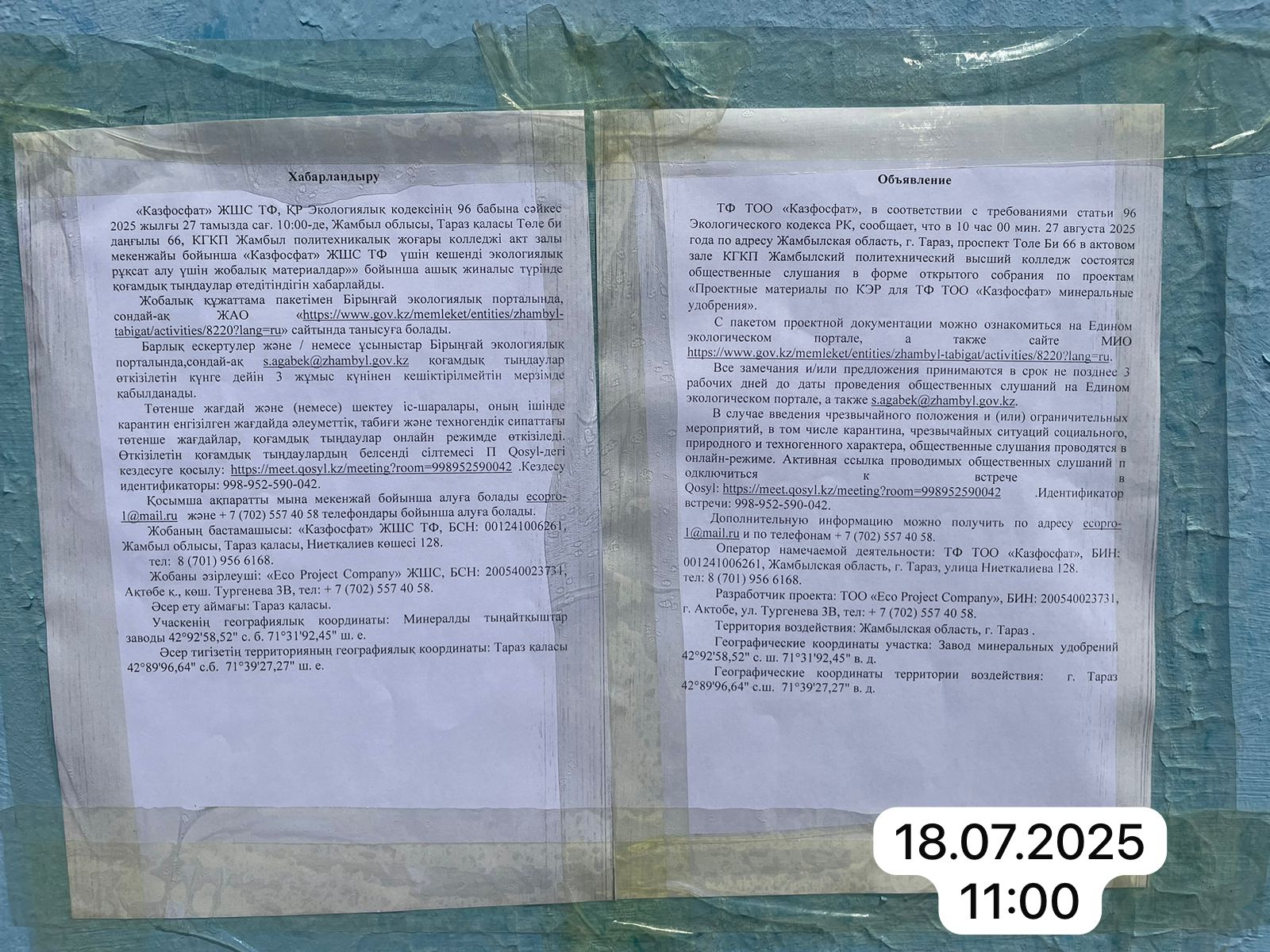 3. Общественные слушания организованны: Управление природных ресурсов и регулирования природопользования Жамбылской области, s.agabek@zhambyl.gov.kz,