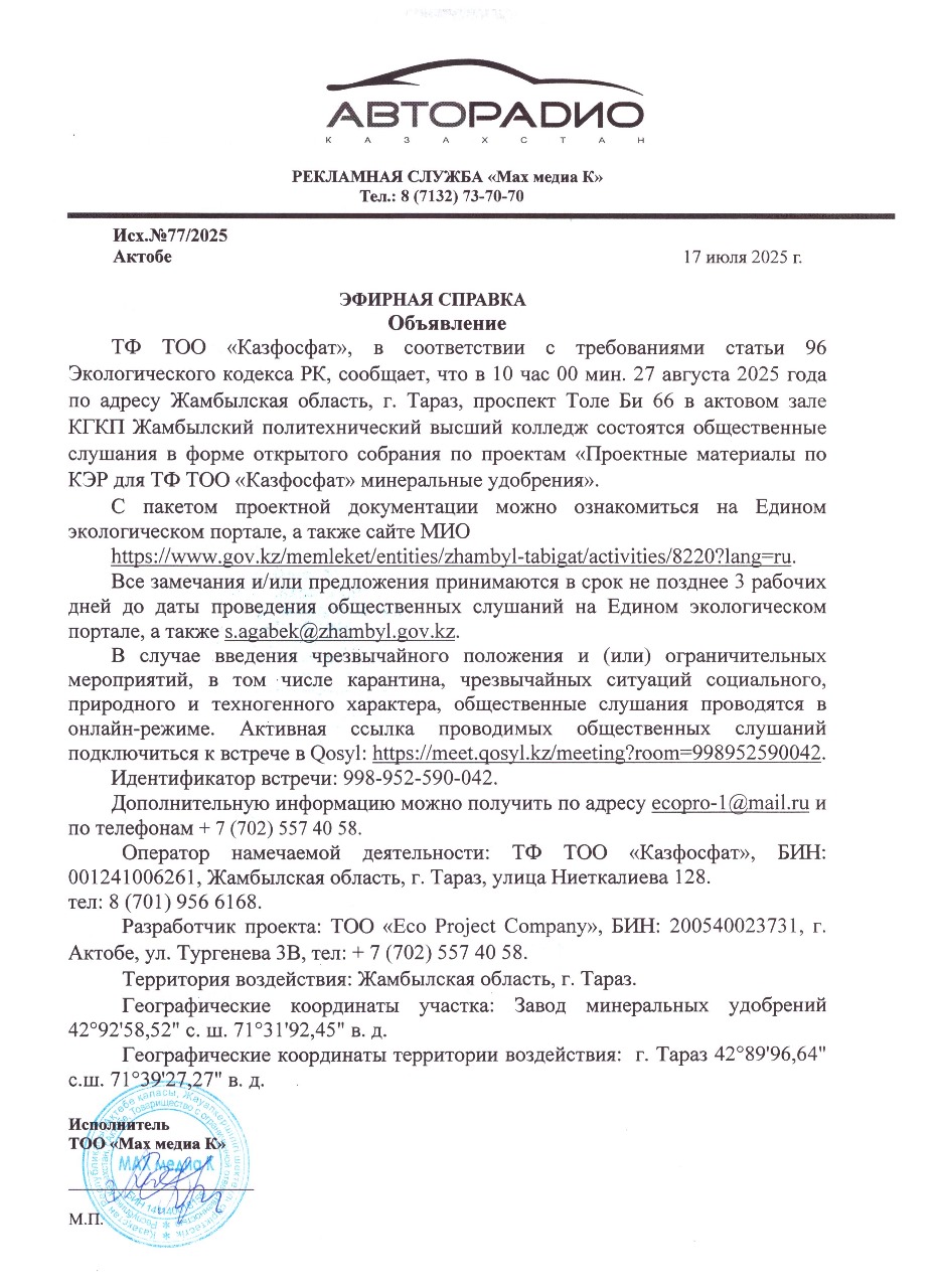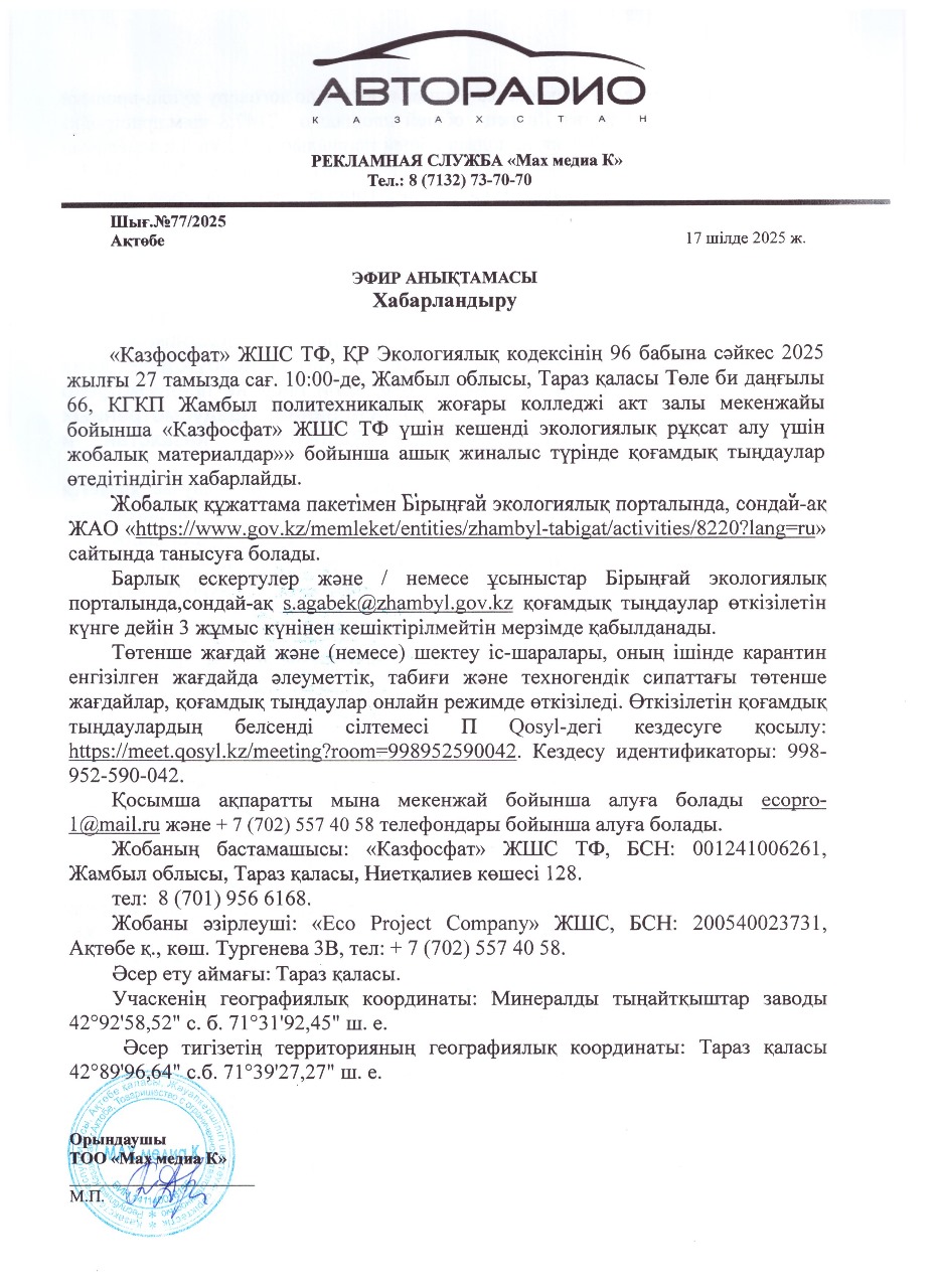 1.4. Описание для подключения к онлайн трансляции при прохождении общественного слушания: Приглашение на запланированную встречу в Qosyl Тема встречи: Товарищество с ограниченной ответственностью ""КАЗФОСФАТ"" Время встречи: 27.08.2025 10:00 Длительность встречи: 01 час. Идентификатор встречи: 998-952-590-042 Подключиться к встрече в Qosyl: https://meet.qosyl.kz/meeting?room=998952590042
