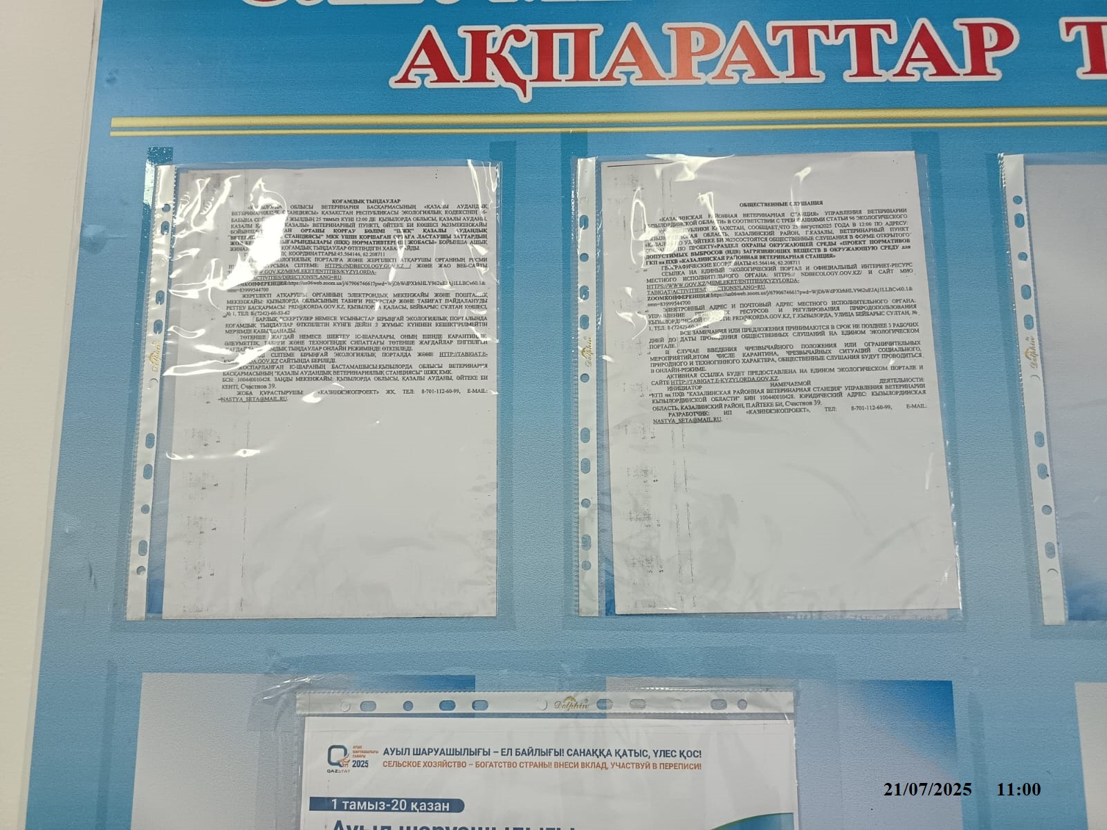 6.3. расположение мест, специально предназначенных для Размещения печатных объявлений (доски объявлений): доска объявлений здания Акимата