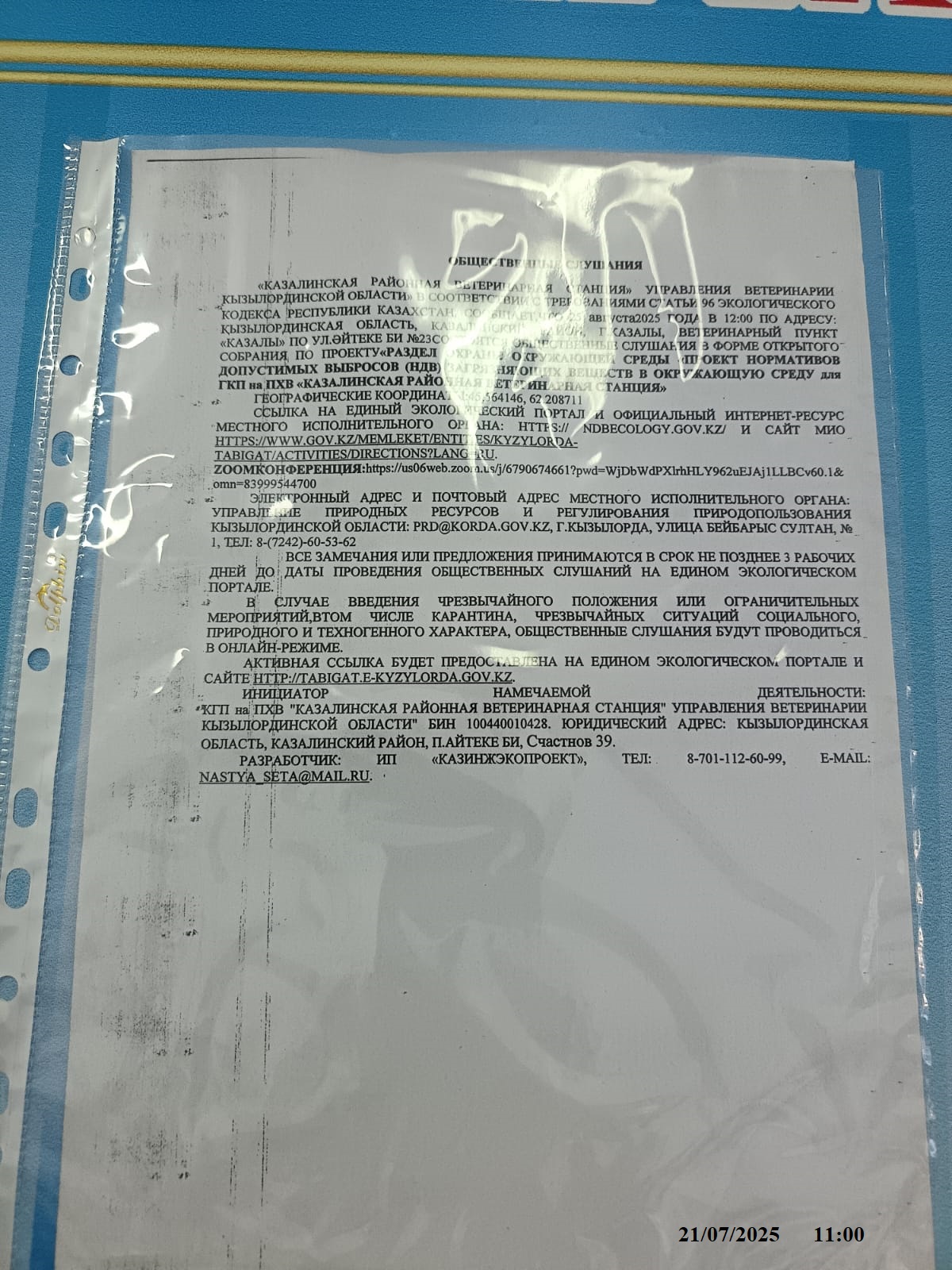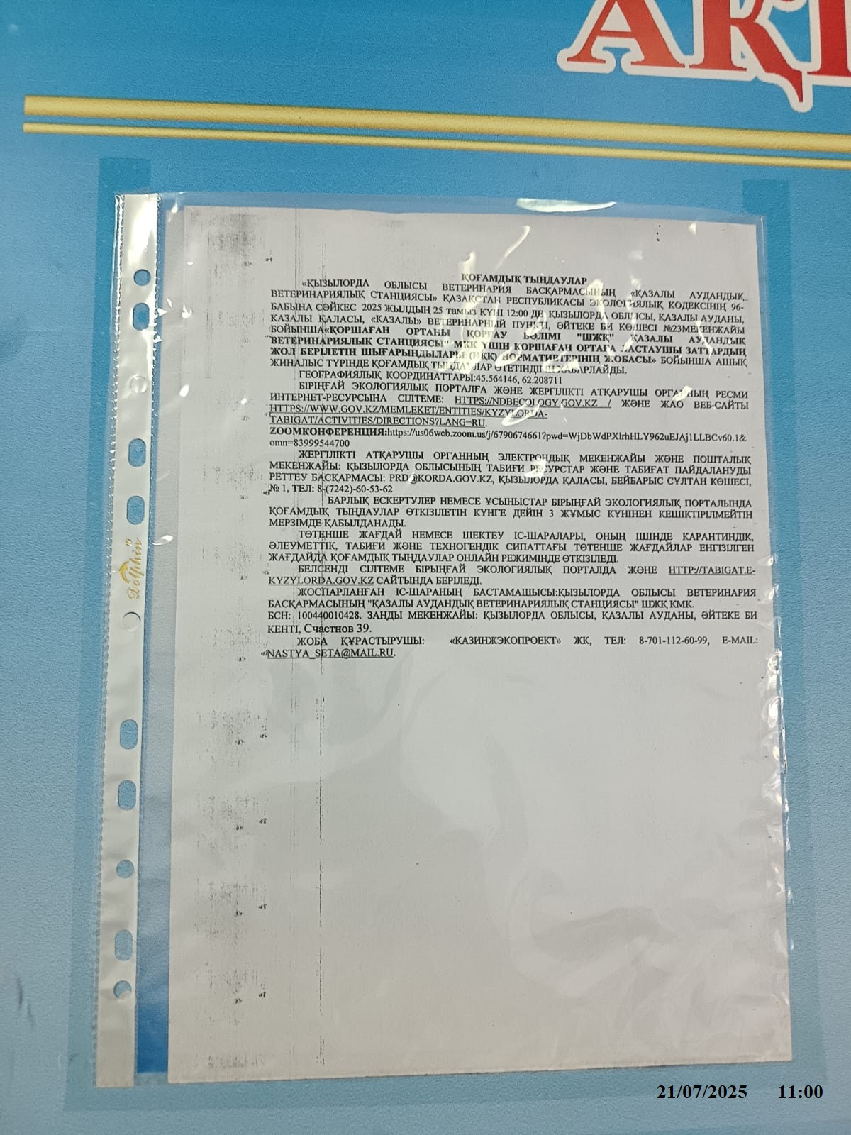 3. Общественные слушания организованны: Управление природных ресурсов и регулирования природопользования Кызылординской области, prd@korda.gov.kz 87242605362, 605369,