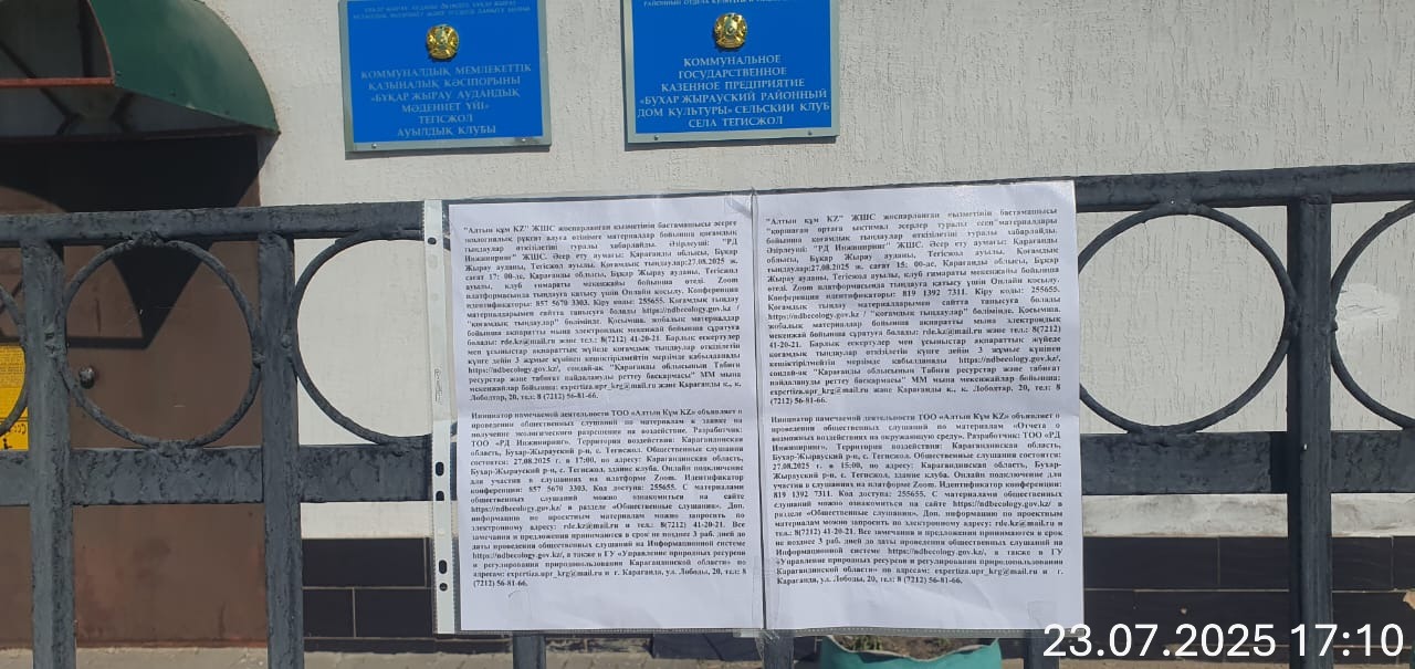 1.2. Место проведения: Карагандинская область, Бухар-Жырауский район, Самаркандский с.о., с. Тегизжол, здание клуба (примечание: в данном населенном пункте не имеется обозначений названий улиц и нумерация домов не производится). Ссылка на онлайн подключение для участия в слушаниях на платформе Zoom: https://us06web.zoom.us/j/81913927311?pwd=bklA2t4S5yA1uDVp2ShCTqXYLjEw66.1. Идентификатор конференции: 819 1392 7311. Код доступа: 255655