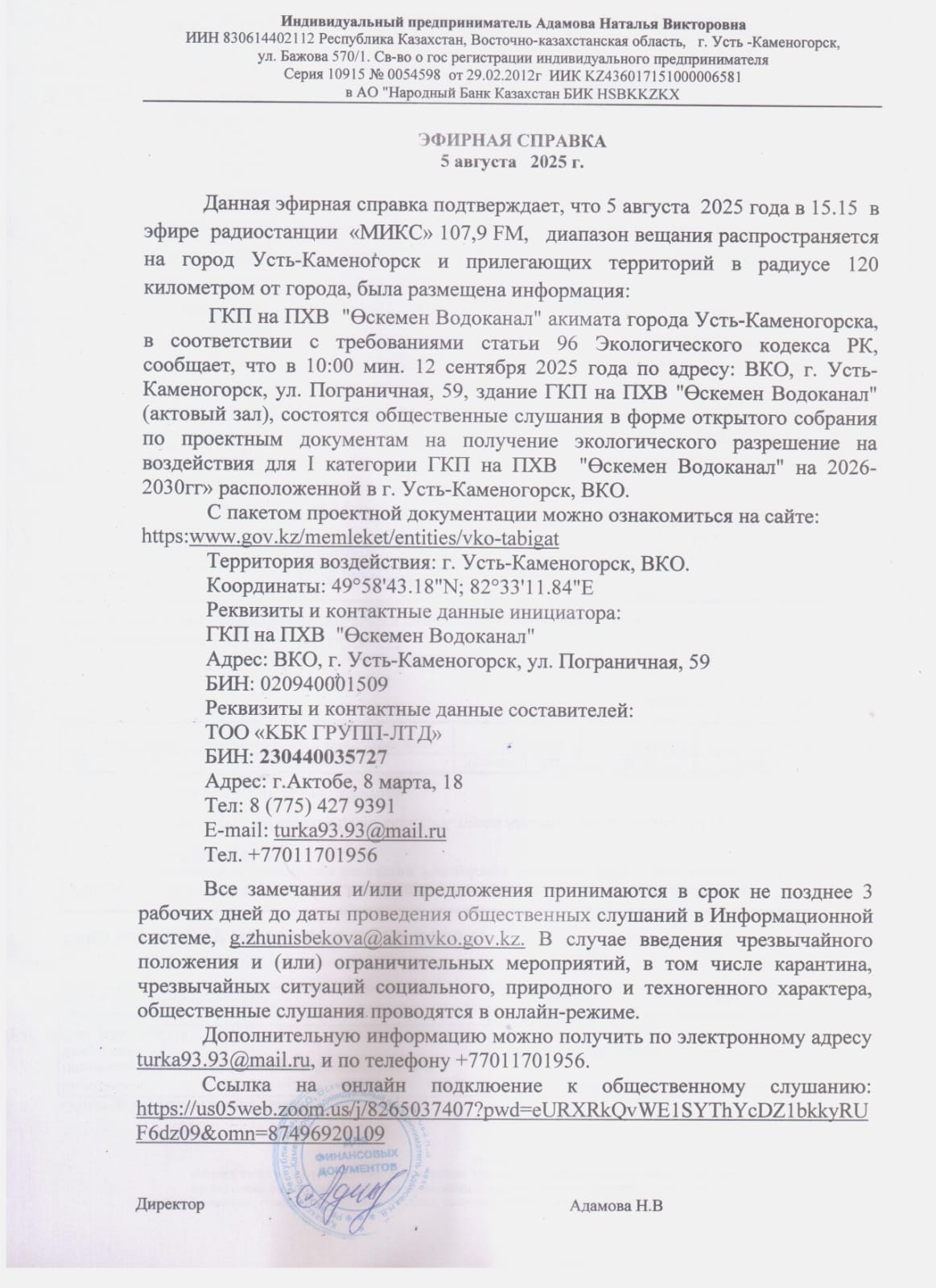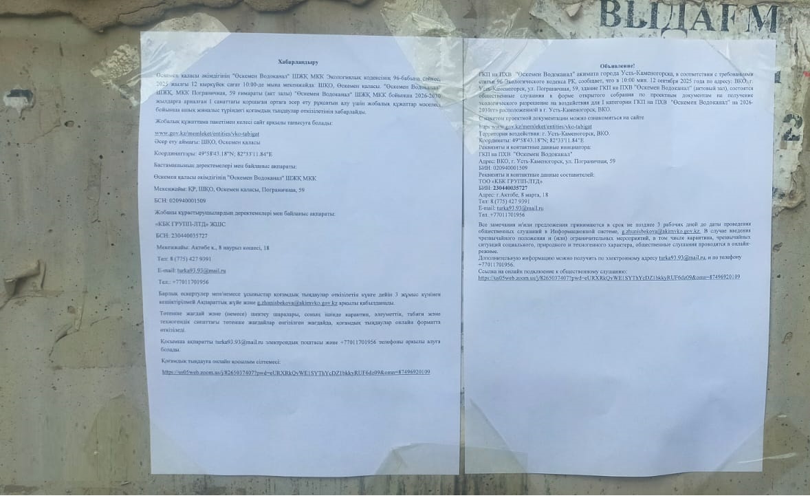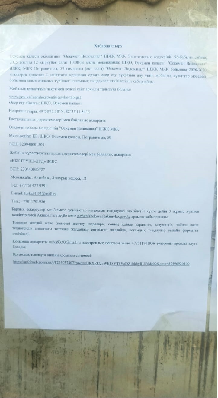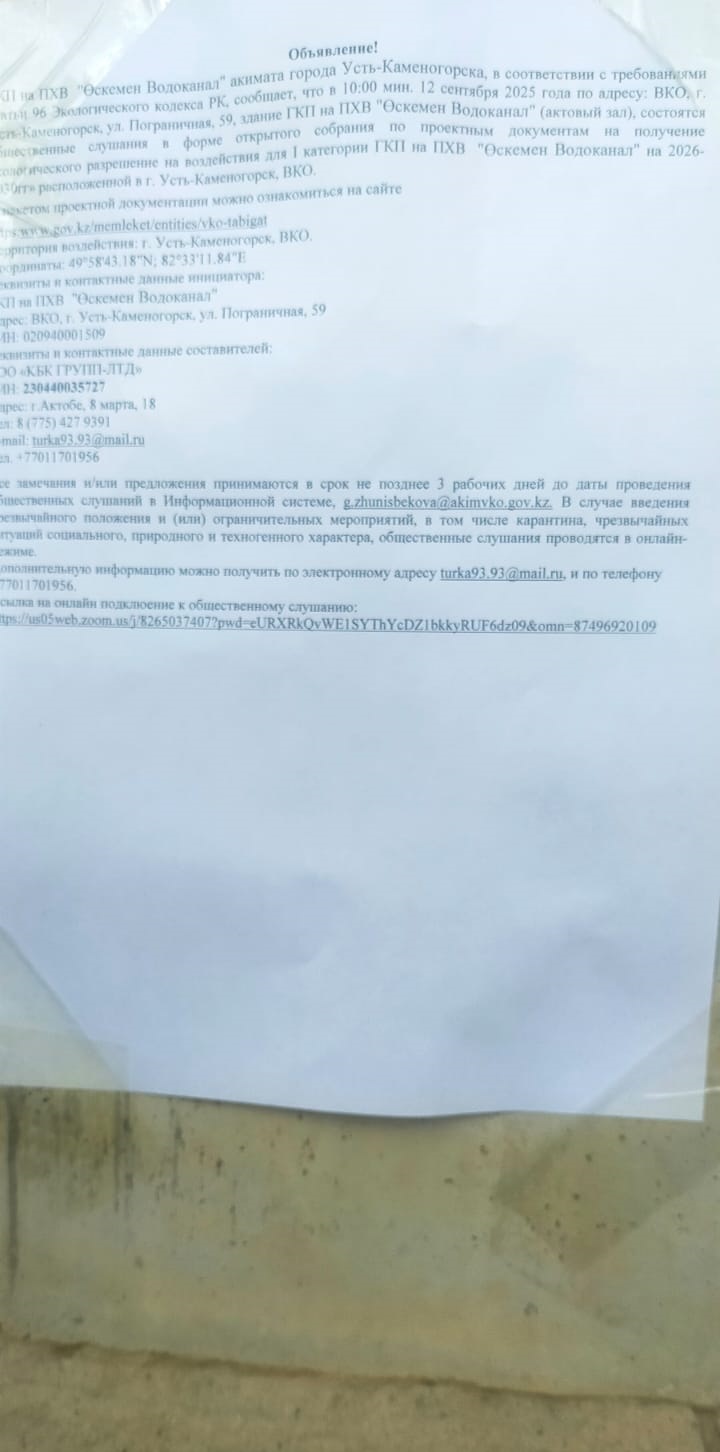 4. Повестка дня общественных слушаний: Өскемен қаласы әкімдігінің "Өскемен Водоканал" ШЖҚ МКК Экологиялық кодексінің 96-бабына сәйкес, 2025 жылғы 12 қыркүйек сағат 10:00-де мына мекенжайда: ШҚО, Өскемен қаласы. "Өскемен Водоканал" ШЖҚ, МКК Пограничная, 59 ғимараты (акт залы) "Өскемен Водоканал" ШЖҚ МКК бойынша 2026-2030 жылдарға арналған I санаттағы қоршаған ортаға әсер ету рұқсатын алу үшін жобалық құжаттар мәселесі бойынша ашық жиналыс түріндегі қоғамдық тыңдаулар өткізілетінін хабарлайды. Жобалық құжаттама пакетімен келесі сайт арқылы танысуға болады: www.gov.kz/memleket/entities/vko-tabigat Әсер ету аймағы: ШҚО, Өскемен қаласы Координаттары: 49°58'43.18"N; 82°33'11.84"E Бастамашының деректемелері мен байланыс ақпараты: Өскемен қаласы әкімдігінің "Өскемен Водоканал" ШЖҚ МКК Мекенжайы: ҚР, ШҚО, Өскемен қаласы, Пограничная, 59 БСН: 020940001509 Жобаны құрастырушылардың деректемелері мен байланыс ақпараты: «КБК ГРУПП-ЛТД» ЖШС БСН: 230440035727 Мекенжайы: Ақтөбе қ., 8 наурыз көшесі, 18 Тел: 8 (775) 427 9391 E-mail: turka93.93@mail.ru Тел.: +77011701956 Барлық ескертулер мен/немесе ұсыныстар қоғамдық тыңдаулар өткізілетін күнге дейін 3 жұмыс күнінен кешіктірілмей Ақпараттық жүйе және g.zhunisbekova@akimvko.gov.kz арқылы қабылданады. Төтенше жағдай және (немесе) шектеу шаралары, соның ішінде карантин, әлеуметтік, табиғи және техногендік сипаттағы төтенше жағдайлар енгізілген жағдайда, қоғамдық тыңдаулар онлайн форматта өткізіледі. Қосымша ақпаратты turka93.93@mail.ru электрондық поштасы және +77011701956 телефоны арқылы алуға болады. Қоғамдық тыңдауға онлайн қосылым сілтемесі: https://us05web.zoom.us/j/8265037407?pwd=eURXRkQvWE1SYThYcDZ1bkkyRUF6dz09&omn=87496920109 ГКП на ПХВ "Өскемен Водоканал" акимата города Усть-Каменогорска, в соответствии с требованиями статьи 96 Экологического кодекса РК, сообщает, что в 10:00 мин. 12 сентября 2025 года по адресу: ВКО, г. Усть-Каменогорск, ул. Пограничная, 59, здание ГКП на ПХВ "Өскемен Водоканал" (актовый зал), состоятся общественные слушания в форме открытого собрания по проектным документам на получение экологического разрешение на воздействия для I категории ГКП на ПХВ "Өскемен Водоканал" на 2026-2030гг» расположенной в г. Усть-Каменогорск, ВКО. С пакетом проектной документации можно ознакомиться на сайте https:www.gov.kz/memleket/entities/vko-tabigat Территория воздействия: г. Усть-Каменогорск, ВКО. Координаты: 49°58'43.18"N; 82°33'11.84"E Реквизиты и контактные данные инициатора: ГКП на ПХВ "Өскемен Водоканал" Адрес: ВКО, г. Усть-Каменогорск, ул. Пограничная, 59 БИН: 020940001509 Реквизиты и контактные данные составителей: ТОО «KБК ГРУПП-ЛТД» БИН: 230440035727 Адрес: г.Актобе, 8 марта, 18 Тел: 8 (775) 427 9391 E-mail: turka93.93@mail.ru Тел. +77011701956 Все замечания и/или предложения принимаются в срок не позднее 3 рабочих дней до даты проведения общественных слушаний в Информационной системе, g.zhunisbekova@akimvko.gov.kz. В случае введения чрезвычайного положения и (или) ограничительных мероприятий, в том числе карантина, чрезвычайных ситуаций социального, природного и техногенного характера, общественные слушания проводятся в онлайн-режиме. Дополнительную информацию можно получить по электронному адресу turka93.93@mail.ru, и по телефону +77011701956. Ссылка на онлайн подклюение к общественному слушанию: https://us05web.zoom.us/j/8265037407?pwd=eURXRkQvWE1SYThYcDZ1bkkyRUF6dz09&omn=87496920109