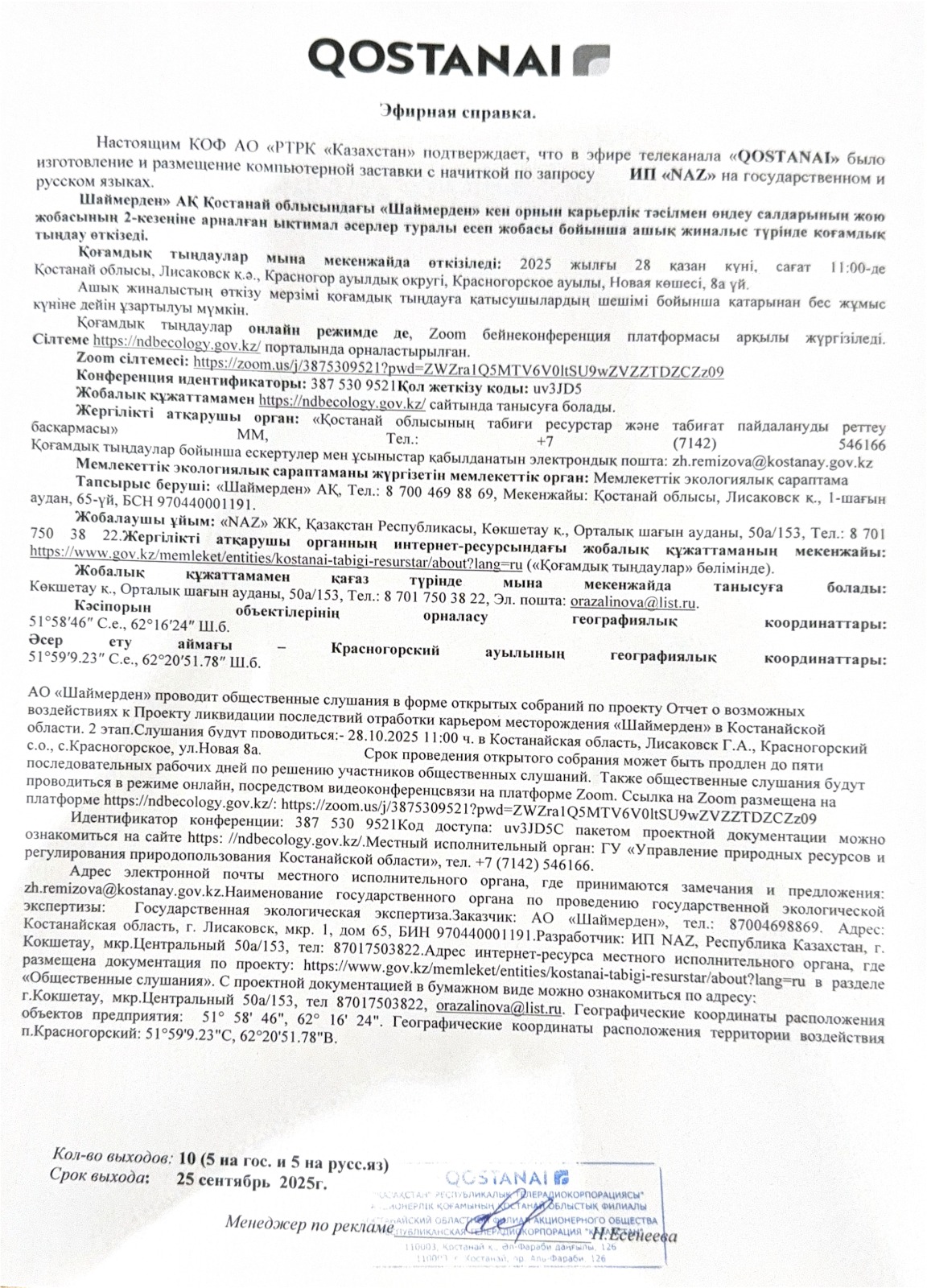 4. Повестка дня общественных слушаний: Намечаемая деятельность – ликвидация последствий отработки карьером месторождения Шаймерден в Костанайской области. 2 этап. Основным видом деятельности предприятия на существующее положение является дробление и отгрузка свинцово-цинковой руды из рудного отвала, без проведения горных работ. Участок нарушенных земель площадью 78,99 га расположен на территории Камыстинского района Костанайской области, в 200 км к юго-западу от областного центра г. Костанай. Ближайшие от месторождения населенные пункты – поселок Красногорский расположен в 6 км к юго-востоку и поселок Краснооктябрьский в 14 км к северо-востоку от месторождения, районный центр Камысты расположен в 50 км к западу. Карьер месторождения Шаймерден представляет собой выработанное пространство глубиной до 207 м. Карьерное поле по форме близкое к округлой. Диаметр карьера по верху достигает 870 м. Размеры дна: 49 м х 20 м. Максимальная отметка поверхности +247 м; отметка дна карьера +40 м. Вскрышные породы, попутно извлеченные в прошлом из недр при отработке запасов, складированы в породном отвале на поверхности, в 780 м к востоку от выработанного пространства. Разработка карьера месторождения Шаймерден завершена в 2011 году. Остаток добытых непереработанных запасов сосредоточен в рудном отвале, из которого в настоящее время производится дробление и отгрузка руды. Рудный отвал представляет собой склад балансовой руды высотой до 10 м. Отвал разделен на три участка №21, №22 и №23, участок №22 на данный момент практически полностью переработан. Между участком №23, расположенным севернее участков №21 и №22, проходит автодорога. Содержание цинка в отвалах №21, 22, 23 оценивается как, соответственно, свыше 25%, 15-25%, 5-15%. С южной стороны к балансовому рудному отвалу прилегает отвал забалансовых руд с содержанием менее 5%. Горные работы завершены во II квартале 2011 года, карьер отработан до проектной глубины. На площади горного отвода выемка руды из карьера полностью завершена и начаты добычные работы со спецотвала. Ликвидационные работы в карьере и рекультивация отвала рыхлых пород произведены согласно «Проекта ликвидации карьера Шаймерден месторождения Шаймерден». В 2012 году выполнен 1 этап ликвидационных работ на месторождении. После завершения горных работ во II квартале 2011 г. и выполнения 1 этапа работ по ликвидации с оставшихся рудных отвалов начато дробление и отгрузка руды (сырья). В настоящее время завершаются работы по дроблению и отгрузки руды (сырья) с рудных отвалов на основании «Плана работ по дроблению и вывоза свинцово-цинковых руд месторождения «Шаймерден» с рудного склада, в рамках ликвидации последствий операций по недропользованию». Ликвидационные работы 1-го этапа в карьере и рекультивация отвала рыхлых пород произведены согласно Проекту ликвидации карьера Шаймерден месторождения Шаймерден». В 2023 году разработан План ликвидации и получены согласования в области промышленной безопасности и экологическое заключение. 17 июля 2023 года было проведено обследование земельного участка (Акт обследования нарушенных (подлежащих нарушению) земель, подлежащих рекультивации от 17 июля 2023 года). В результате обследования установлено, что в процессе эксплуатации месторождения Шаймерден нарушению поверхностного покрова подлежали земли отвального 