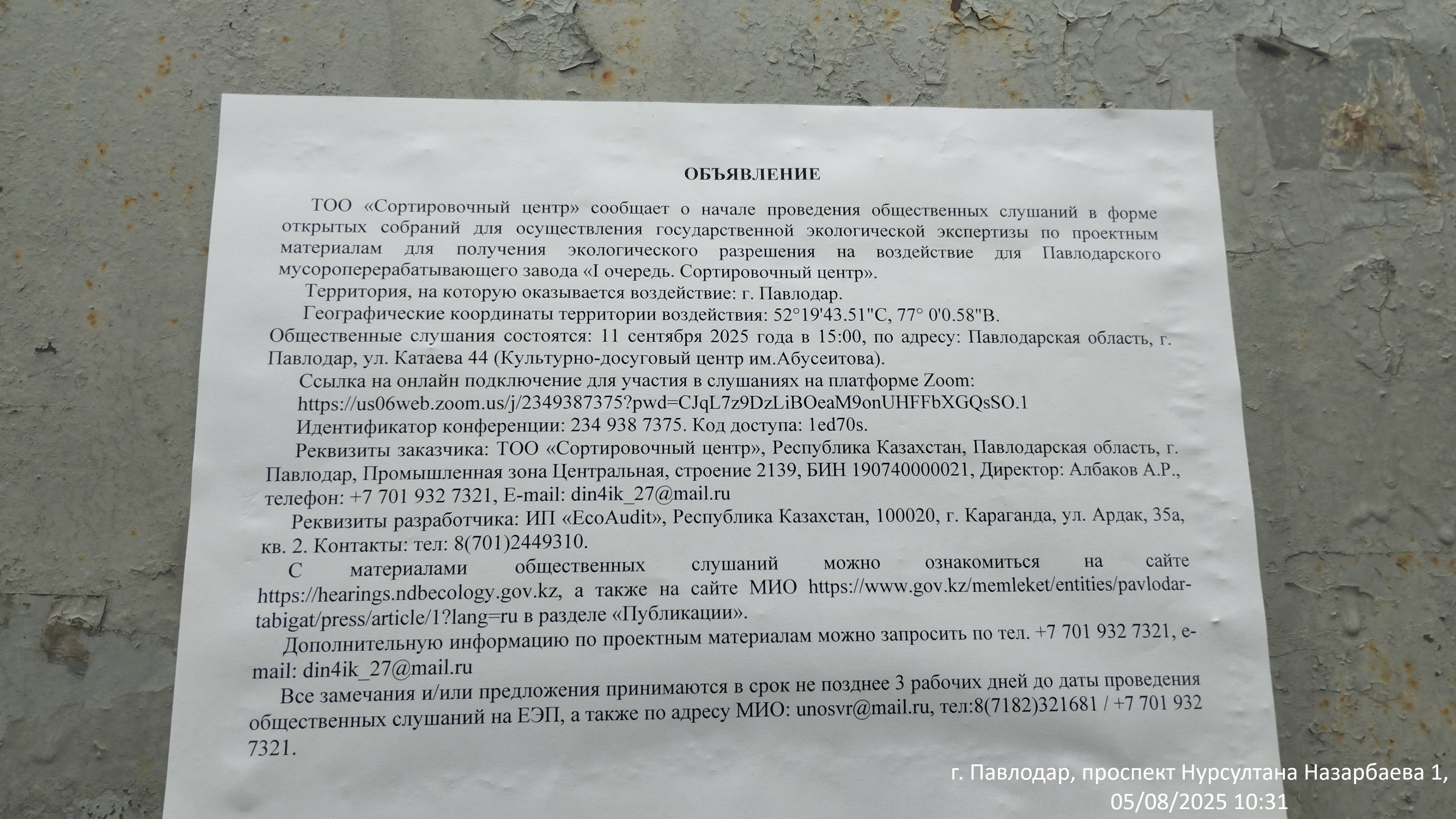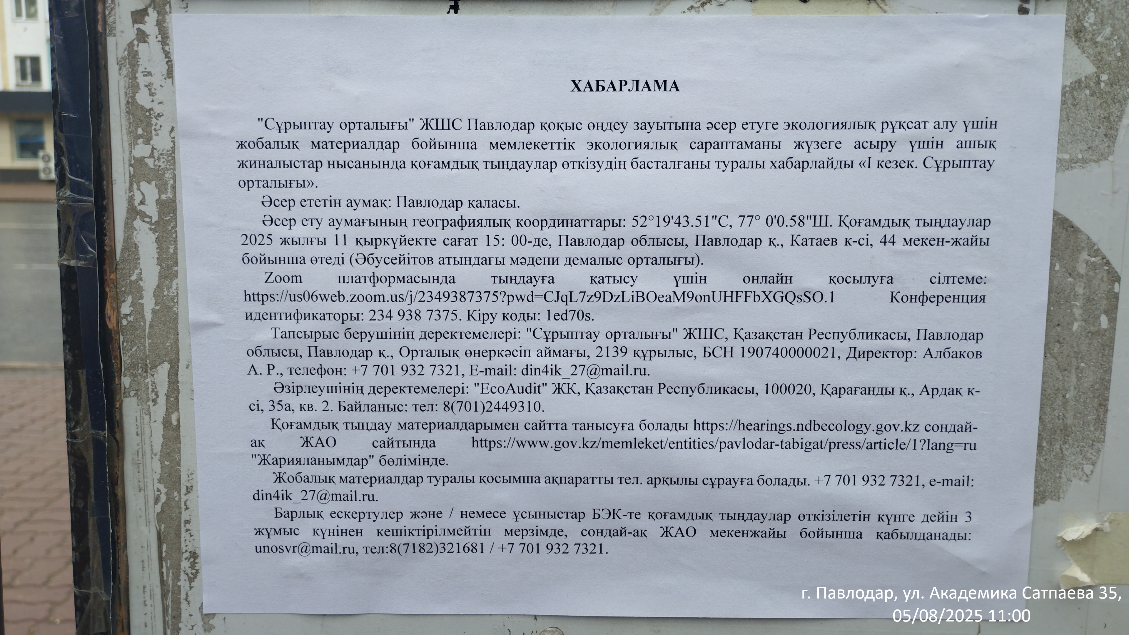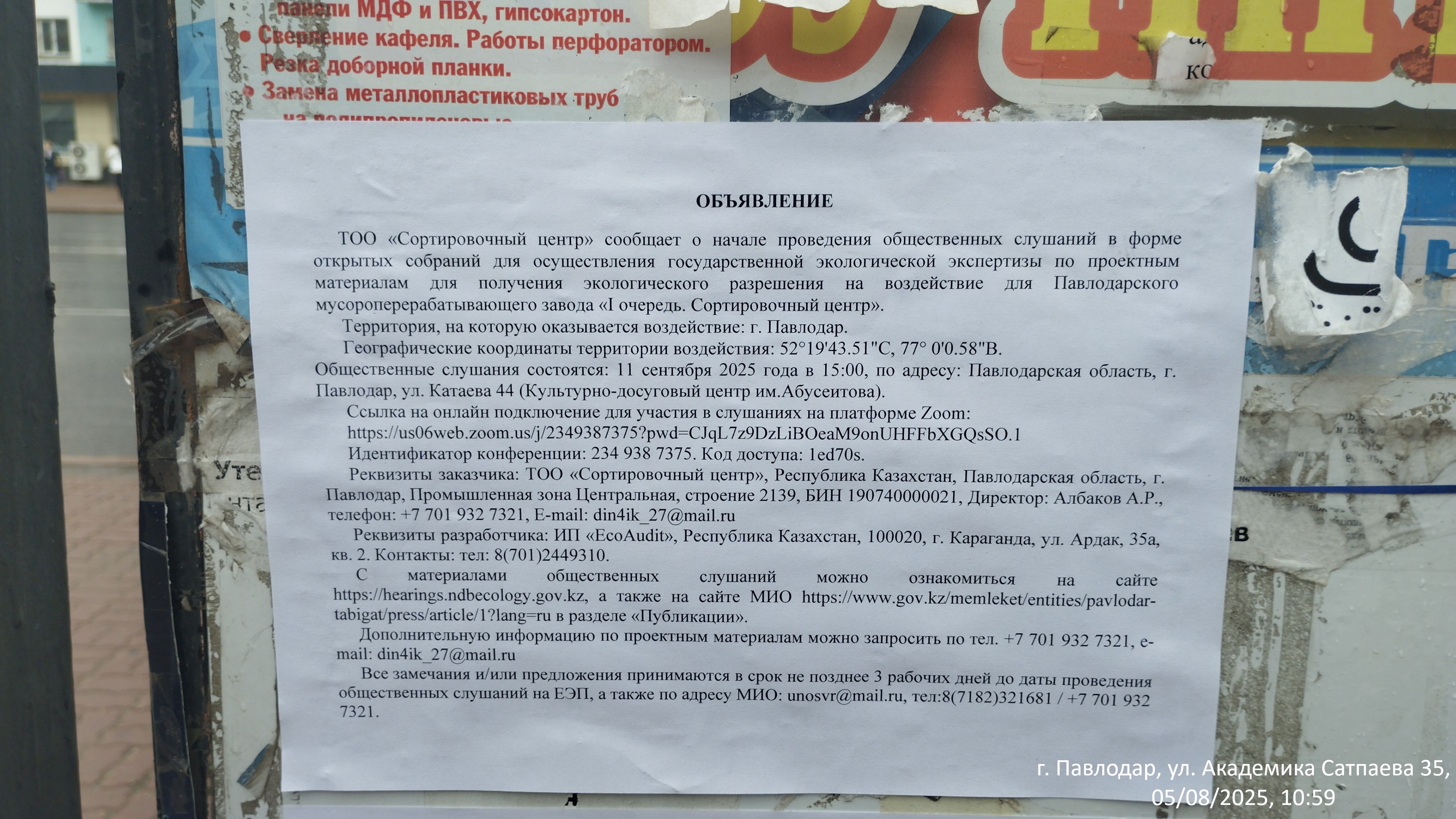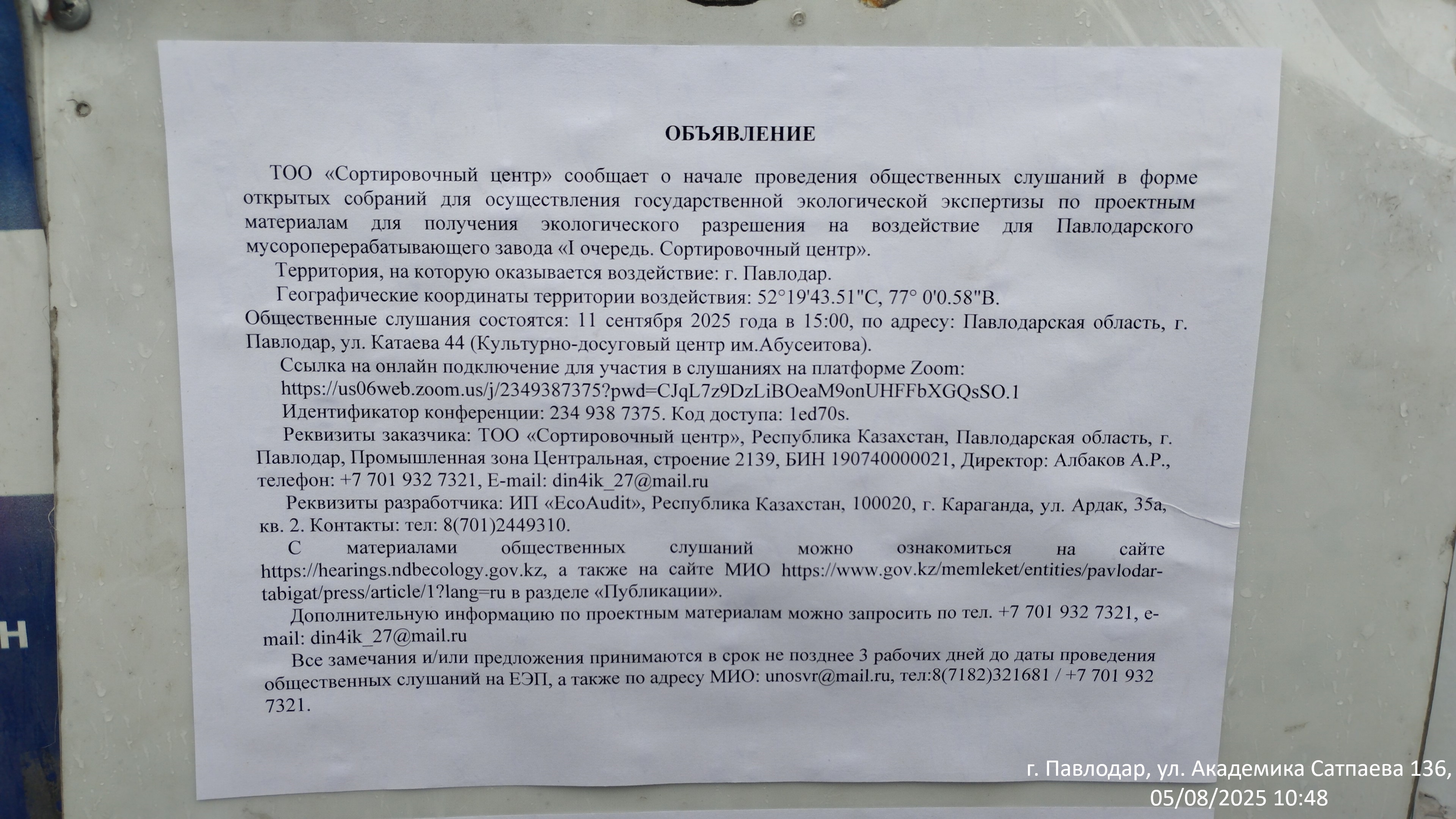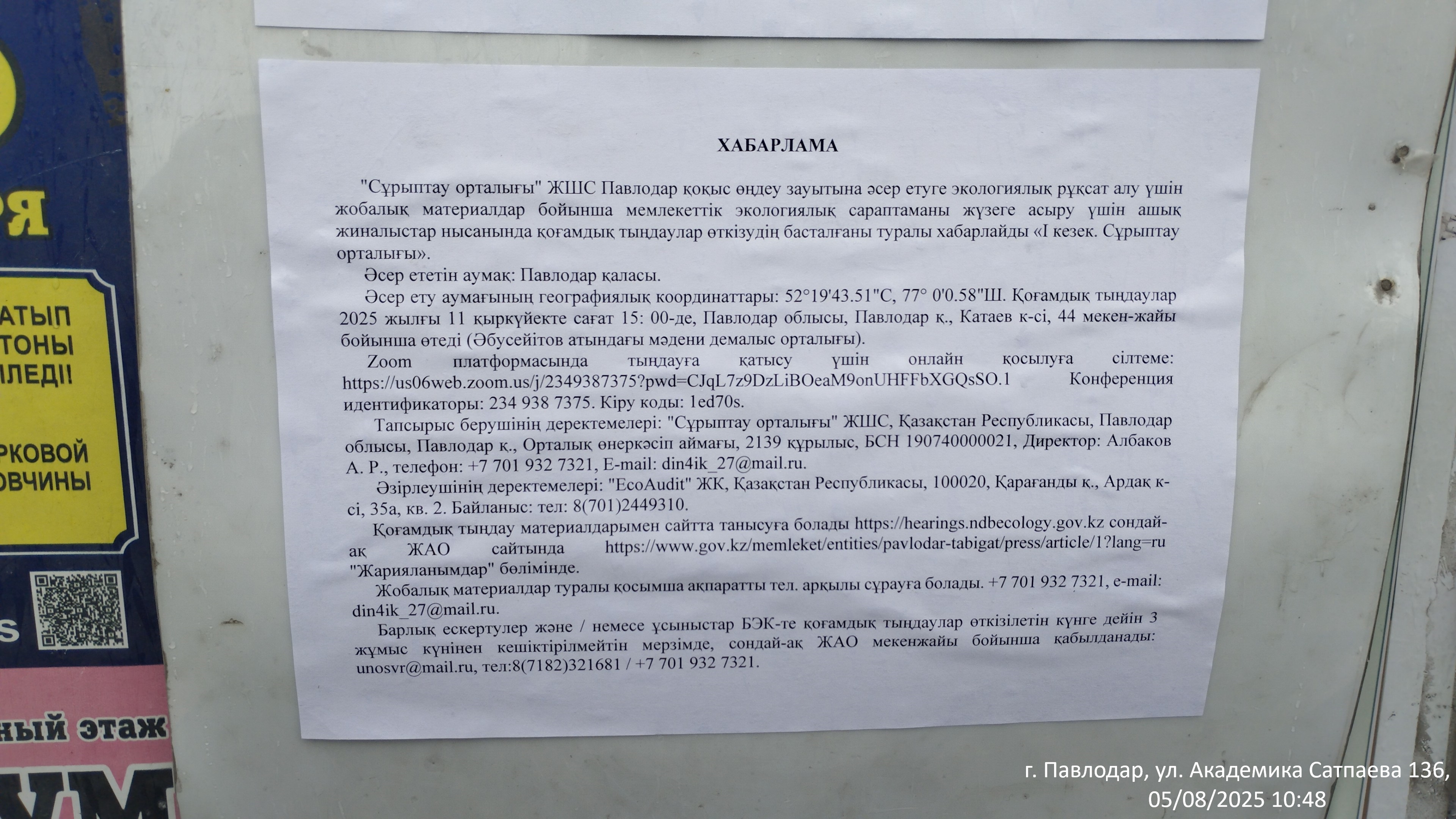 6.3. расположение мест, специально предназначенных для Размещения печатных объявлений (доски объявлений): Павлодарская область, г.Павлодар, Ул. Академика Сатпаева 136 (доска объявлений)
