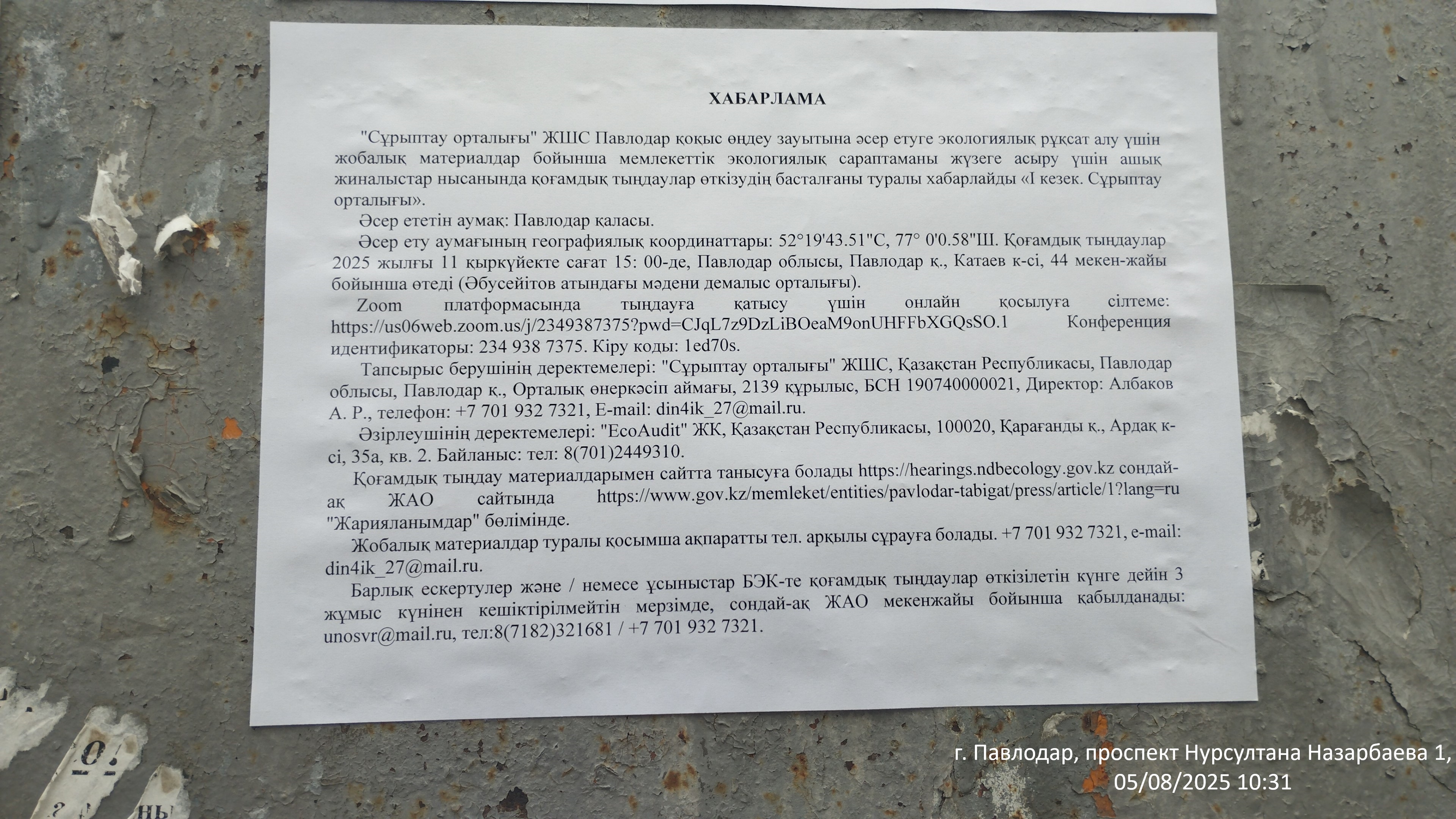 3. Общественные слушания организованны: УПРАВЛЕНИЕ НЕДРОПОЛЬЗОВАНИЯ, ОКРУЖАЮЩЕЙ СРЕДЫ И ВОДНЫХ РЕСУРСОВ ПАВЛОДАРСКОЙ ОБЛАСТИ, unosvr@mail.ru, 87182321681,
