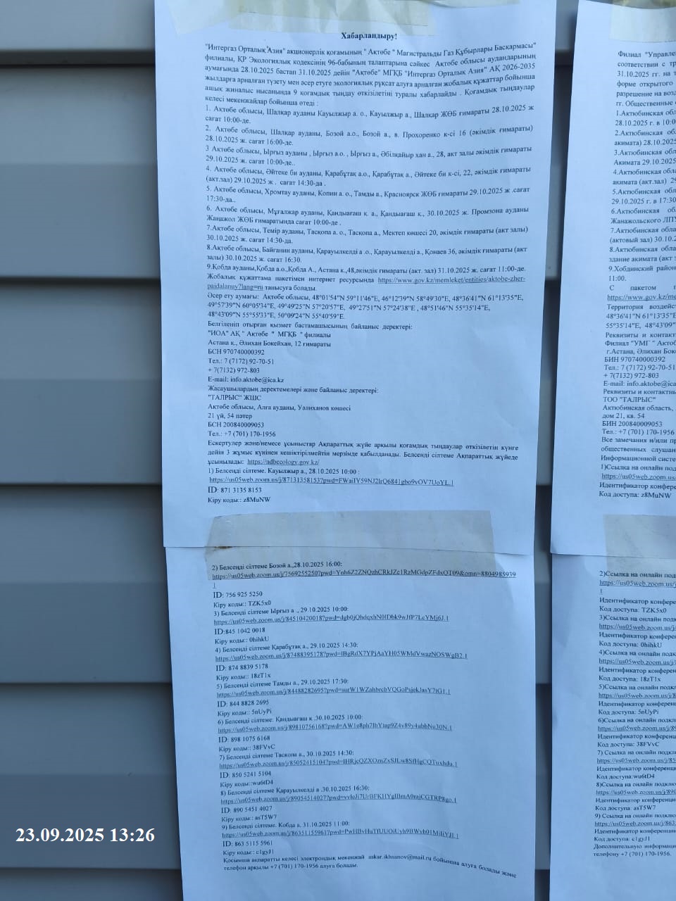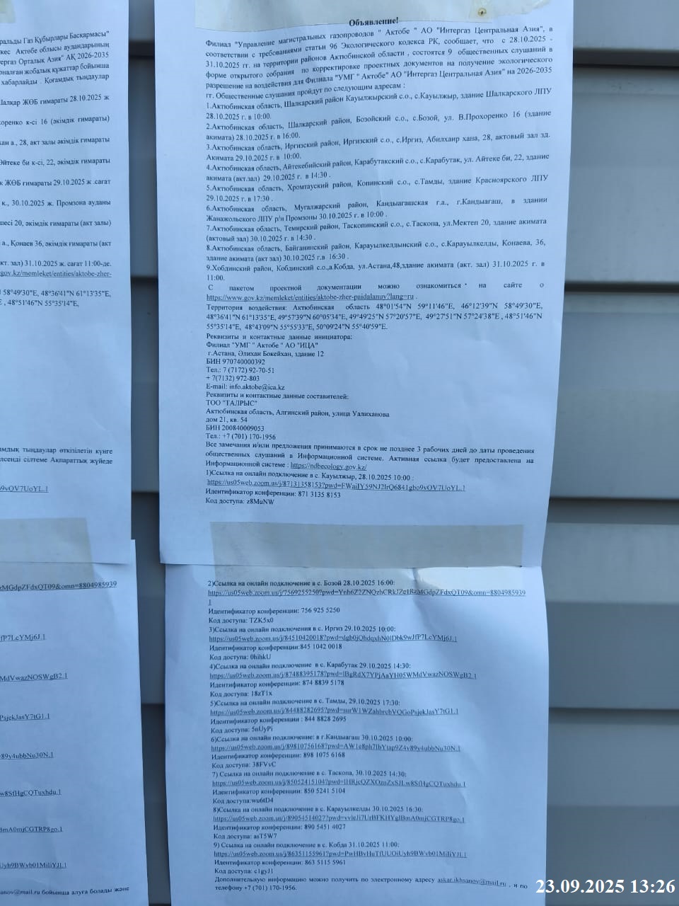 4. Повестка дня общественных слушаний: Управление магистральных газопроводов (УМГ) «Актобе» осуществляет оперативную эксплуатацию и управление технологически связанными магистральными газопроводами (МГ) «Бухара-Урал», газопровод-отвод на город Актобе, «Жанажол-Актобе»,«Жанажол - КС-13», а также эксплуатация подземного хранилища газа ПХГ «Бозой» через линейные производственные управления (ЛПУ), а также эксплуатацию распределительных газо-проводов АО «QazaqGazAimaq» на договорной основе и включает в состав 4 линейно – производственные управления: • Аральское ЛПУ; • Шалкарское ЛПУ; • Краснооктябрьское ЛПУ; • Жанажолское ЛПУ. Ссылка на онлайн подключение: https://us05web.zoom.us/j/84488282695?pwd=surW1WZahbrcbVQGoPsjekJasY7tG1.1 Идентификатор конференции : 844 8828 2695 Код доступа: 5nUyPi